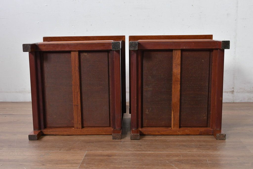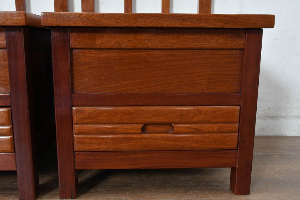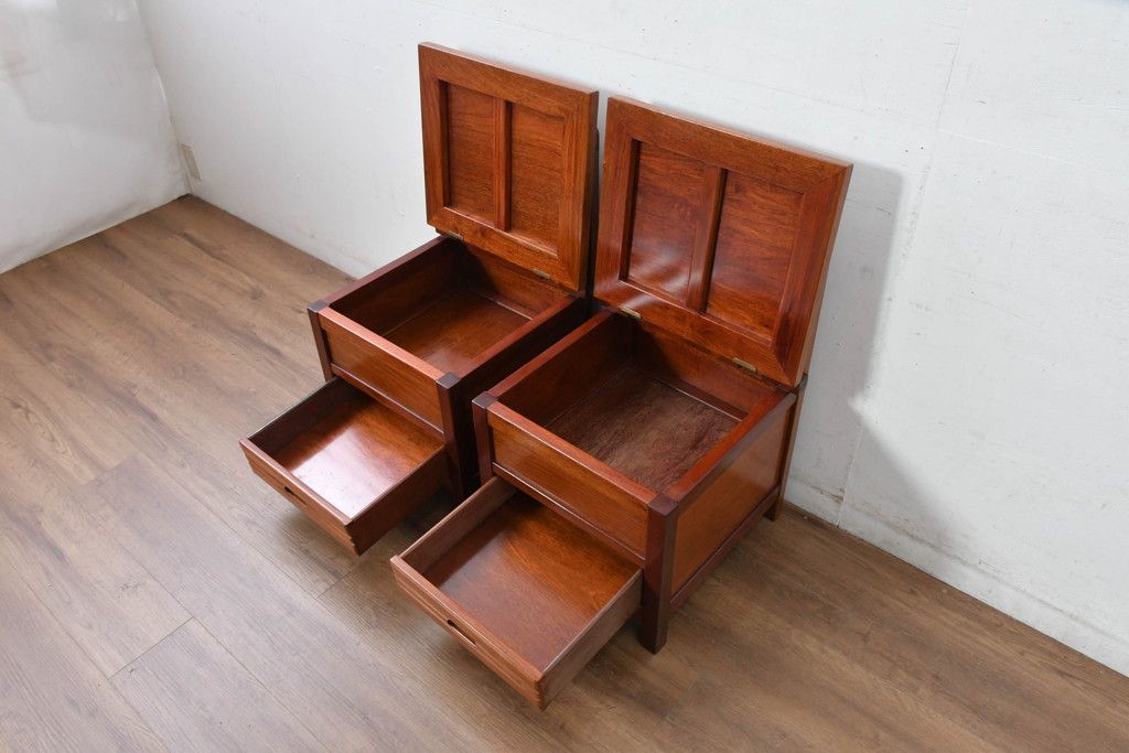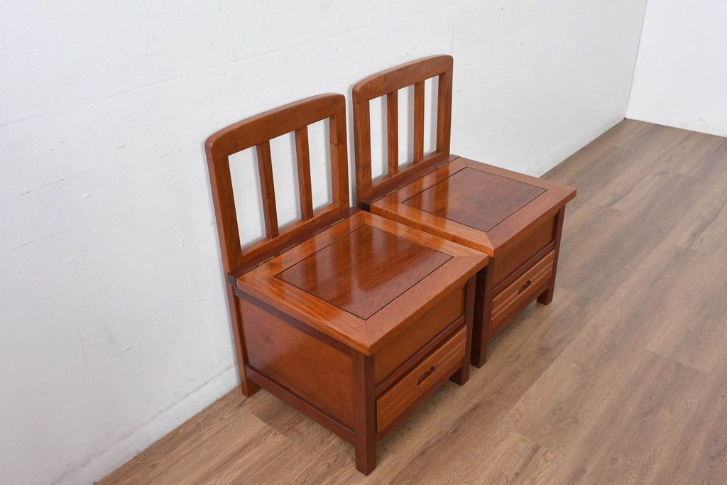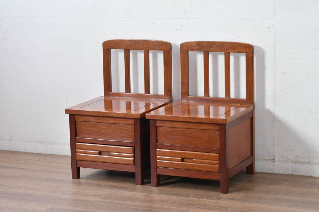 中古 民芸家具 花梨(カリン)材 収納付き囲炉裏チェア2脚セット(椅子、ダイニングチェア、板座チェア)(R-070314)