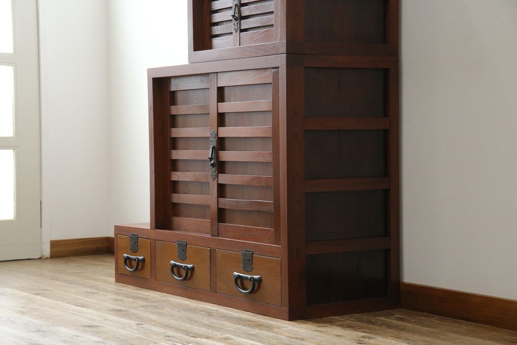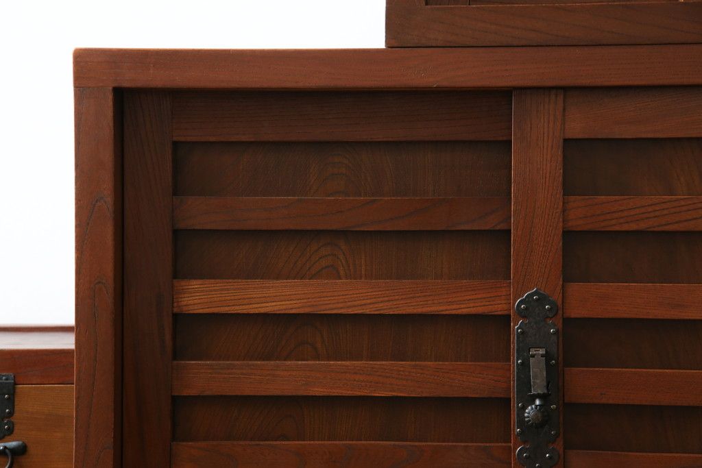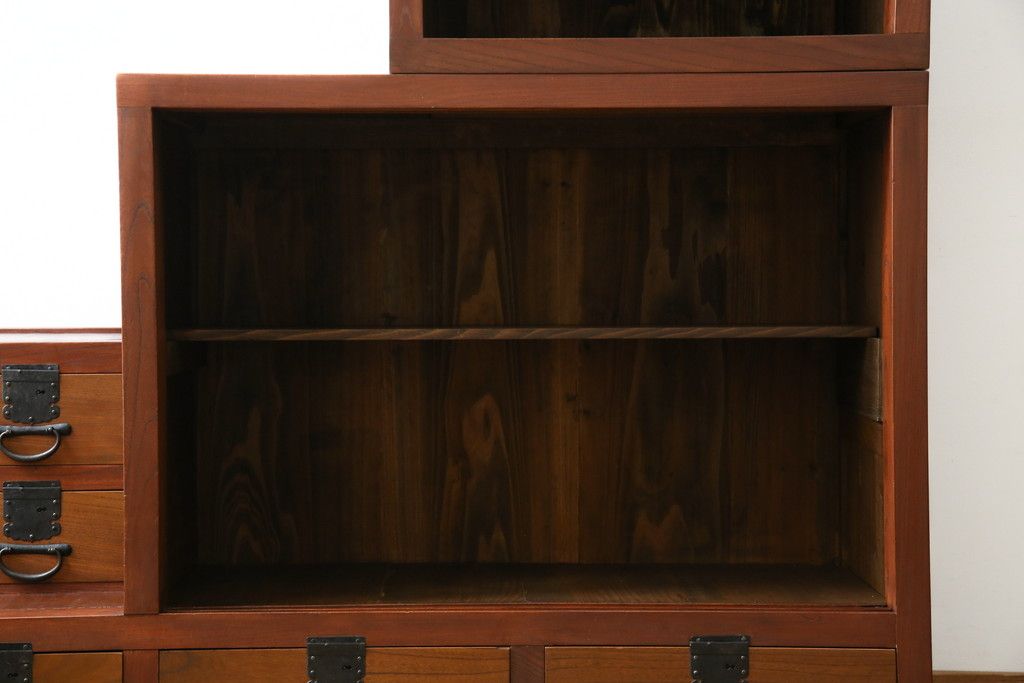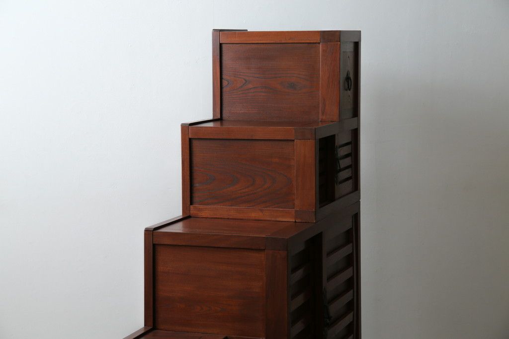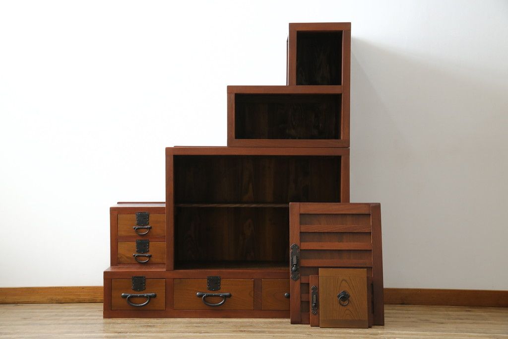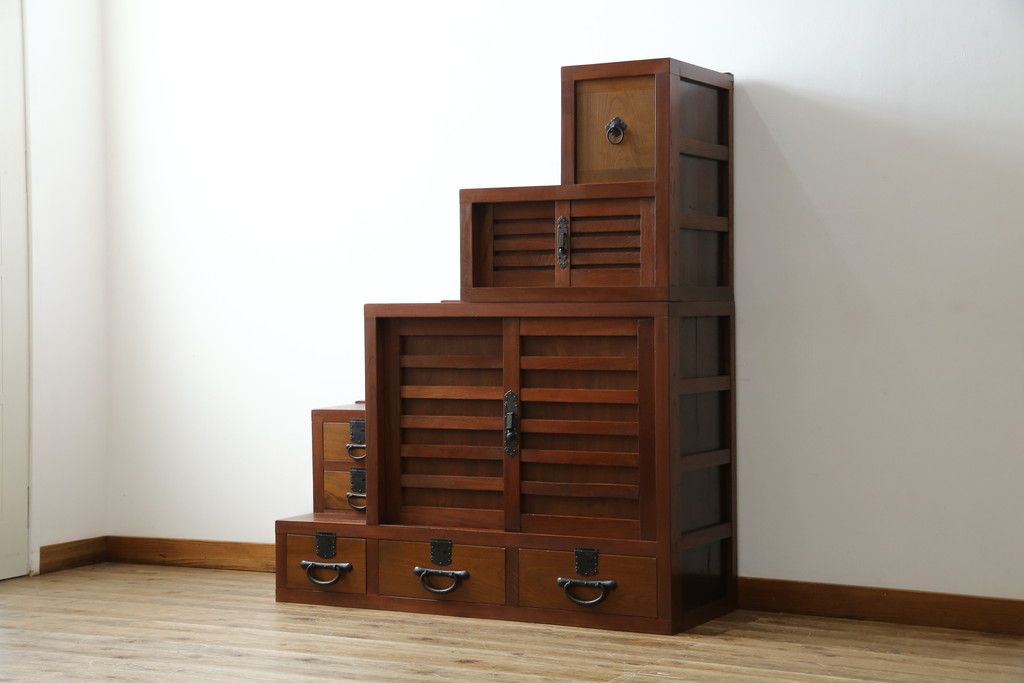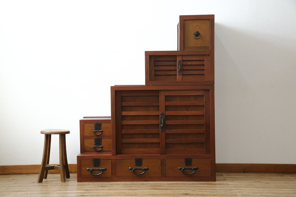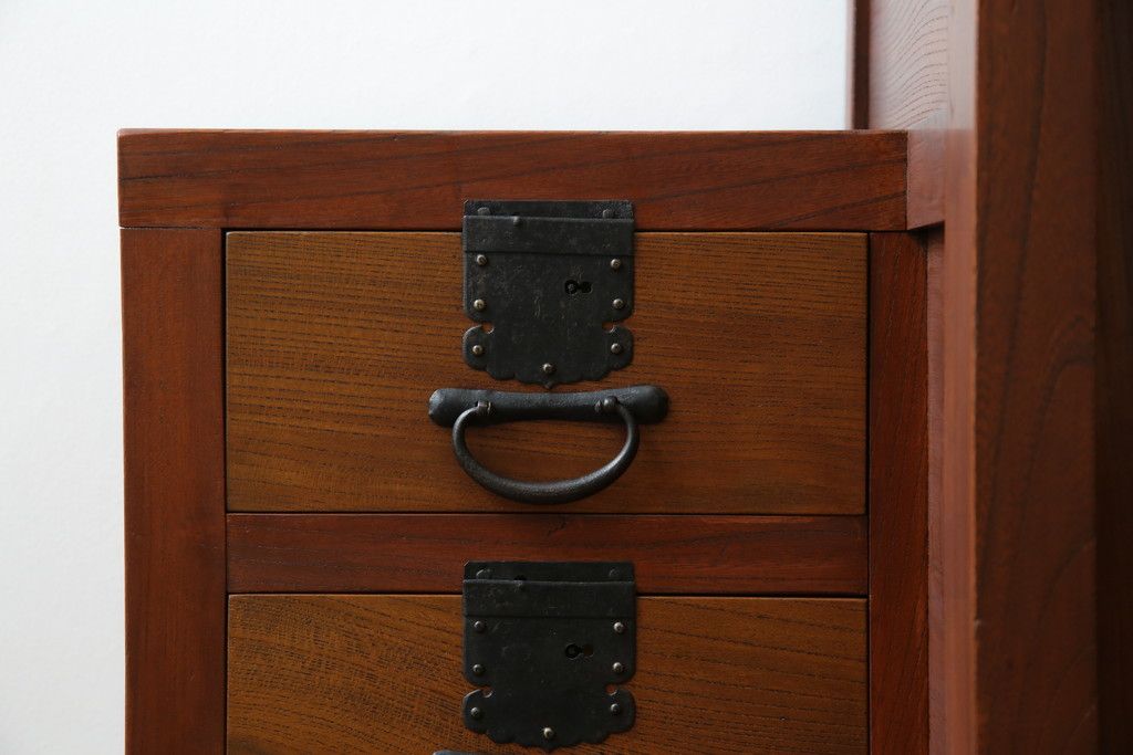 ラフジュ工房> 和箪笥 > 和製ビンテージ 高級工芸家具 総欅(ケヤキ)材 古金具リメイク 職人手作り 小振りな階段箪笥(階段タンス、収納たんす、和箪笥、時代箪笥、引き出し、ヴィンテージ)(R-070433)