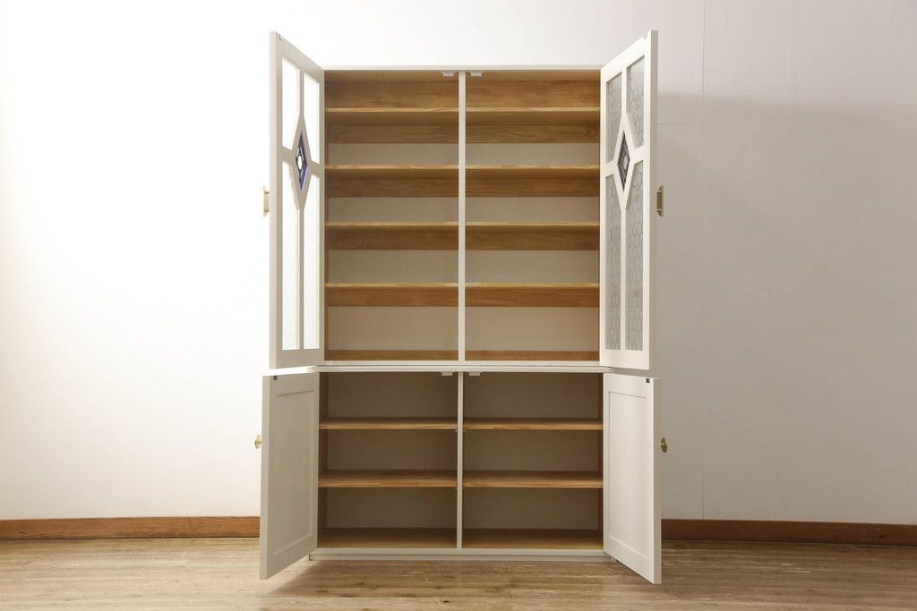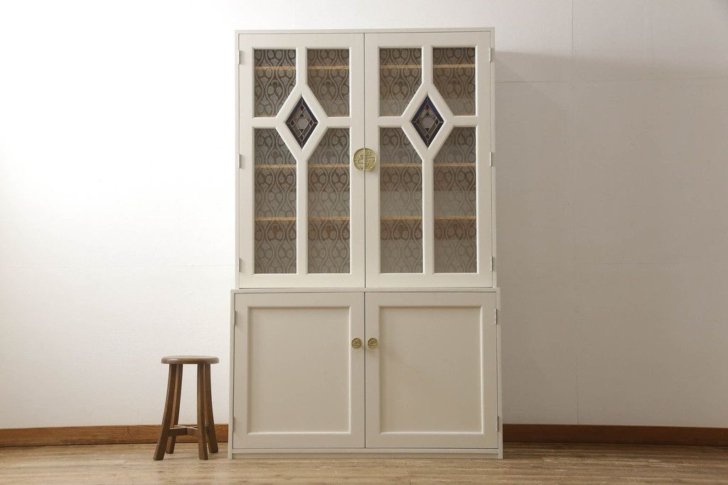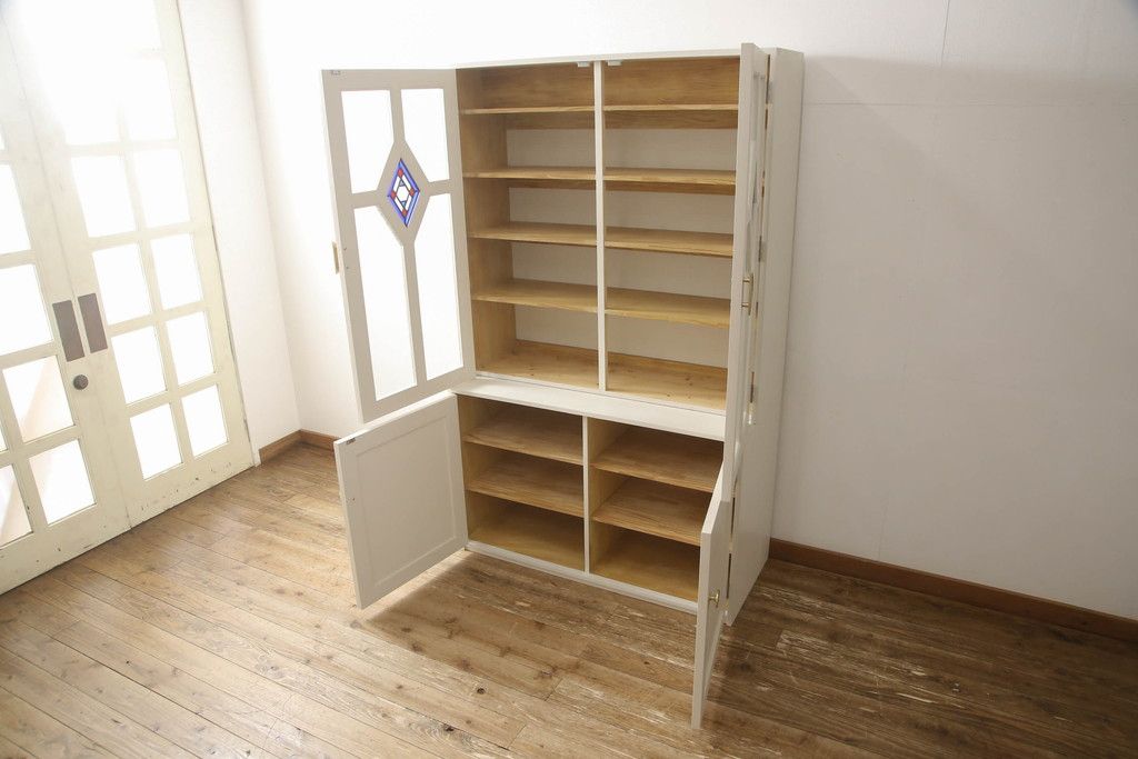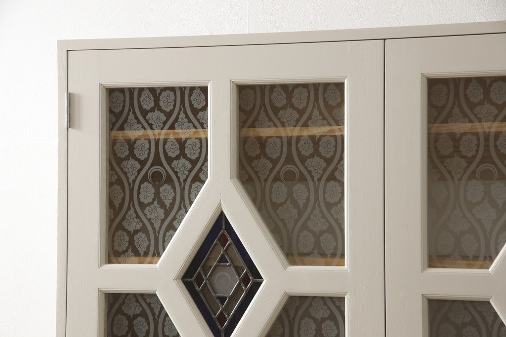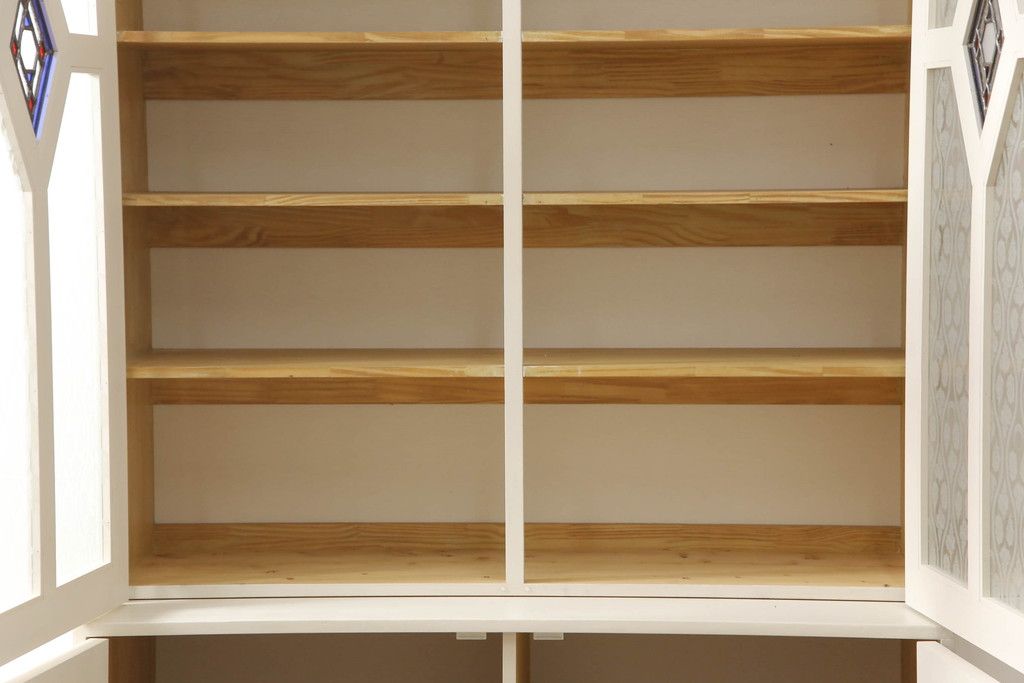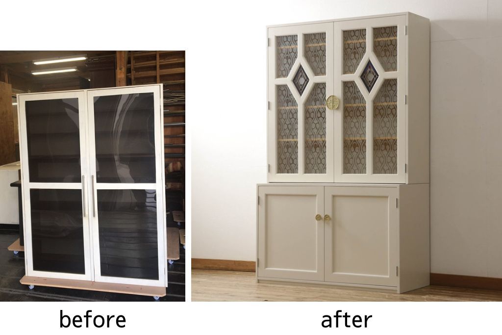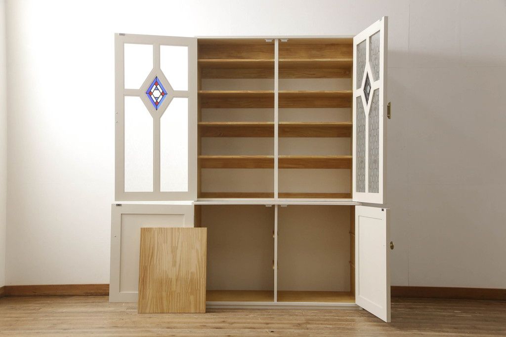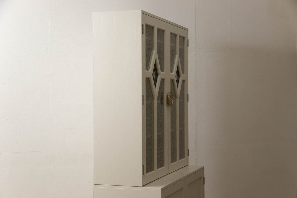 食器棚を使いやすくリメイク!高さをリサイズし、天板を取り付け。上段のデザイン扉、建具に合わせたステンドグラス、下段の板戸は新たに制作。取っ手を取り付けて、アンティークホワイトにペイント仕上げ。