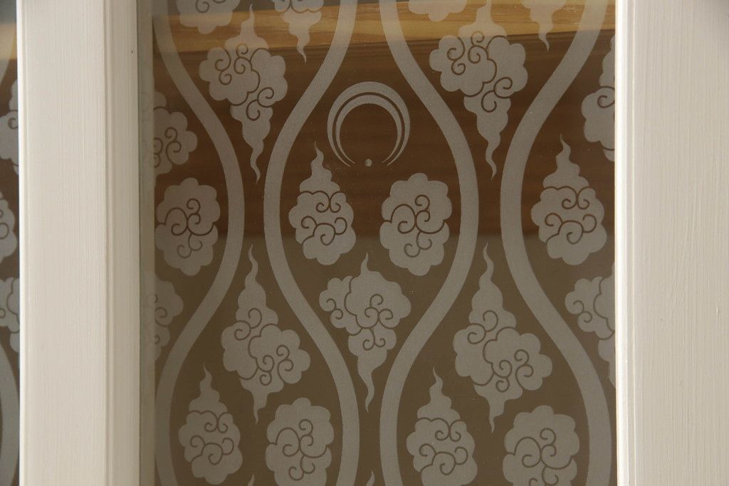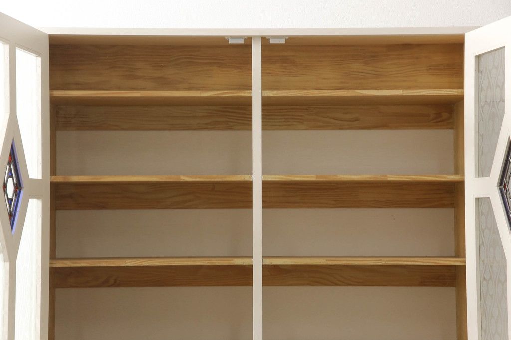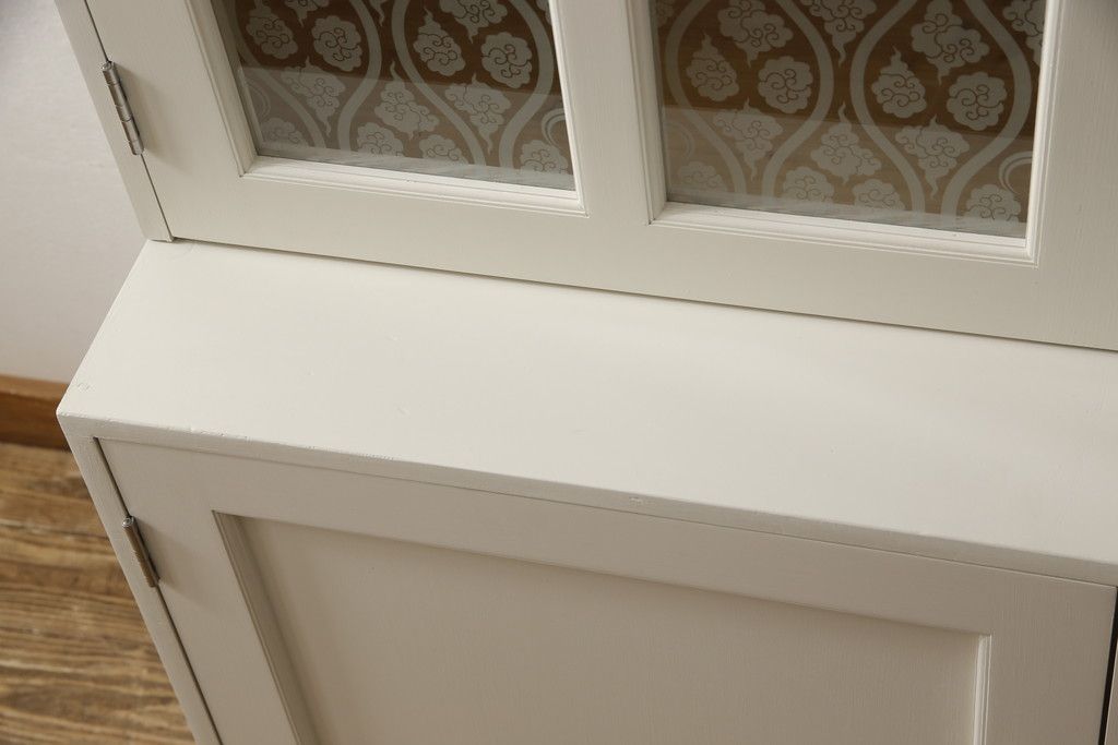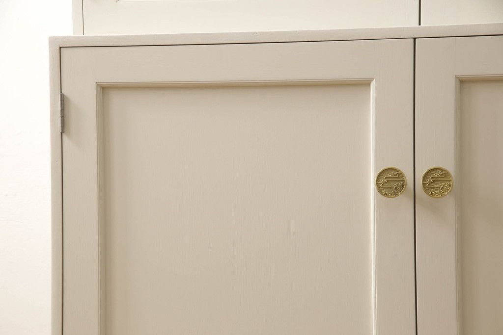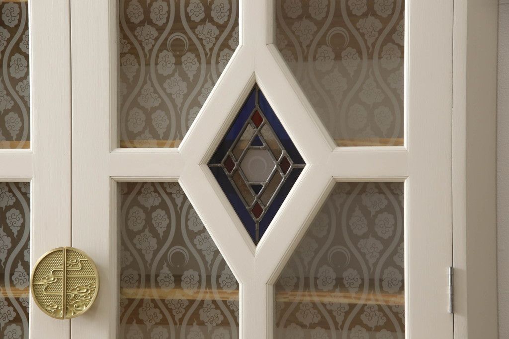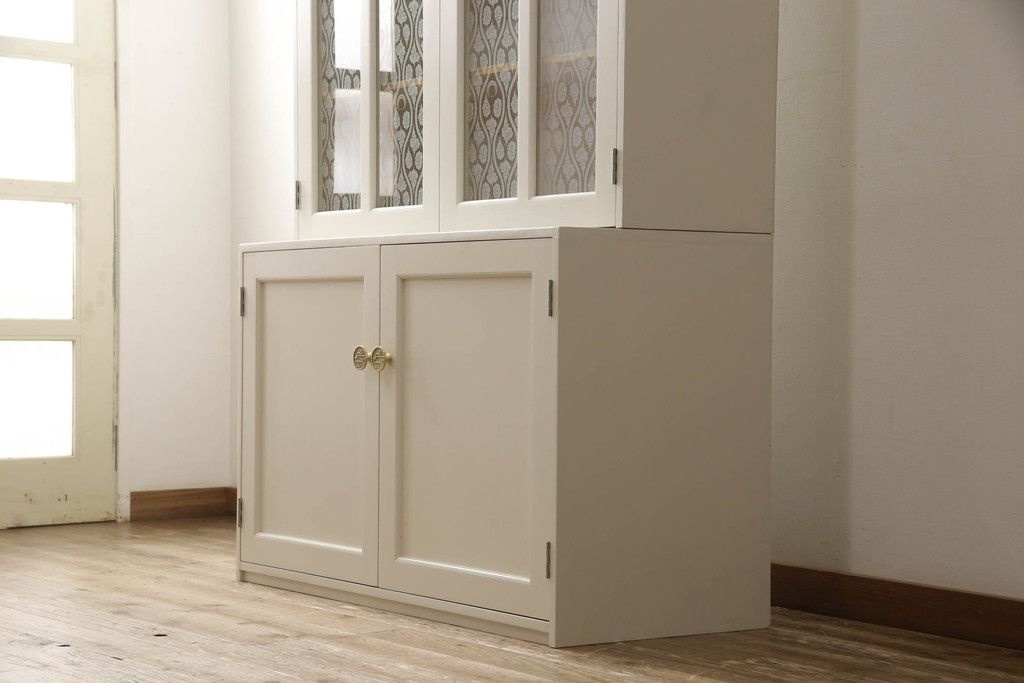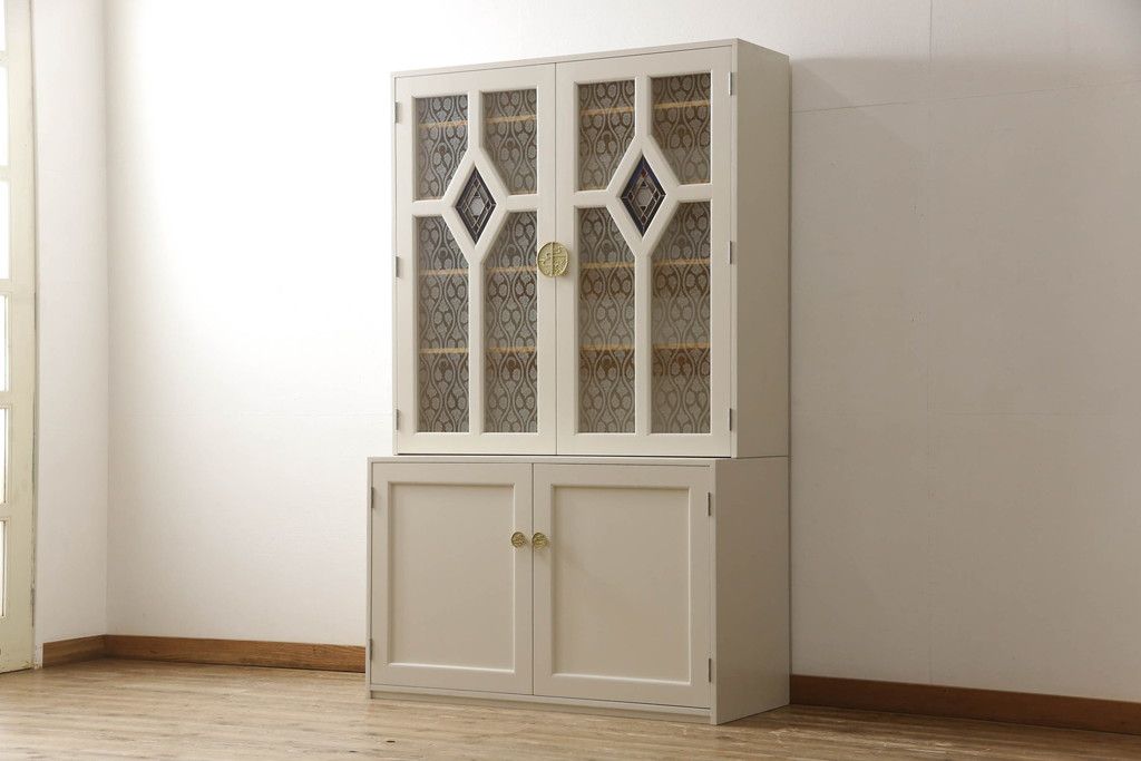 食器棚を使いやすくリメイク!高さをリサイズし、天板を取り付け。上段のデザイン扉、建具に合わせたステンドグラス、下段の板戸は新たに制作。取っ手を取り付けて、アンティークホワイトにペイント仕上げ。