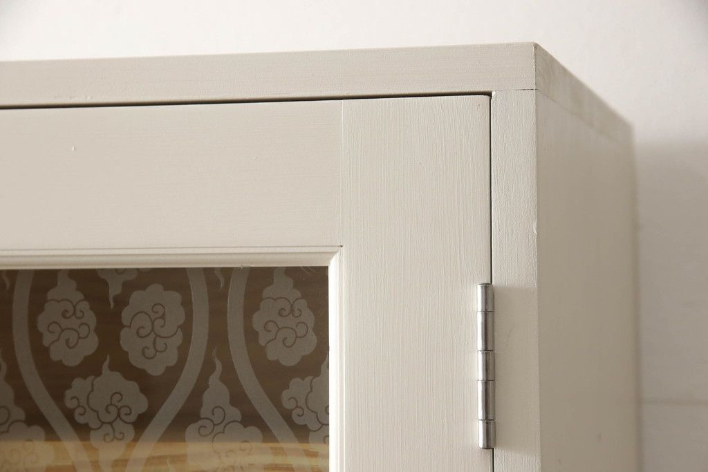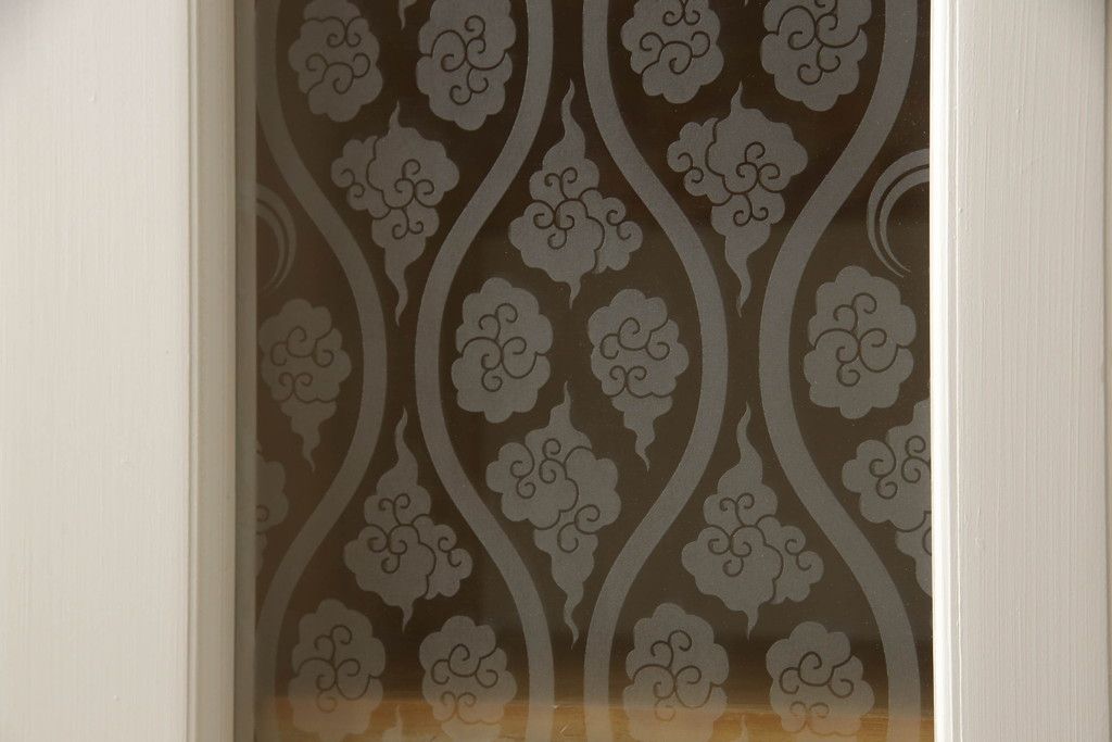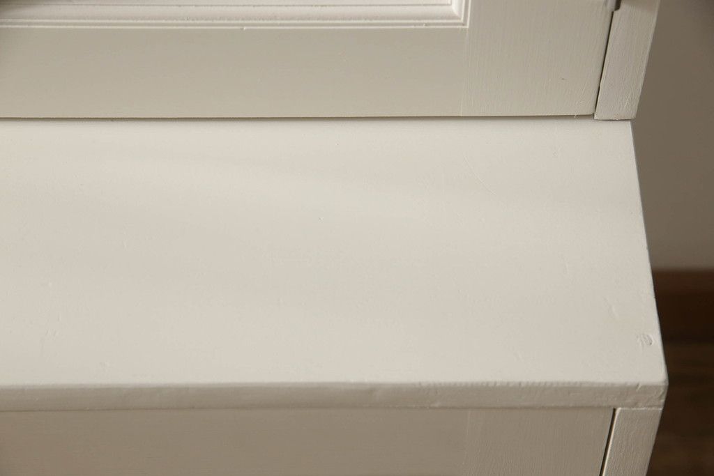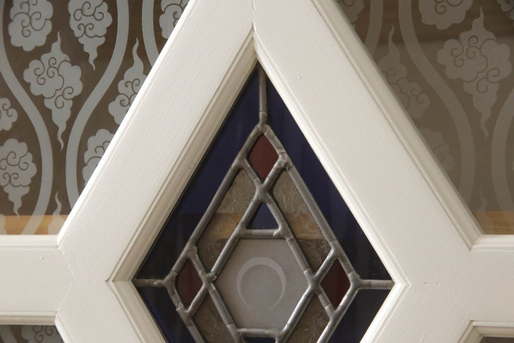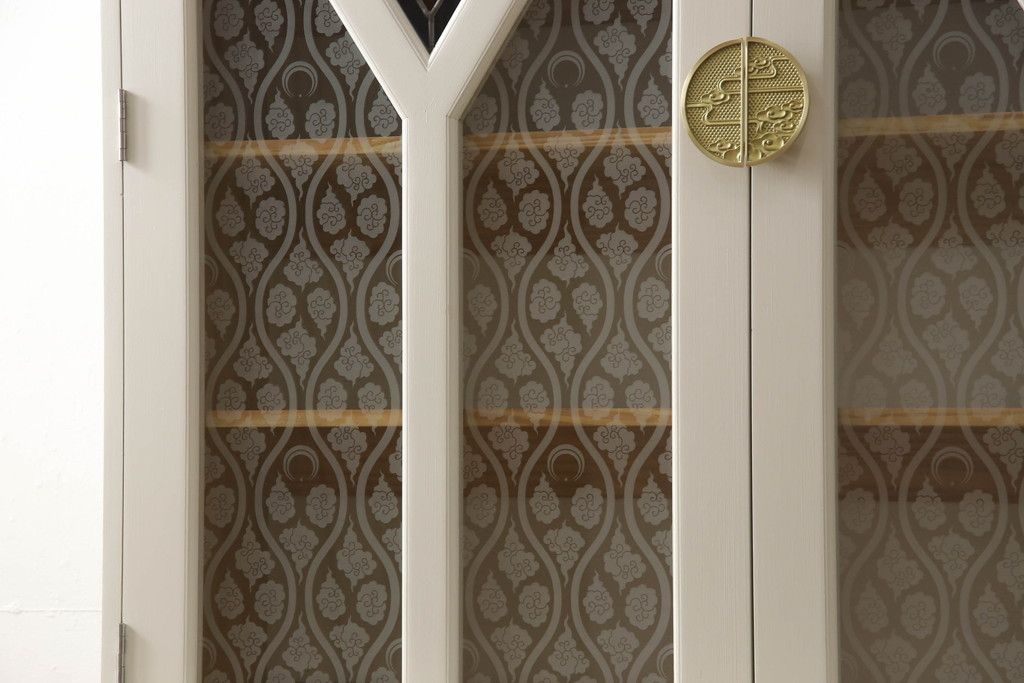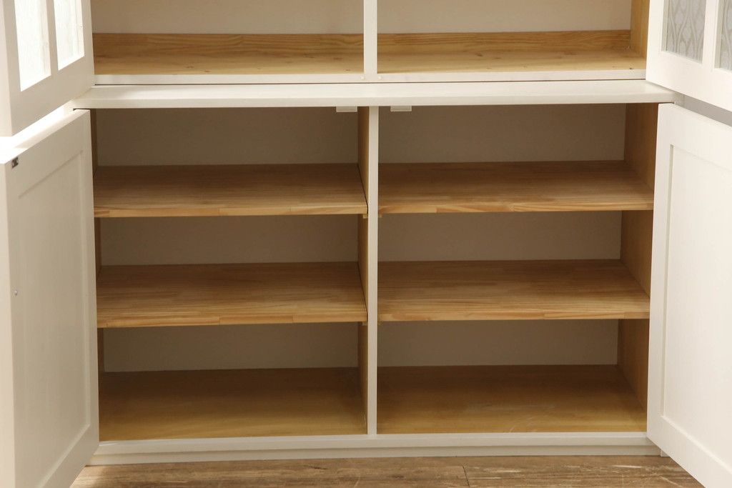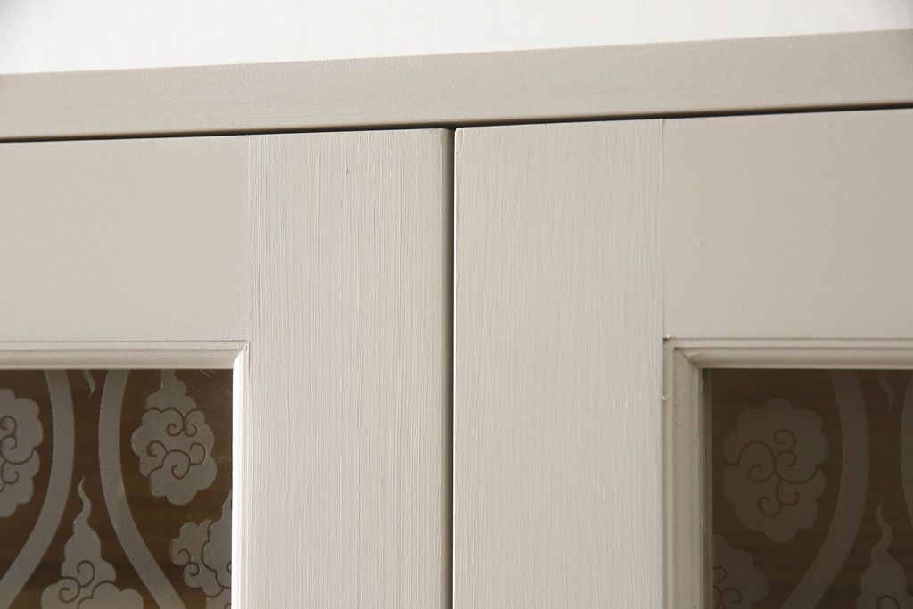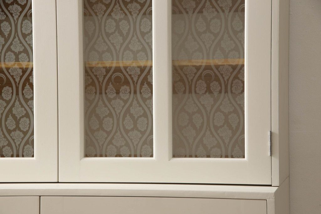 食器棚を使いやすくリメイク!高さをリサイズし、天板を取り付け。上段のデザイン扉、建具に合わせたステンドグラス、下段の板戸は新たに制作。取っ手を取り付けて、アンティークホワイトにペイント仕上げ。