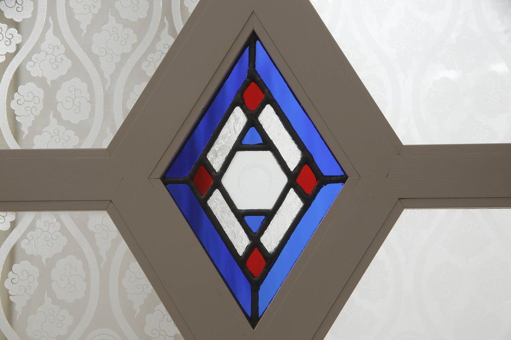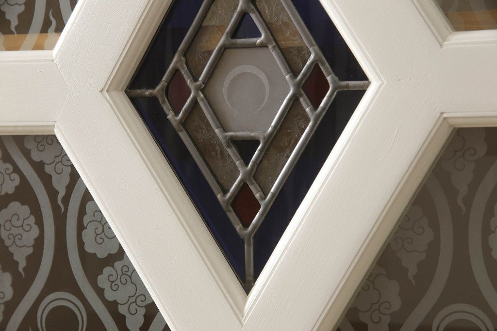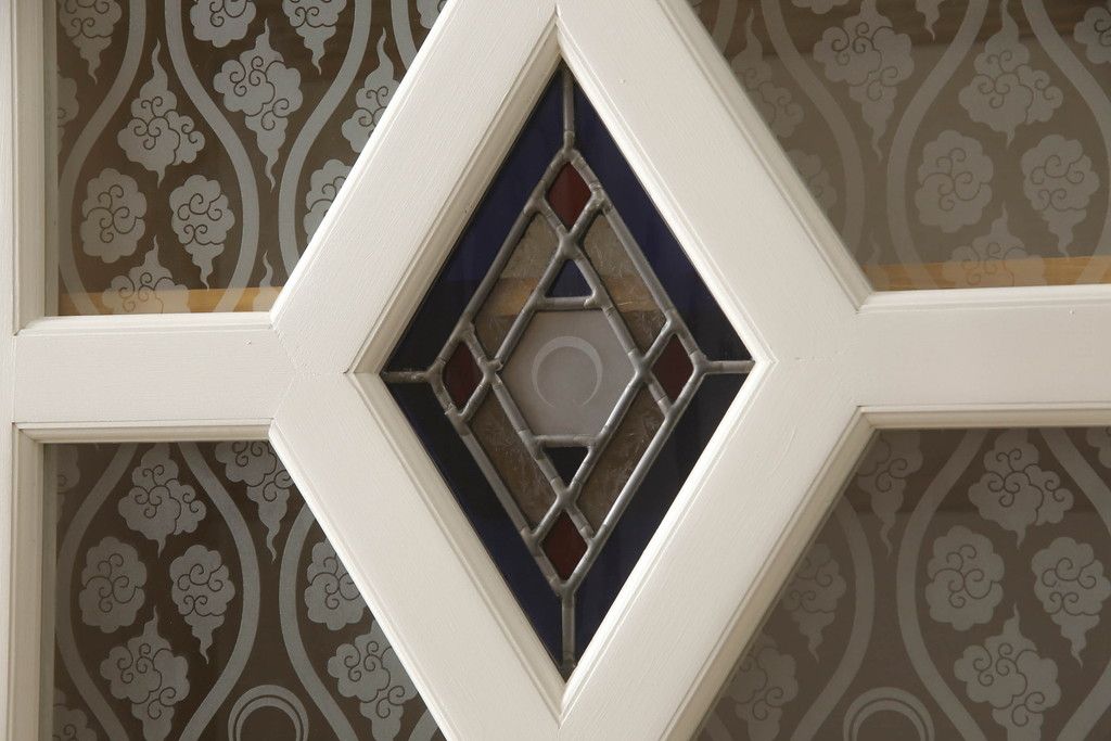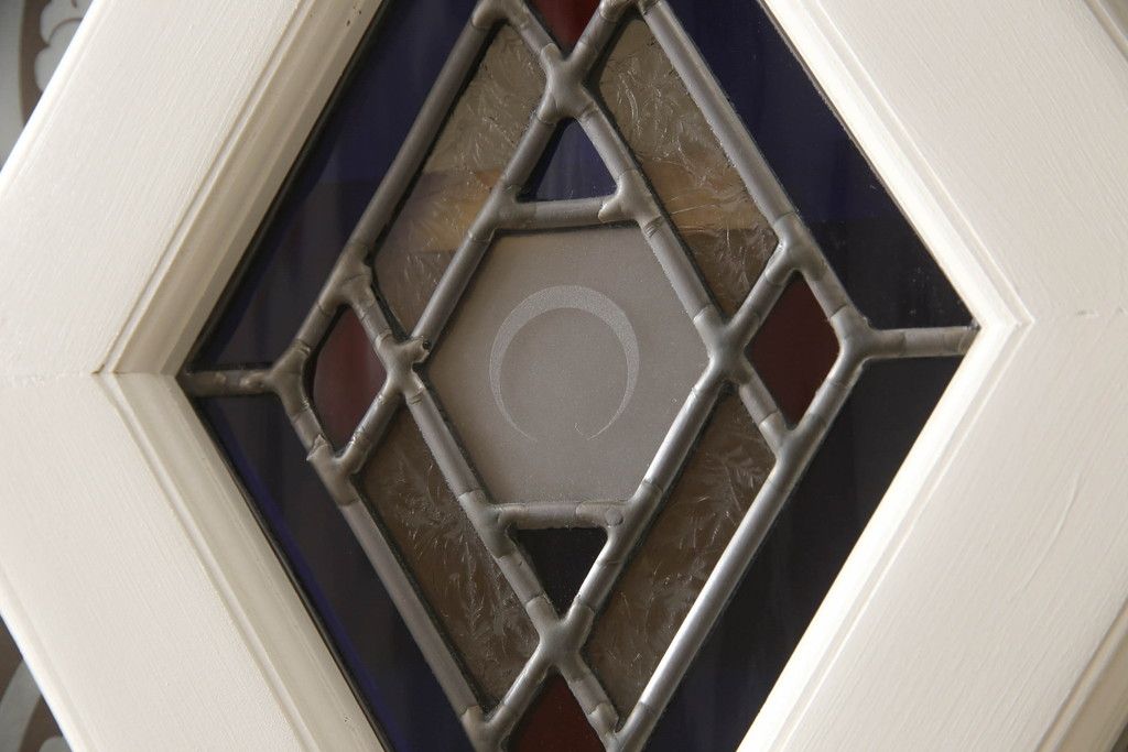 お手持ちの家具・建具リメイク実績 > 食器棚を使いやすくリメイク!高さをリサイズし、天板を取り付け。上段のデザイン扉、建具に合わせたステンドグラス、下段の板戸は新たに制作。取っ手を取り付けて、アンティークホワイトにペイント仕上げ。
