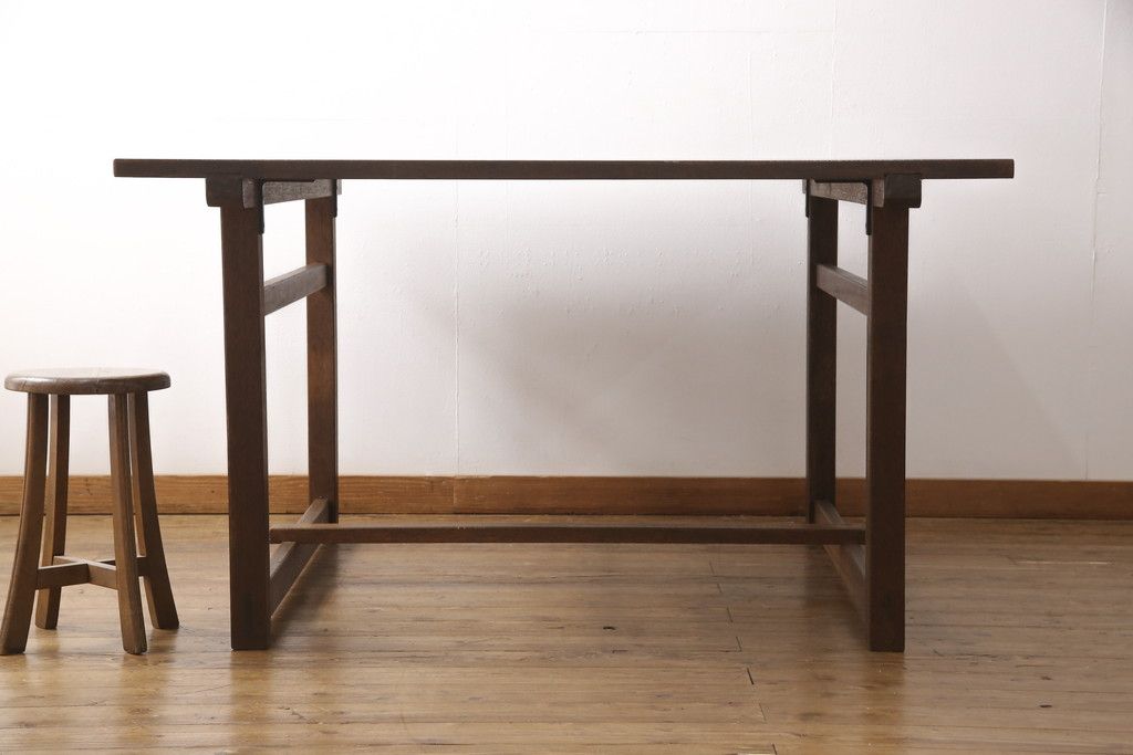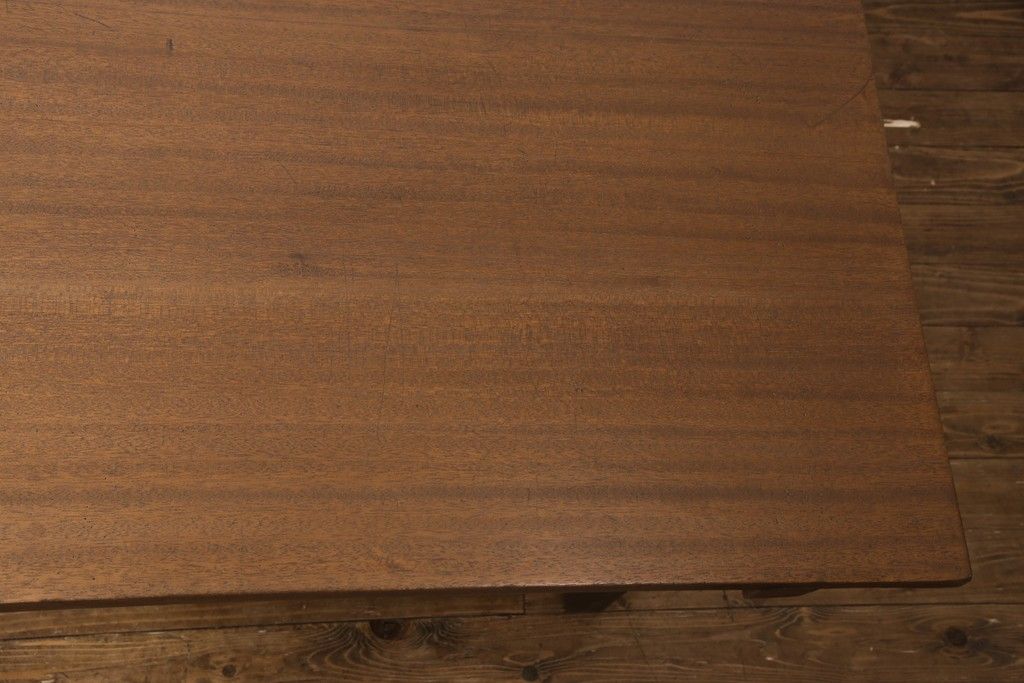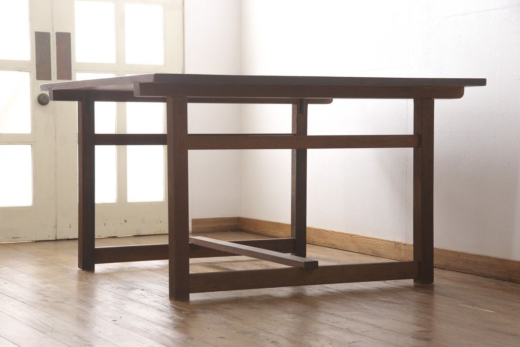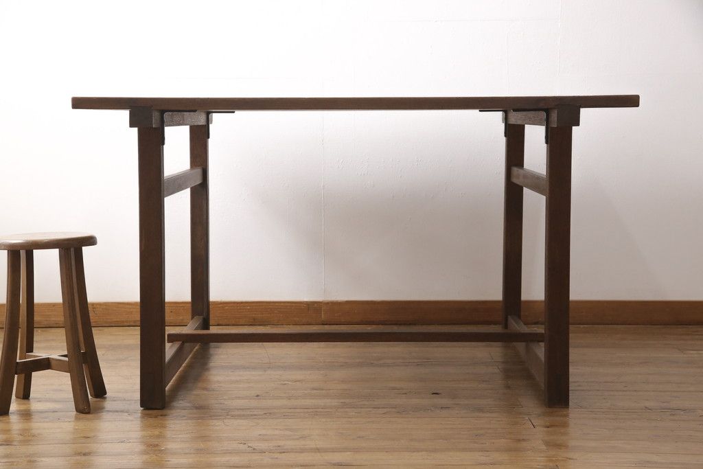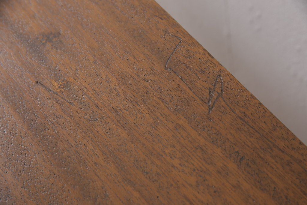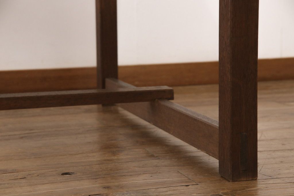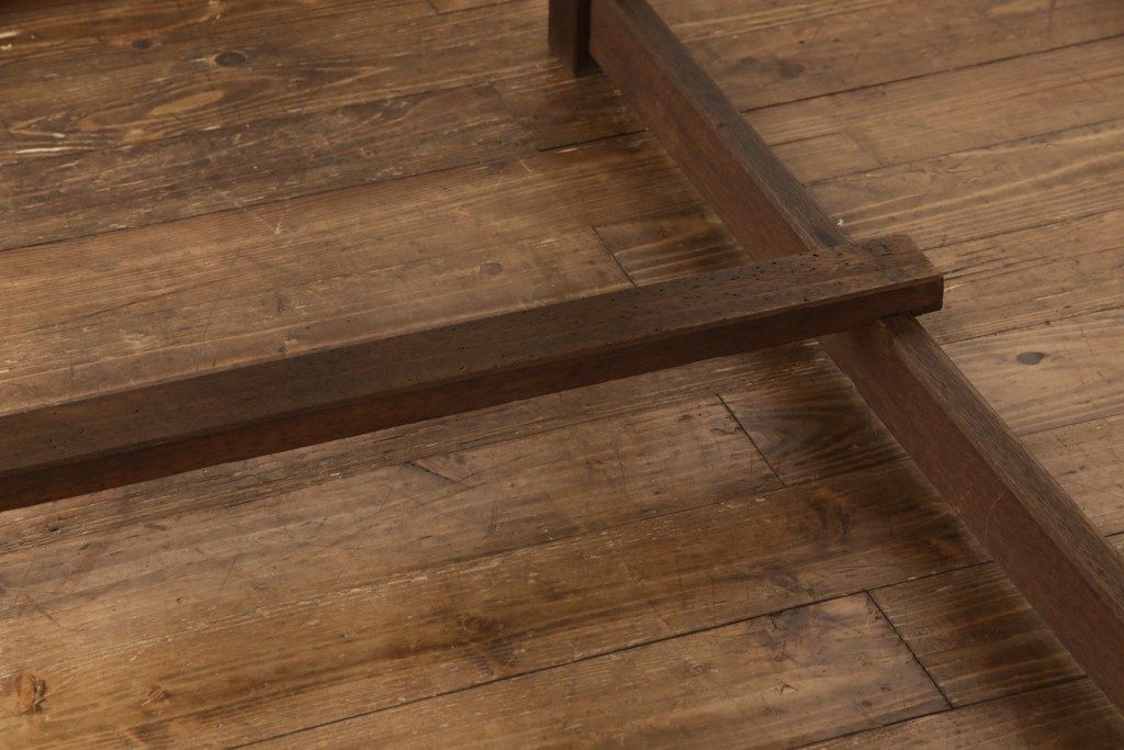 テーブル> 4人用ダイニングテーブル > 和製アンティークの棚付き作業台をリペア&カスタム!天板下の棚を取り外し。色の濃い部分に合わせて全体を着色し仕上げ。(ダイニングテーブル)