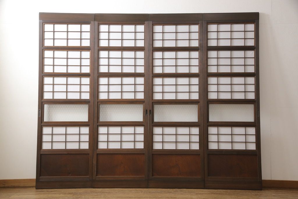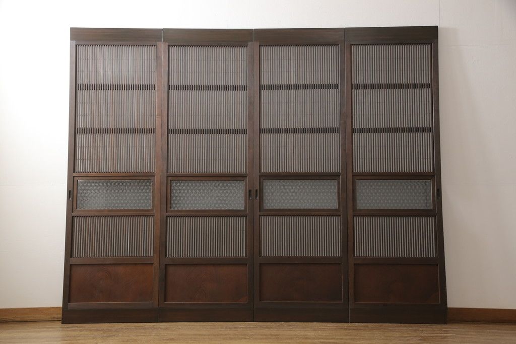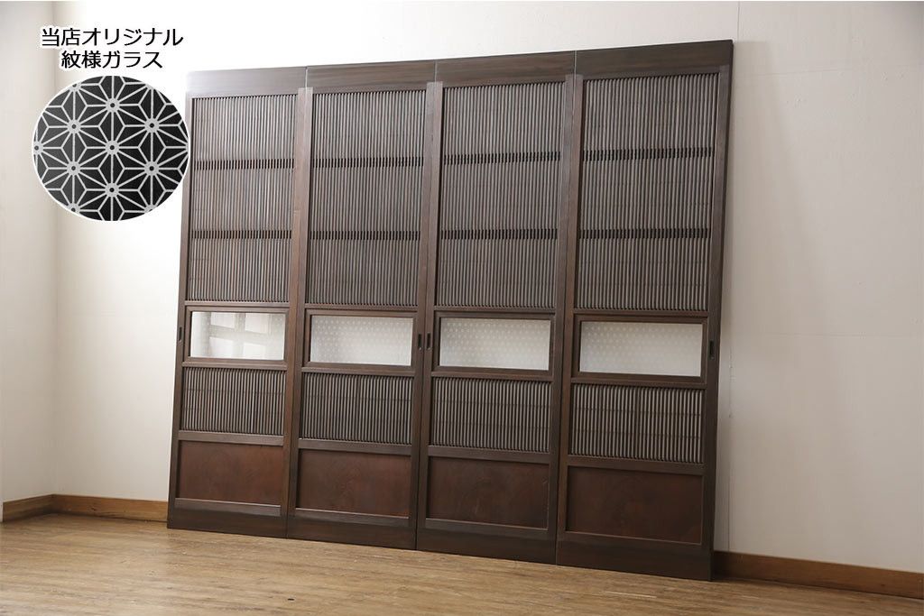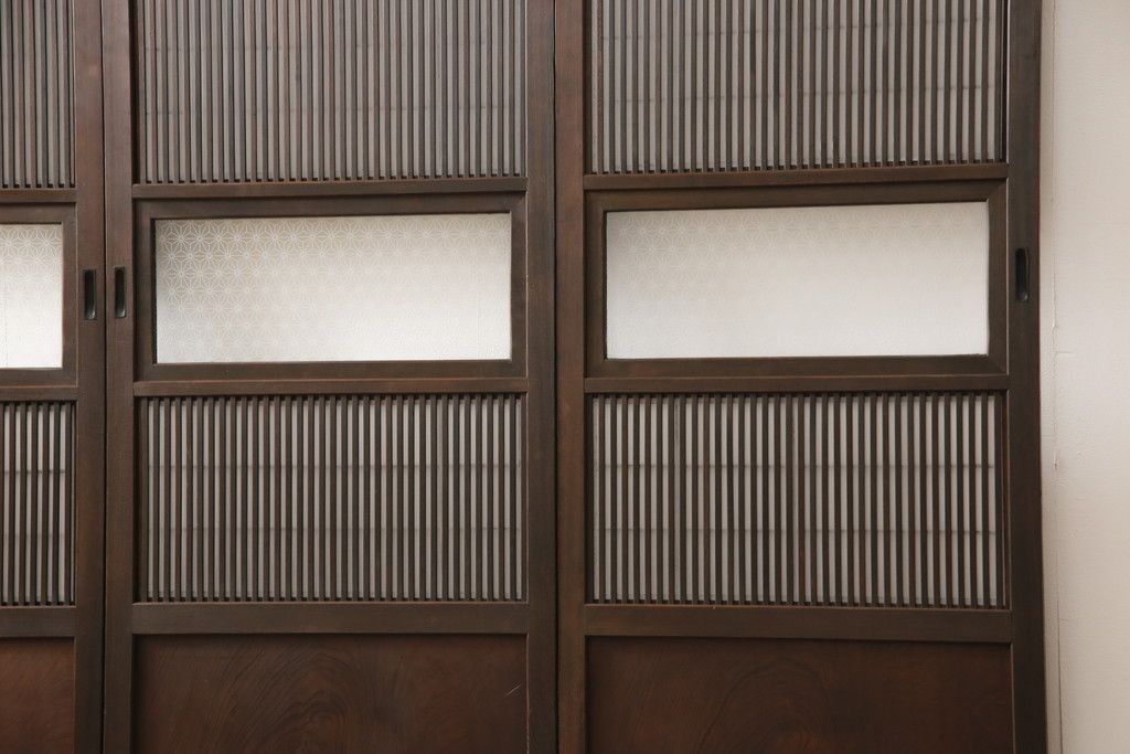ドア・建具> 引き戸 > 格子戸4枚セットをリペア&カスタム!リサイズし、新たに引手を取り付け。ガラスは麻の葉模様のガラスに交換。自然な茶色に着色仕上げ。(障子戸、引き戸、建具)