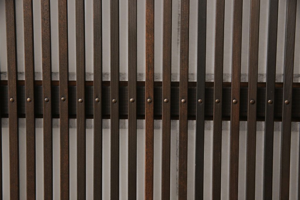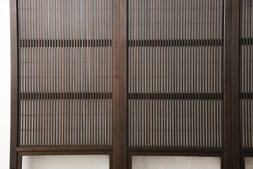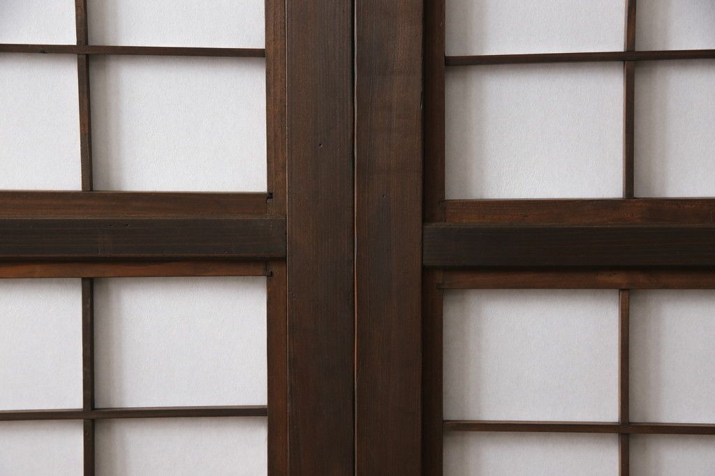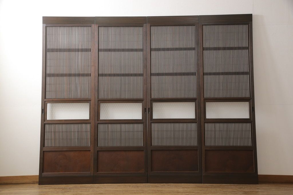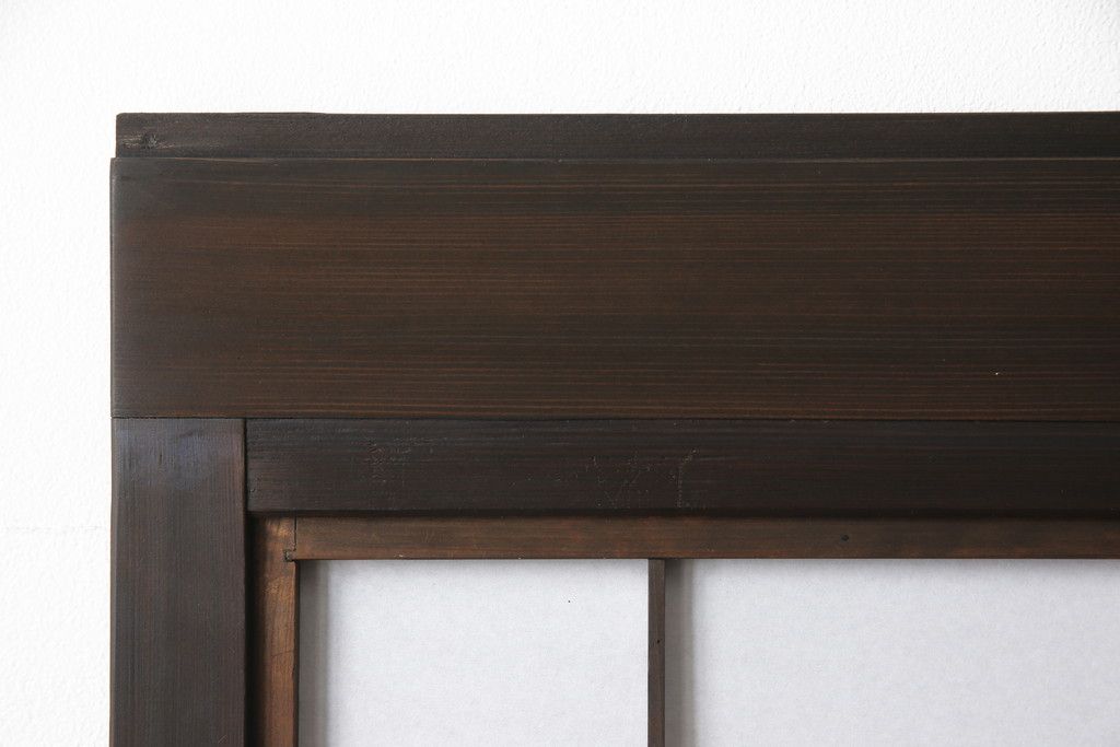 ドア・建具> 引き戸 > 格子戸4枚セットをリペア&カスタム!リサイズし、新たに引手を取り付け。ガラスは麻の葉模様のガラスに交換。自然な茶色に着色仕上げ。(障子戸、引き戸、建具)