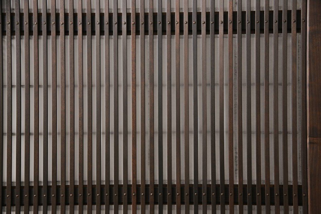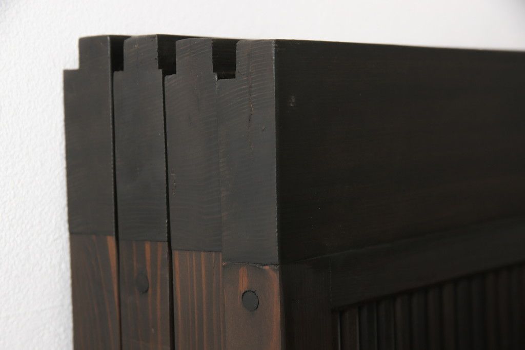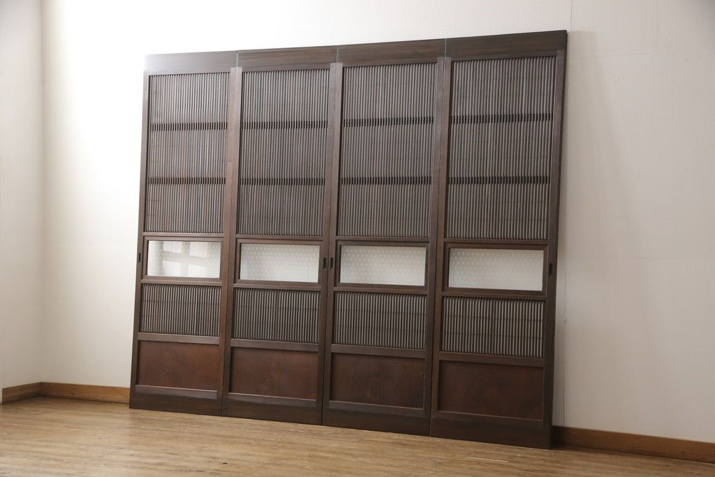 ドア・建具> 格子戸 > 格子戸4枚セットをリペア&カスタム!リサイズし、新たに引手を取り付け。ガラスは麻の葉模様のガラスに交換。自然な茶色に着色仕上げ。(障子戸、引き戸、建具)