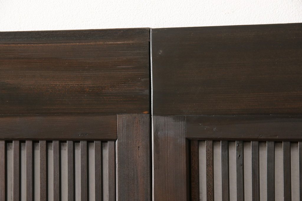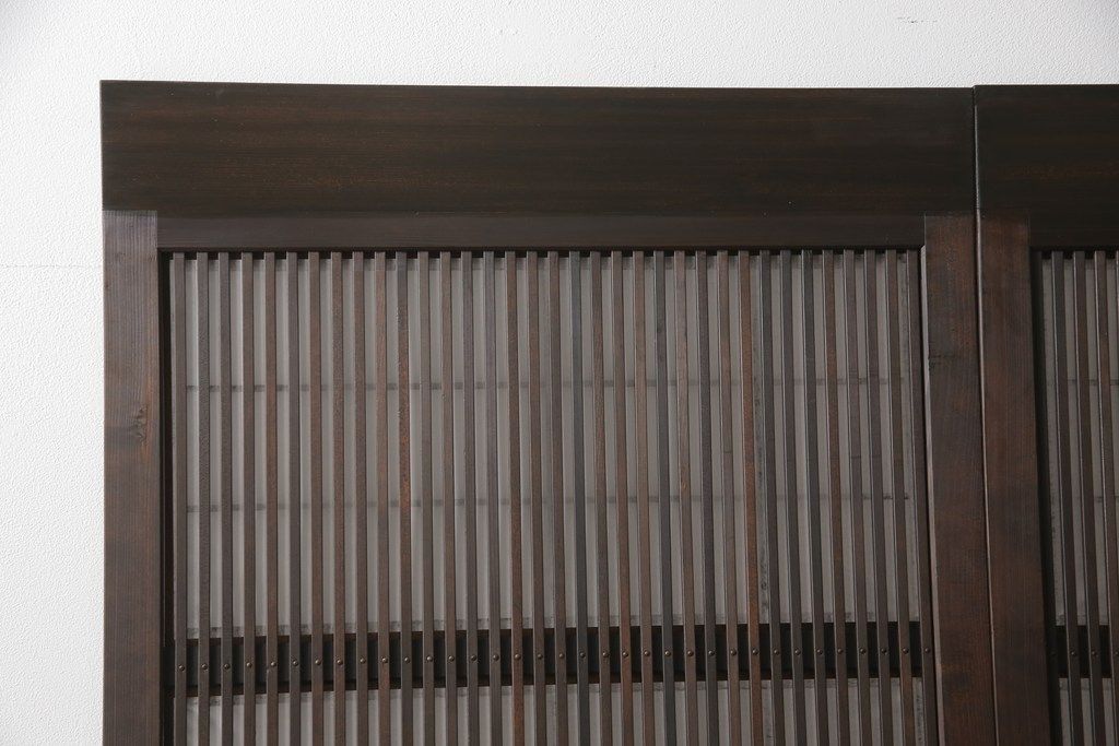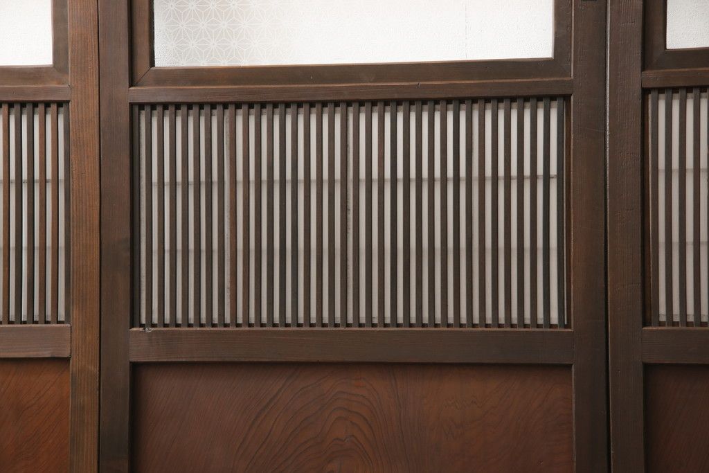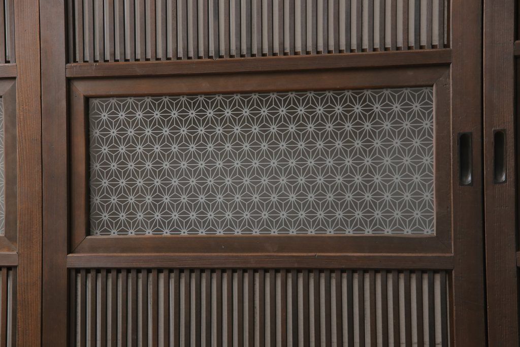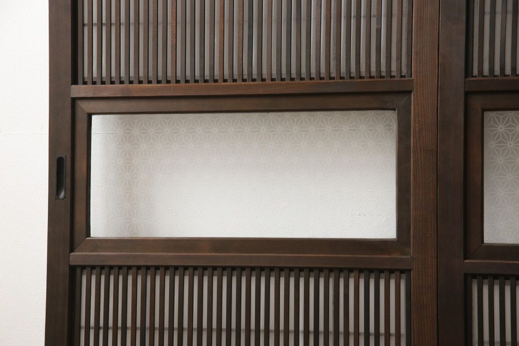 ドア・建具> 4枚〜セット > 格子戸4枚セットをリペア&カスタム!リサイズし、新たに引手を取り付け。ガラスは麻の葉模様のガラスに交換。自然な茶色に着色仕上げ。(障子戸、引き戸、建具)