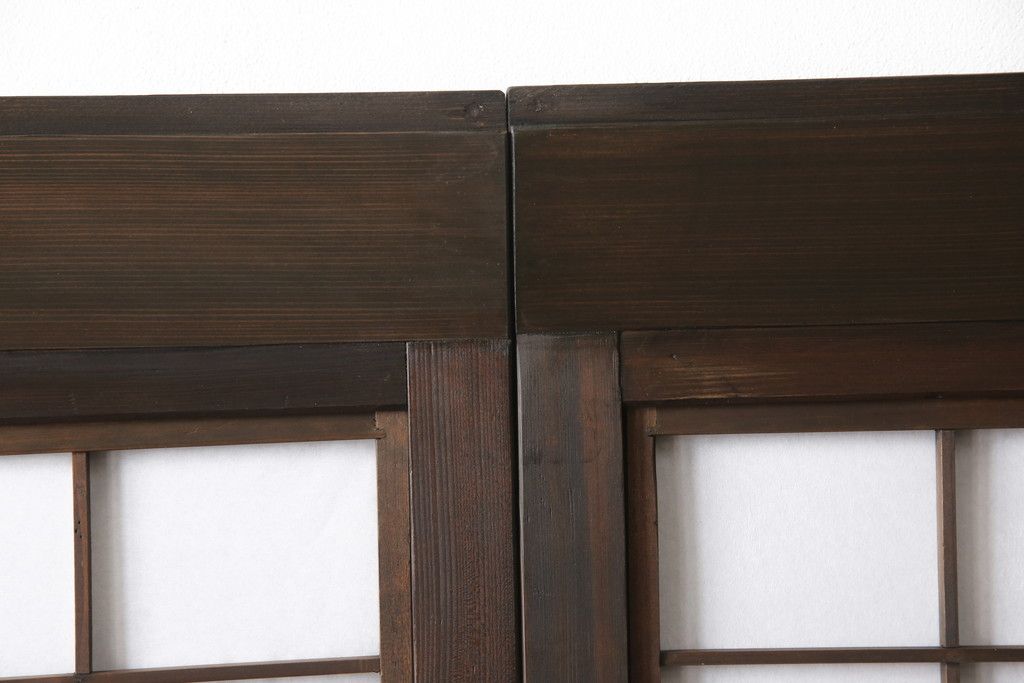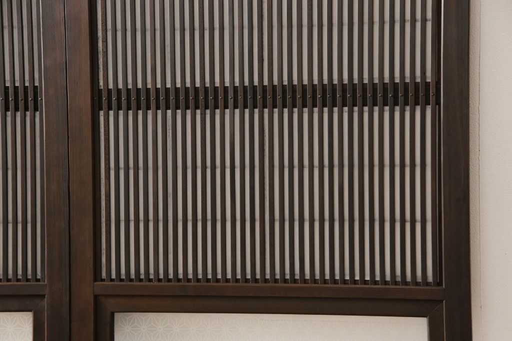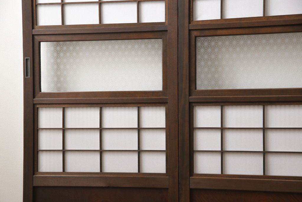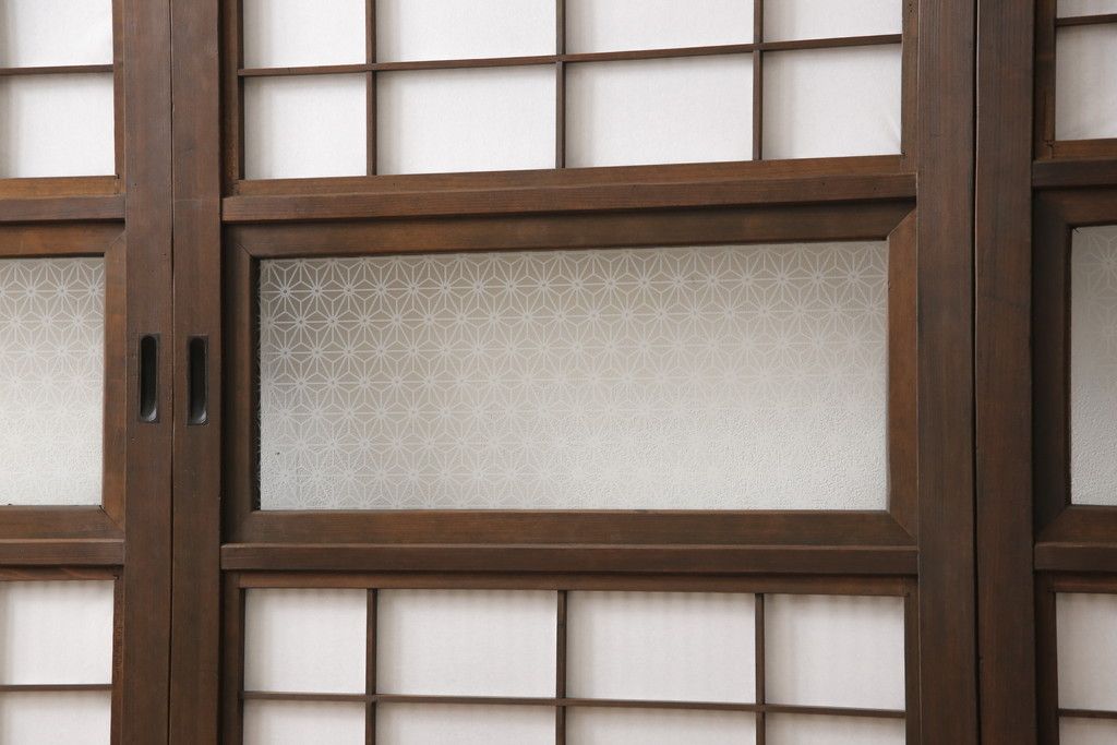 セミオーダー家具実績 > 格子戸4枚セットをリペア&カスタム!リサイズし、新たに引手を取り付け。ガラスは麻の葉模様のガラスに交換。自然な茶色に着色仕上げ。(障子戸、引き戸、建具)