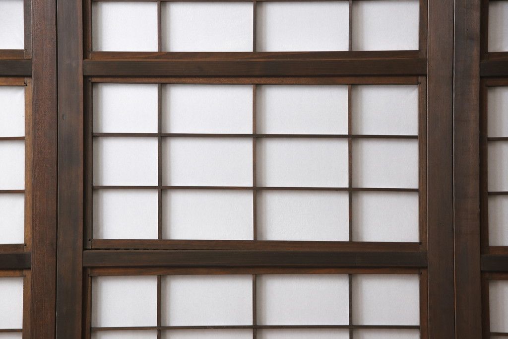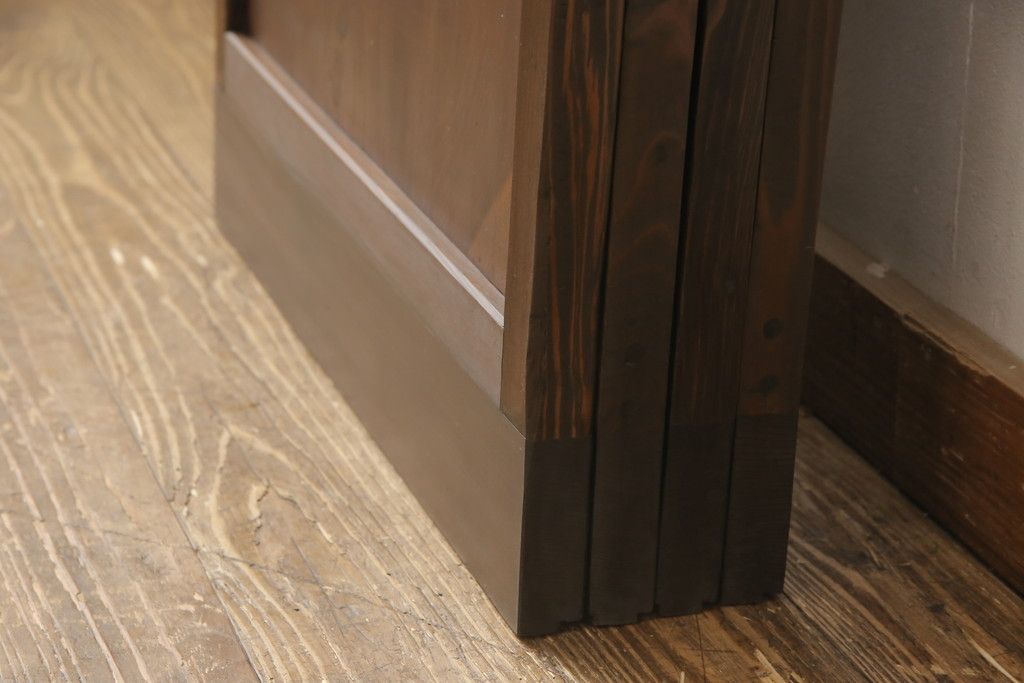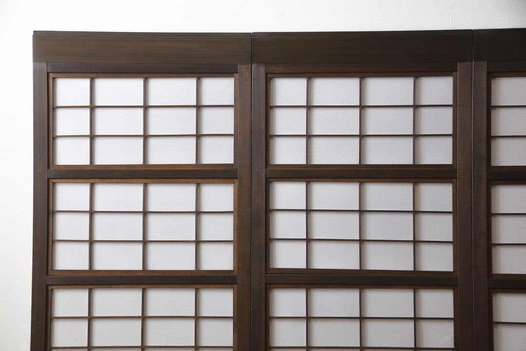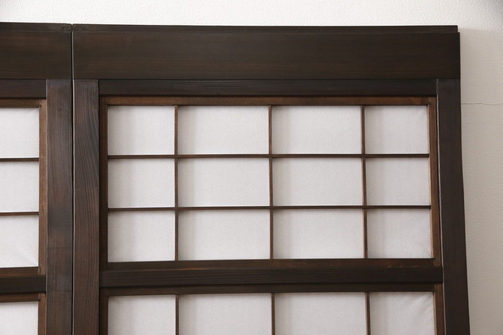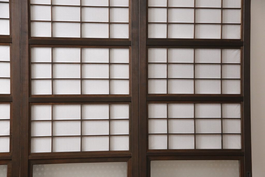 セミオーダー家具実績 > 格子戸4枚セットをリペア&カスタム!リサイズし、新たに引手を取り付け。ガラスは麻の葉模様のガラスに交換。自然な茶色に着色仕上げ。(障子戸、引き戸、建具)