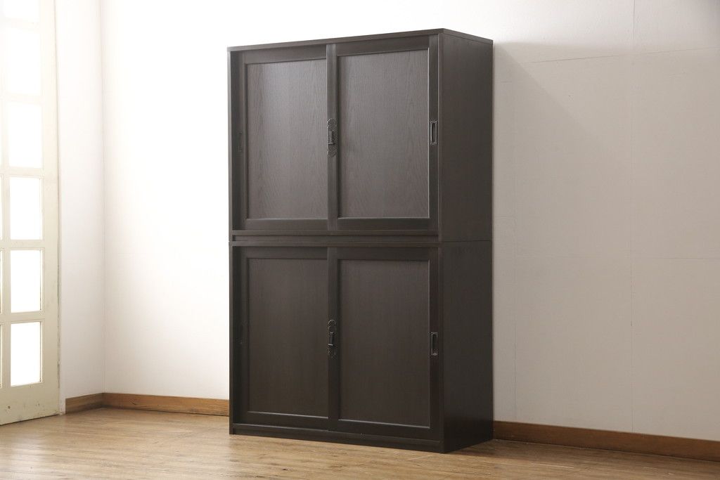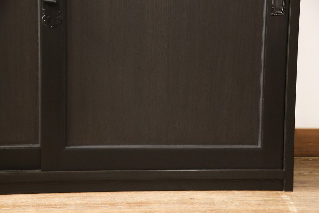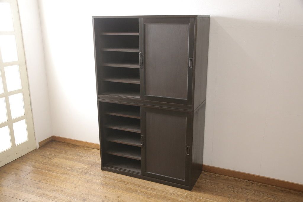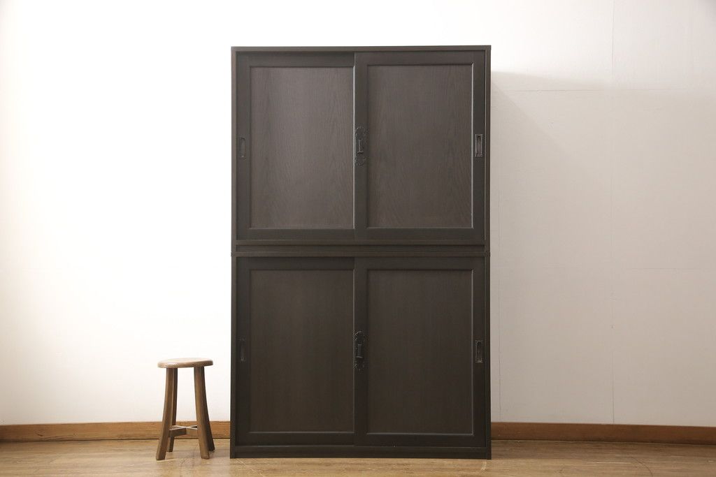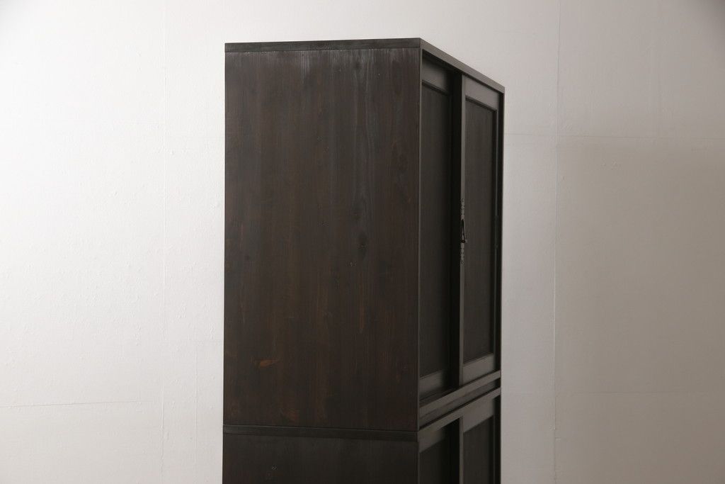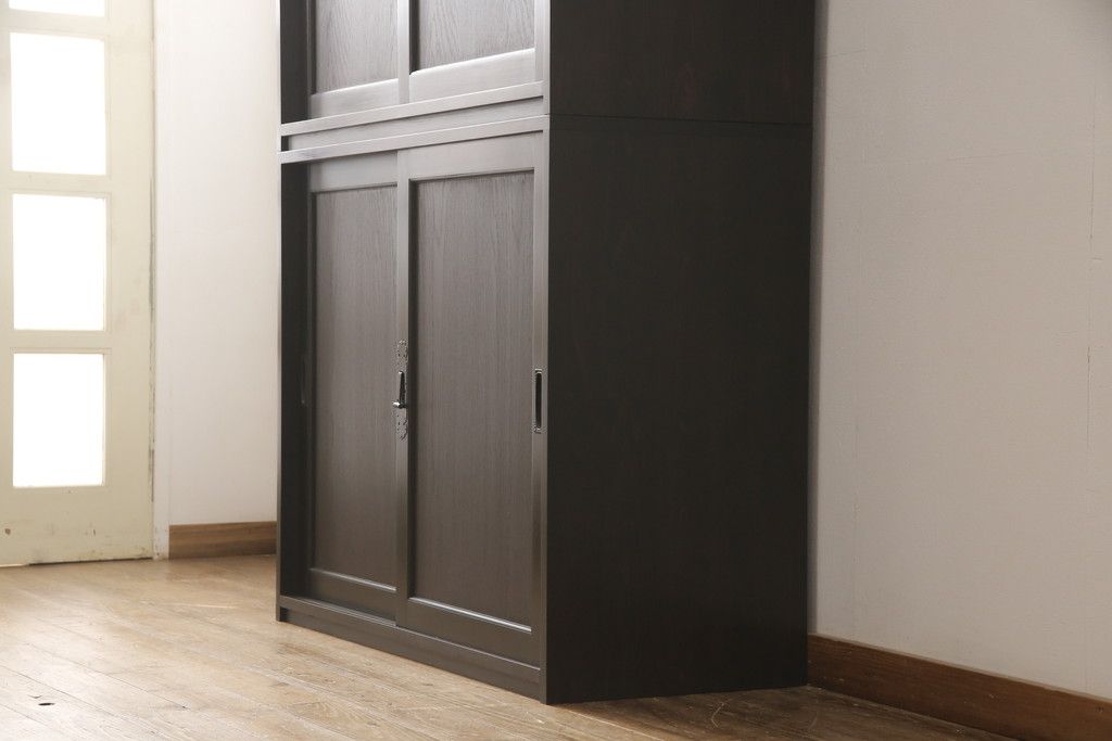 飾り棚を新規製作!上下段ともに棚板4枚を設け、引き違い戸は戸板を製作。取っ手にはアンティーク金具を使用。(キャビネット、食器棚、戸棚、収納棚、重ね戸棚)