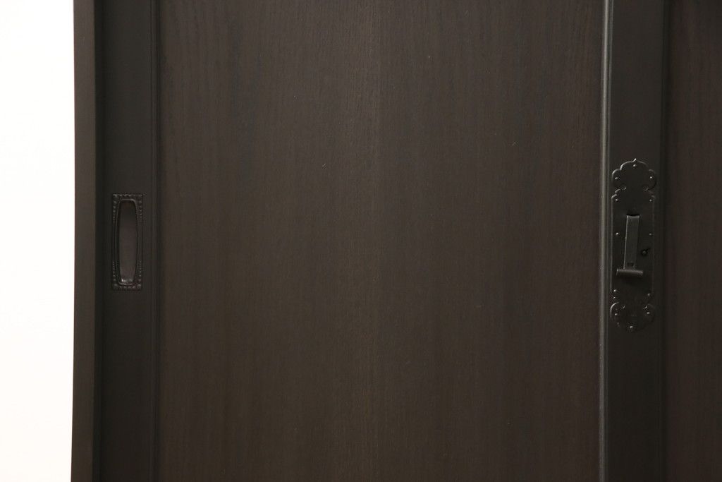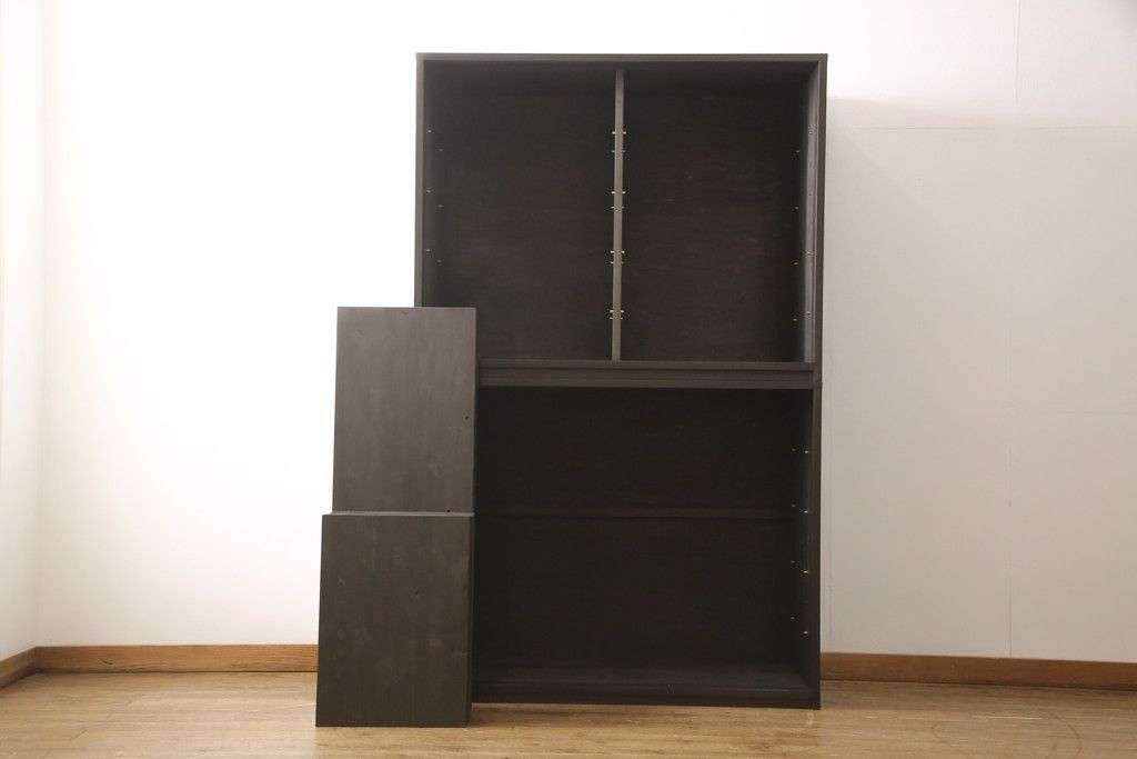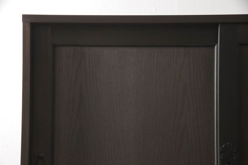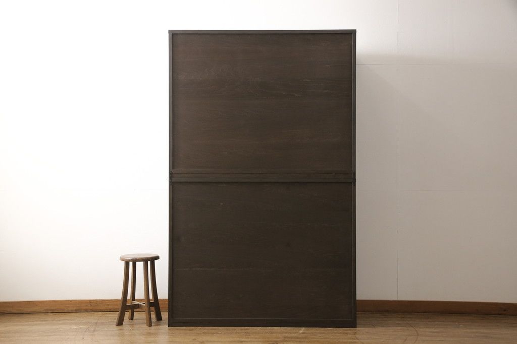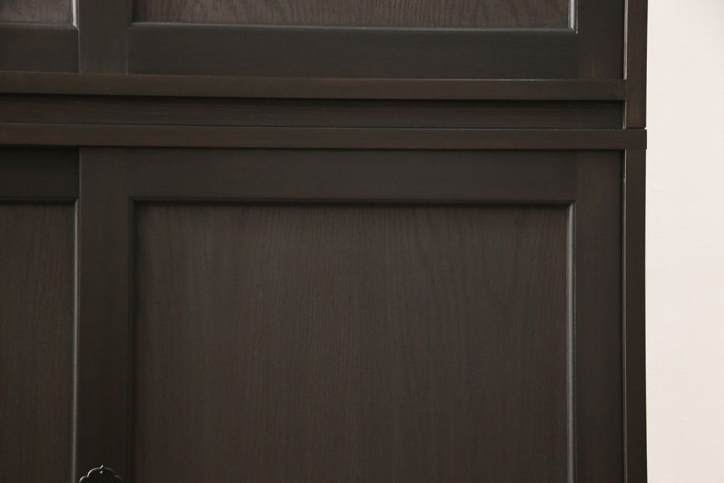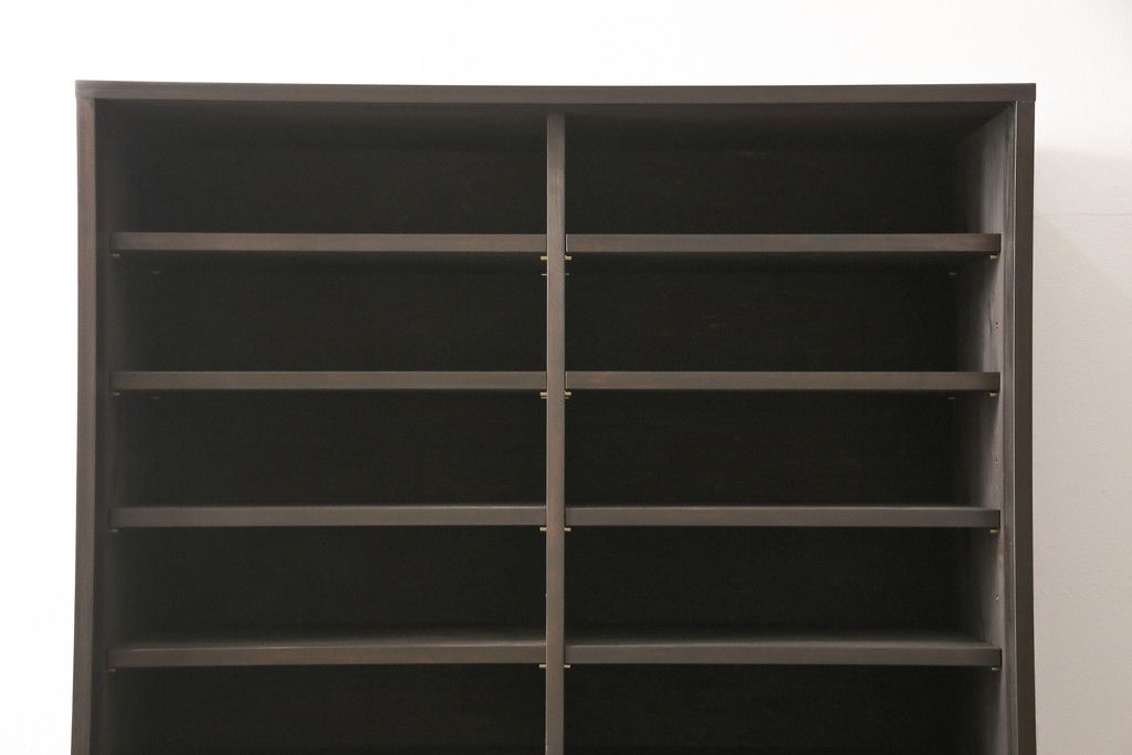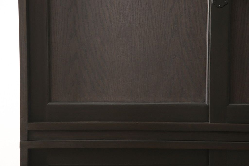 フルオーダー家具実績 > 飾り棚を新規製作!上下段ともに棚板4枚を設け、引き違い戸は戸板を製作。取っ手にはアンティーク金具を使用。(キャビネット、食器棚、戸棚、収納棚、重ね戸棚)