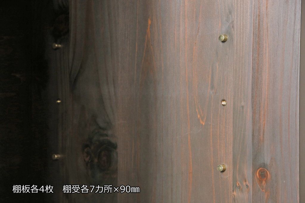 棚板は取り外しできます。棚板は各4枚あります。棚受けは7ヶ所、90mmピッチで調整できます。棚幅サイズのものが1枚の作りです。