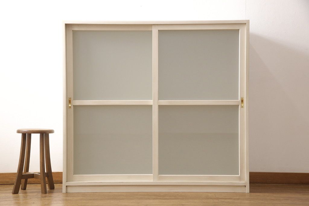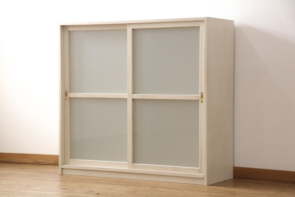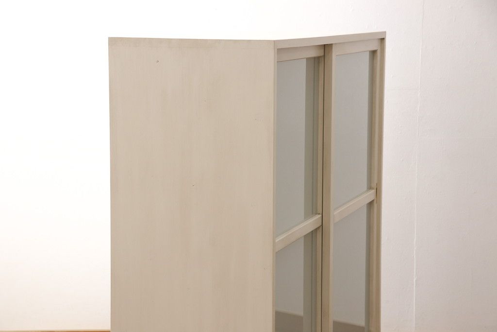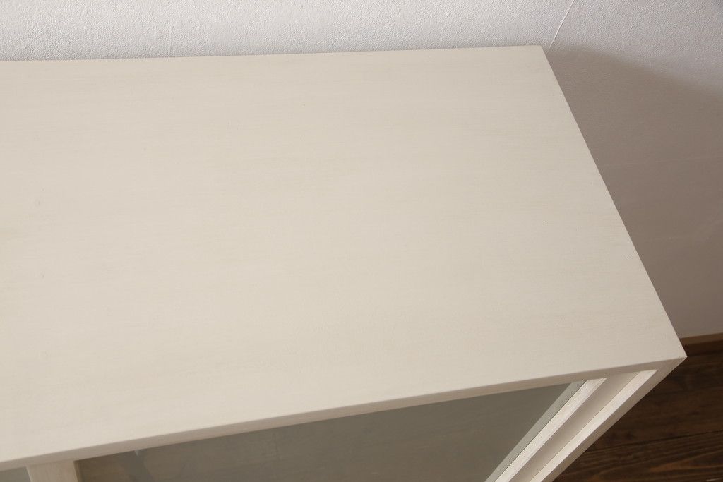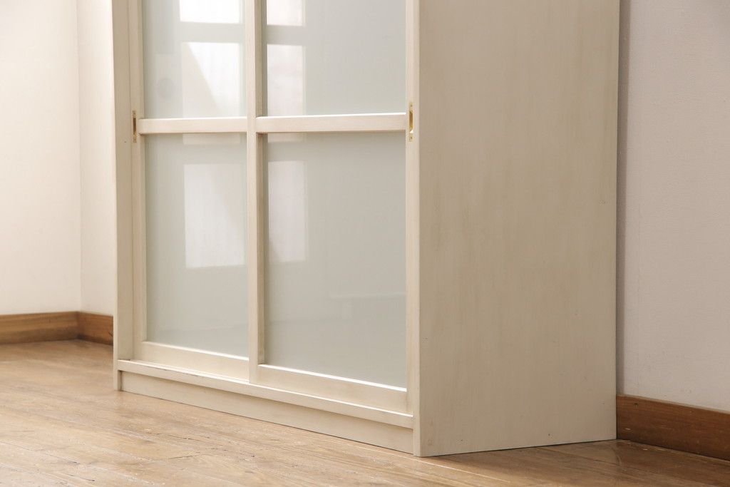 キャビネット・戸棚> サイドキャビネット > 収納棚を新規製作!当店オーダー家具を参考に、ご希望サイズで製作。すりガラス入りの引き戸仕様で、背面はカウンター仕上げ。塗装はエイジング加工でアンティークホワイトにペイント。(戸棚、キャビネット、カウンター、サイドボード)