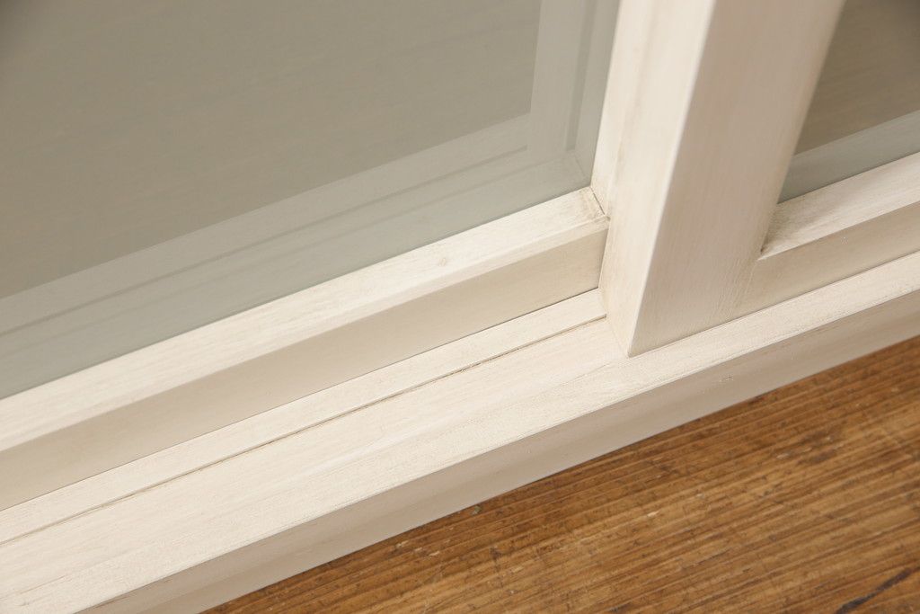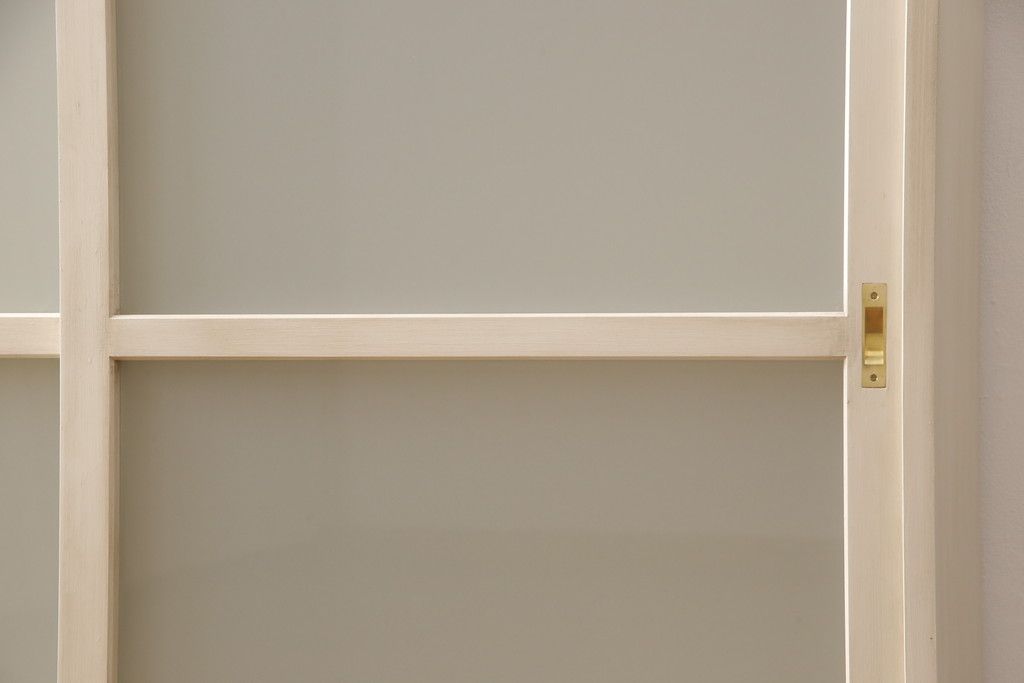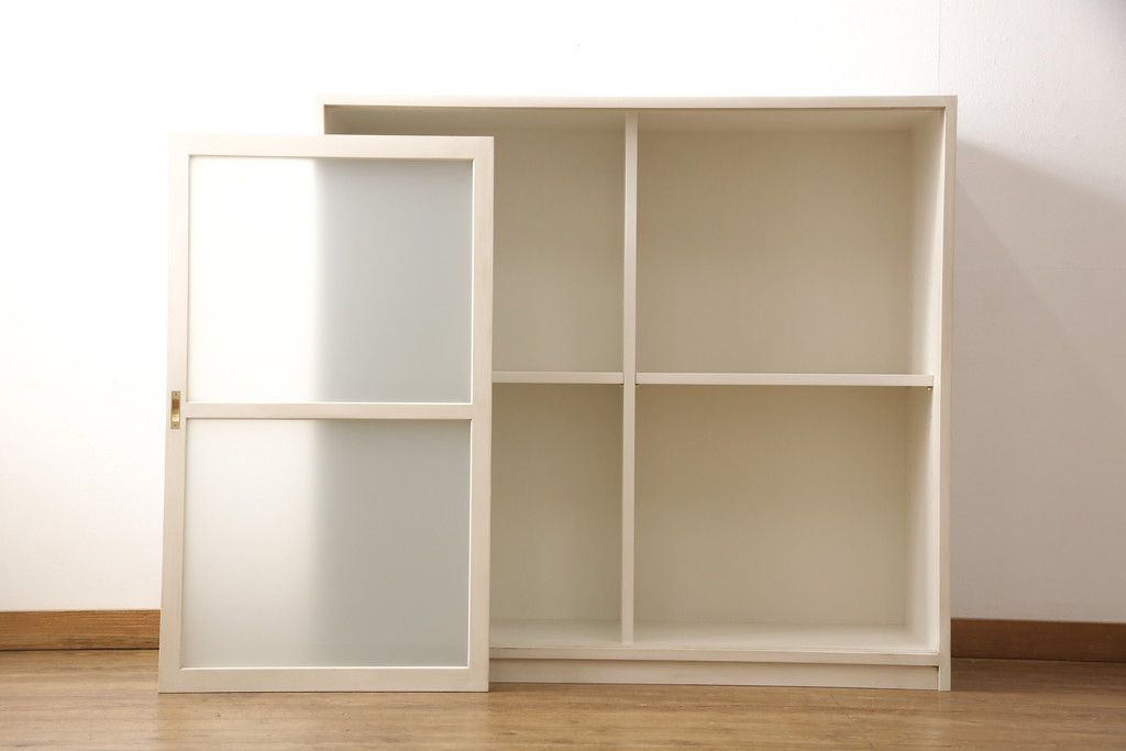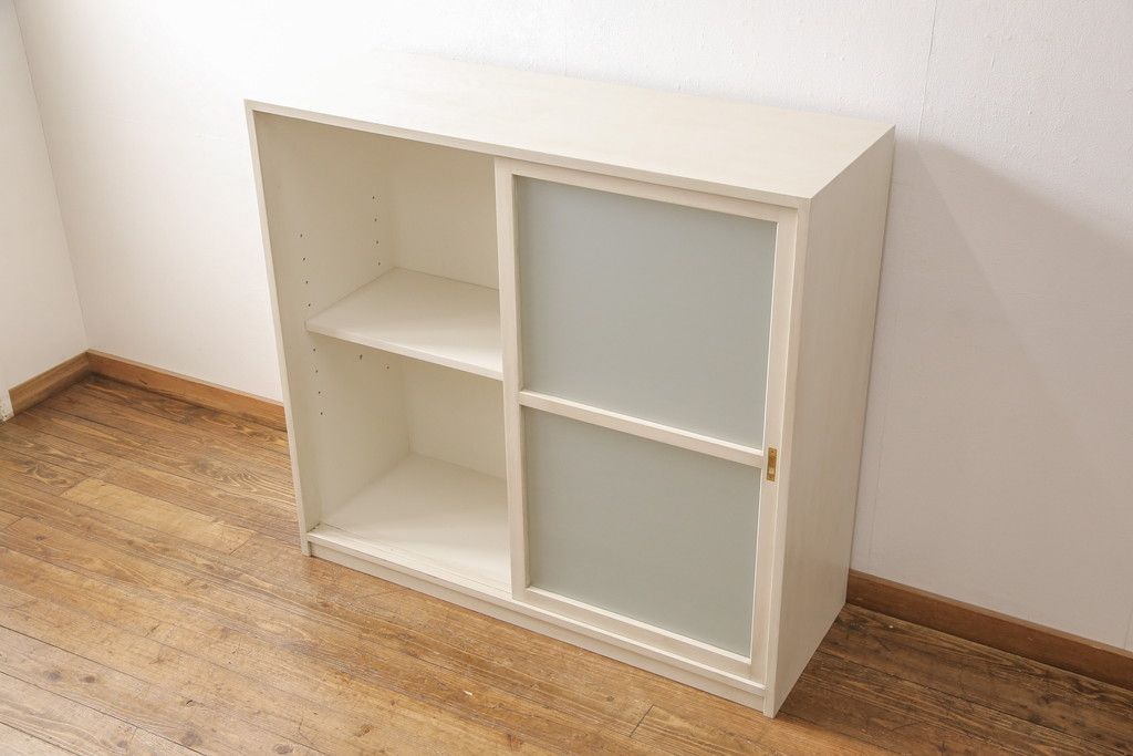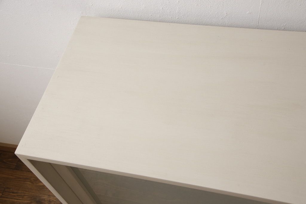 キャビネット・戸棚> サイドキャビネット > 収納棚を新規製作!当店オーダー家具を参考に、ご希望サイズで製作。すりガラス入りの引き戸仕様で、背面はカウンター仕上げ。塗装はエイジング加工でアンティークホワイトにペイント。(戸棚、キャビネット、カウンター、サイドボード)