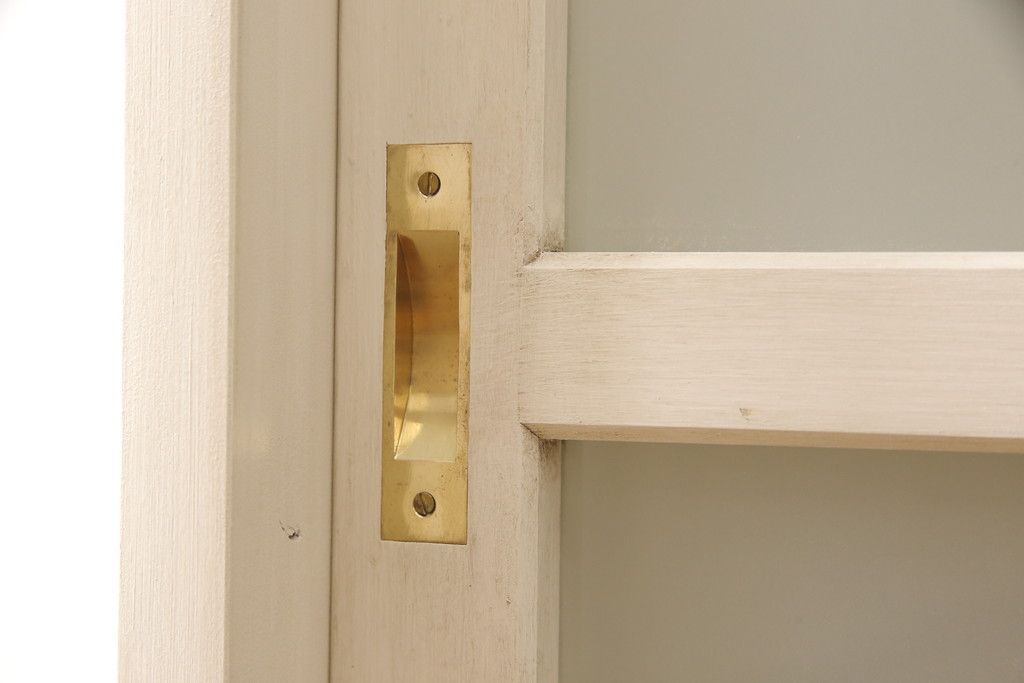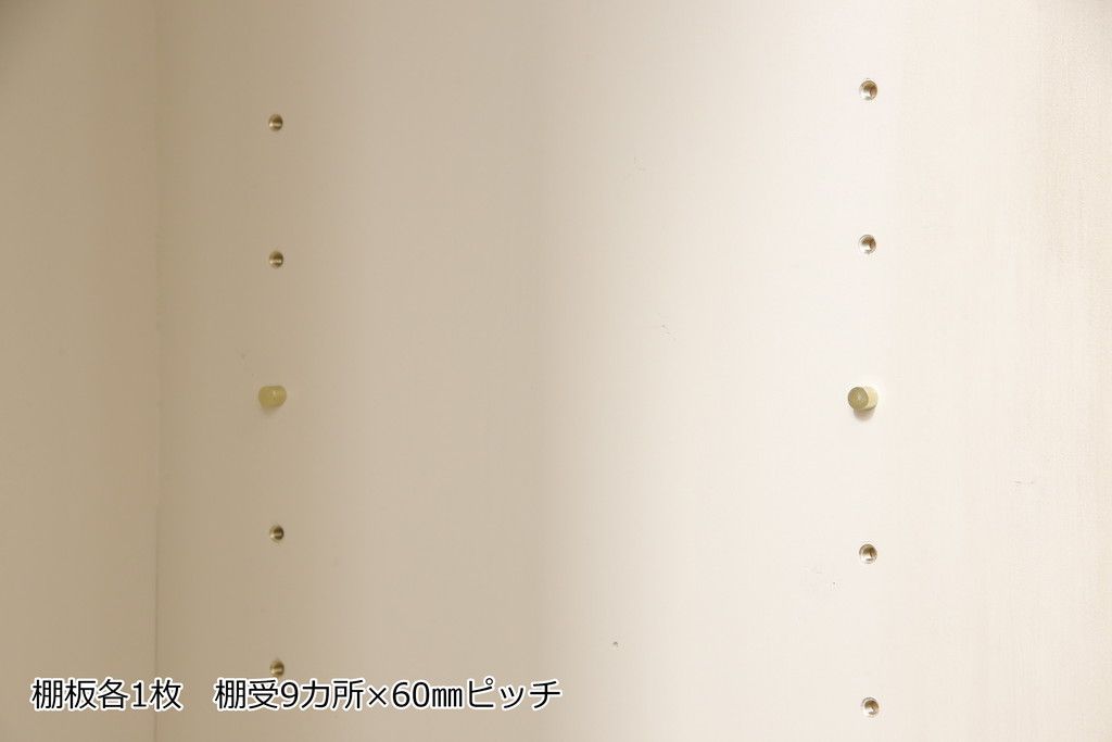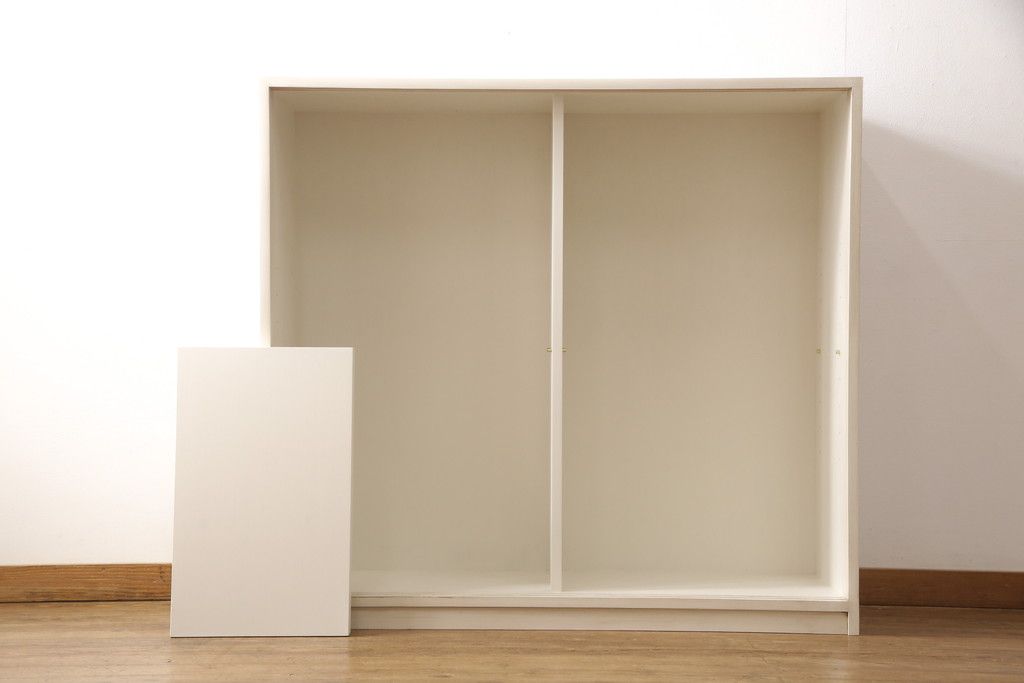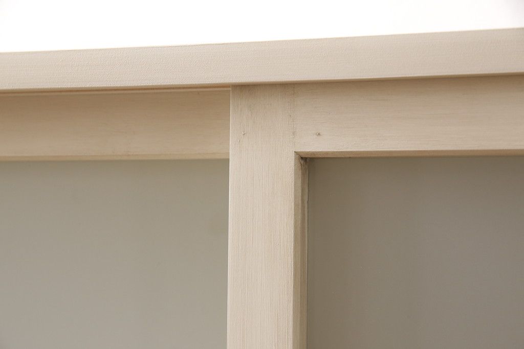 フルオーダー家具実績 > 収納棚を新規製作!当店オーダー家具を参考に、ご希望サイズで製作。すりガラス入りの引き戸仕様で、背面はカウンター仕上げ。塗装はエイジング加工でアンティークホワイトにペイント。(戸棚、キャビネット、カウンター、サイドボード)