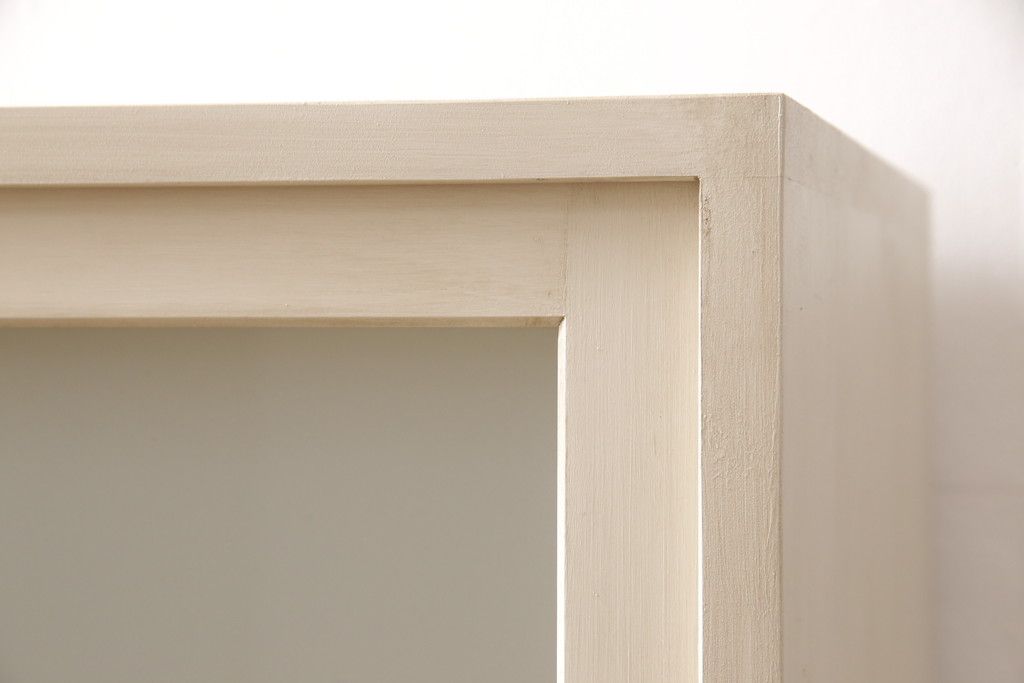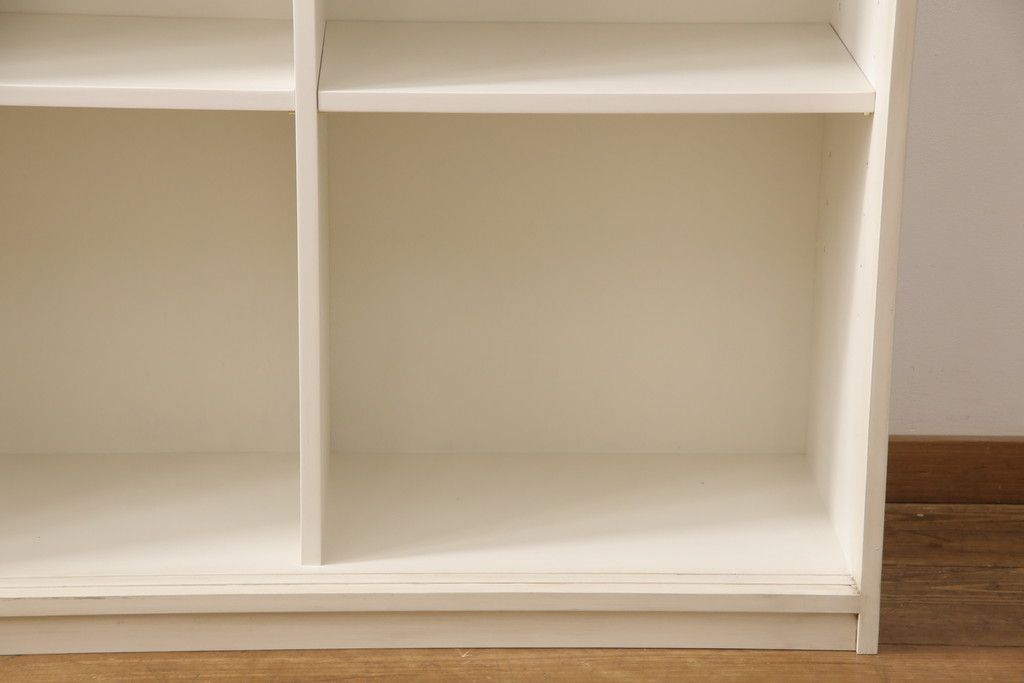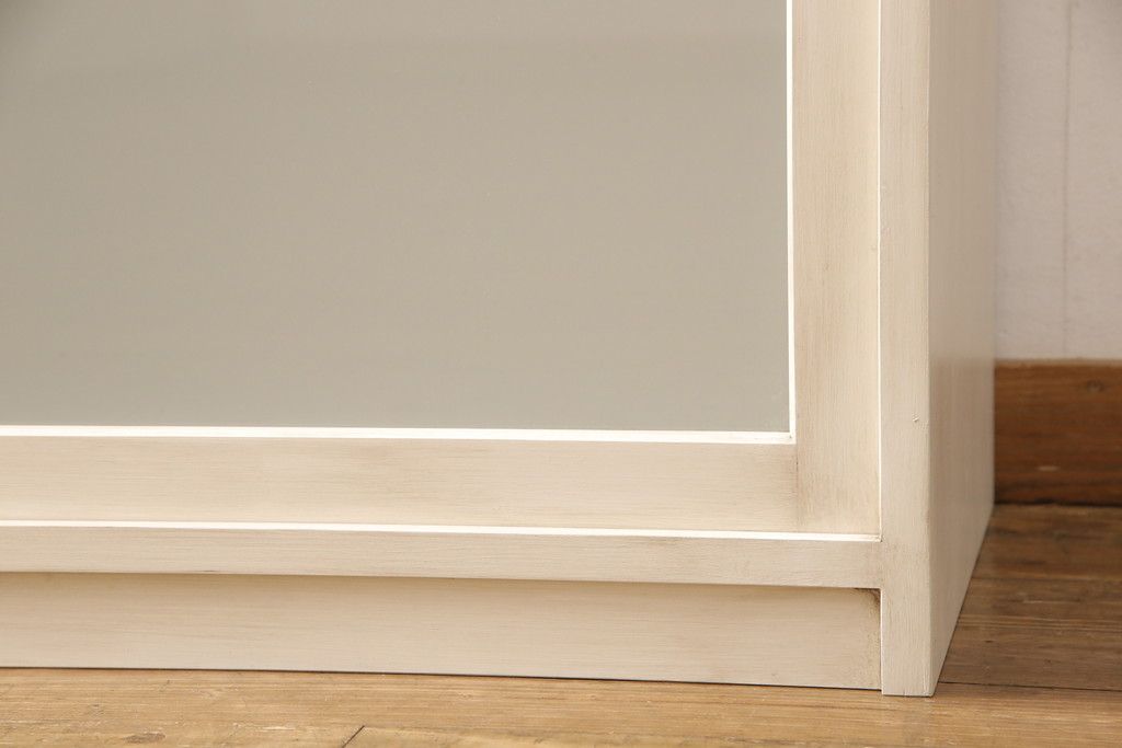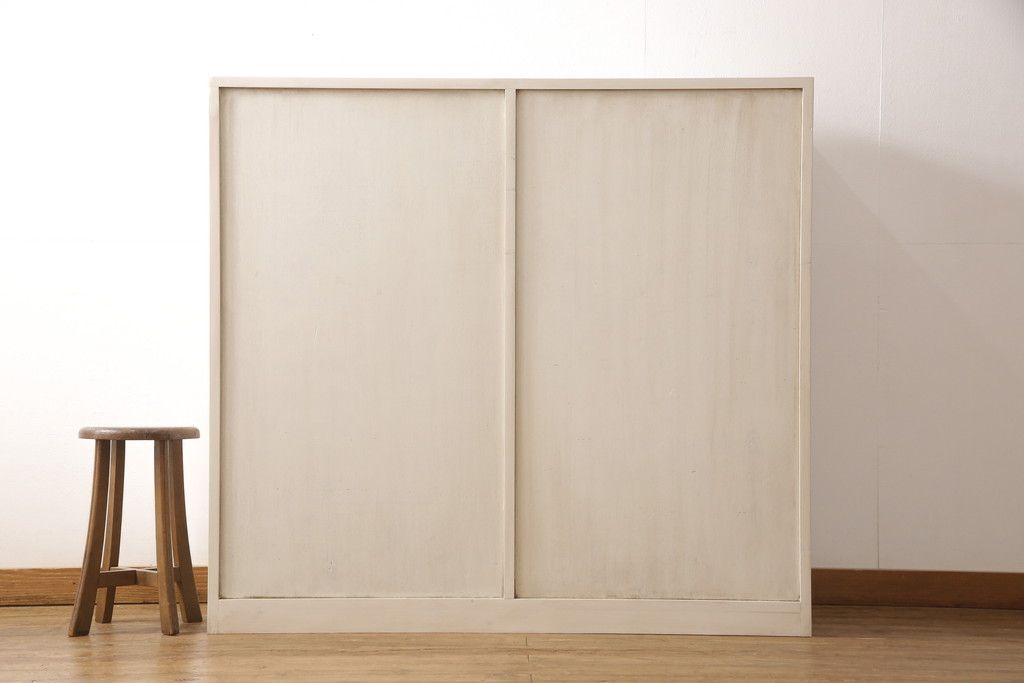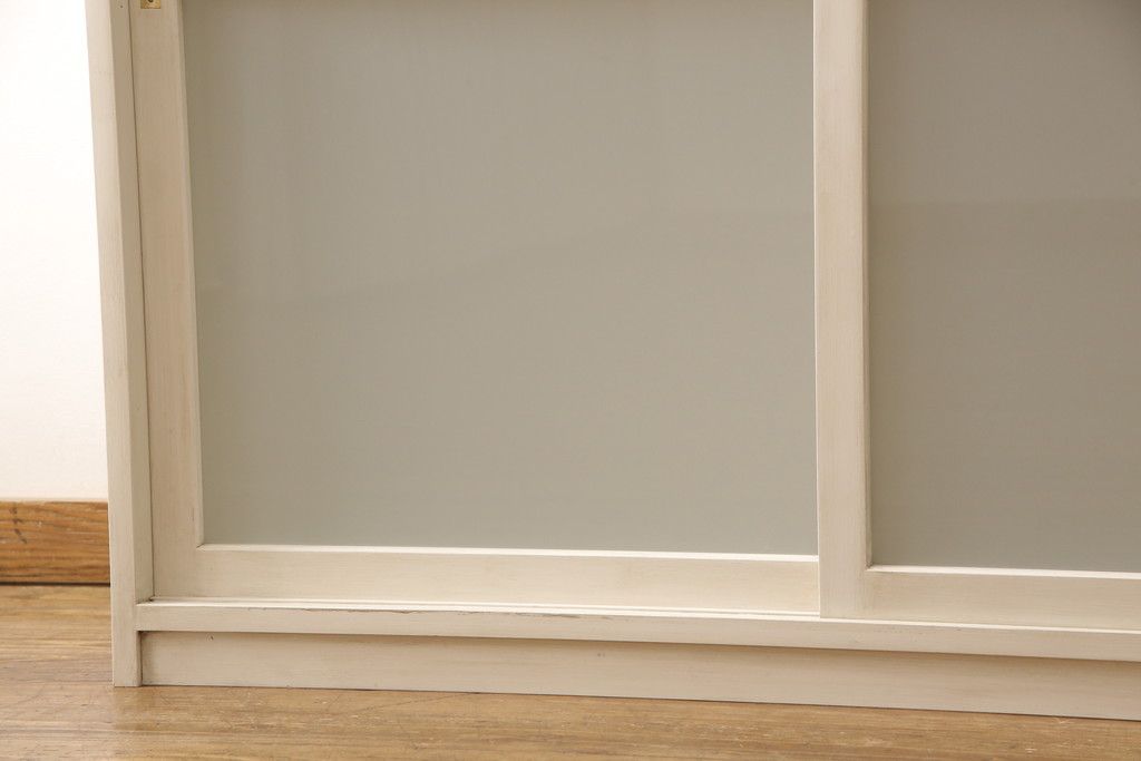 テーブル> カウンターテーブル > 収納棚を新規製作!当店オーダー家具を参考に、ご希望サイズで製作。すりガラス入りの引き戸仕様で、背面はカウンター仕上げ。塗装はエイジング加工でアンティークホワイトにペイント。(戸棚、キャビネット、カウンター、サイドボード)
