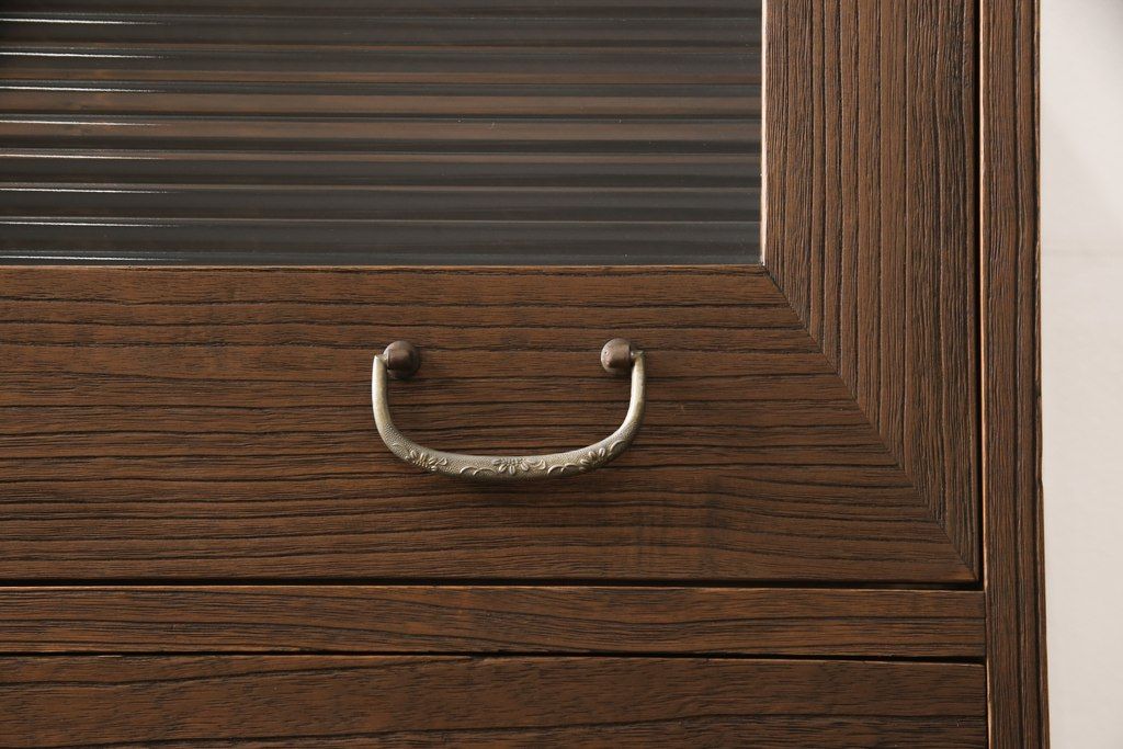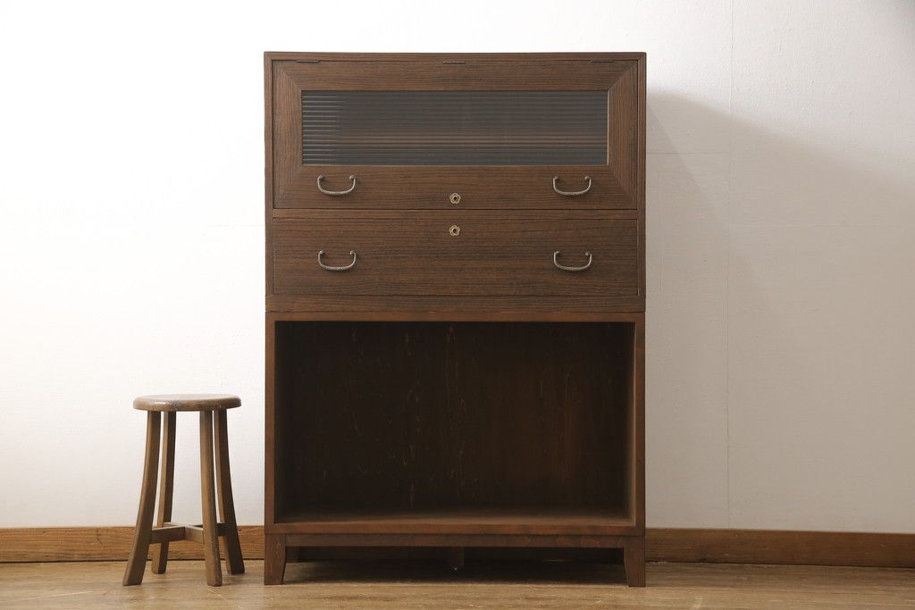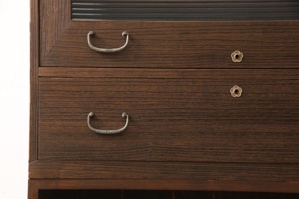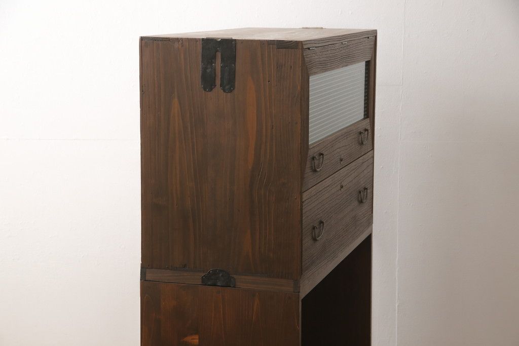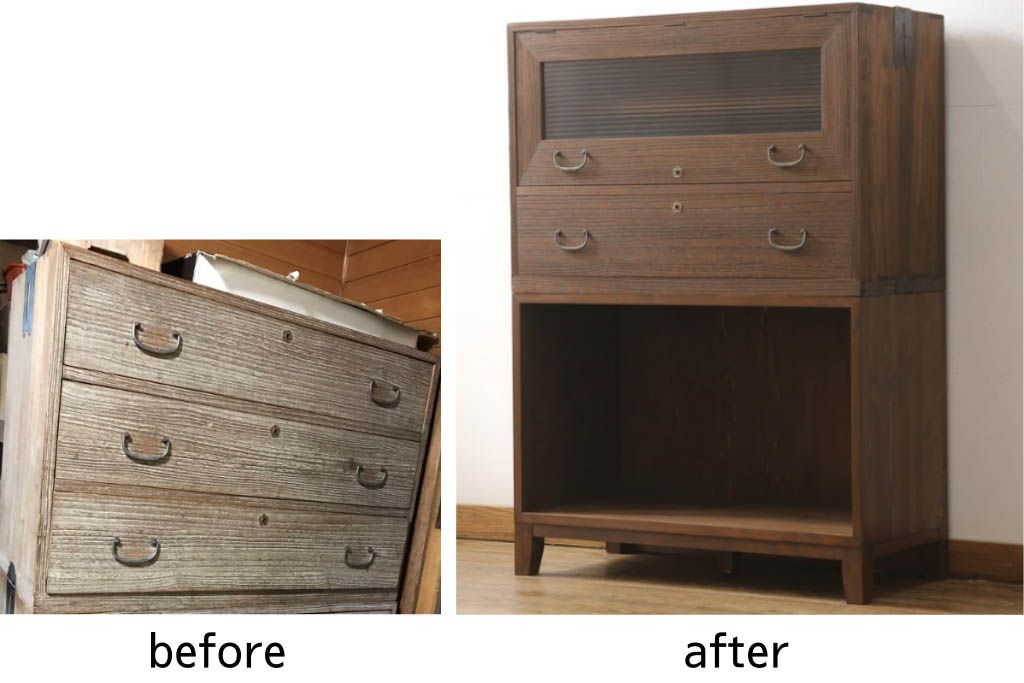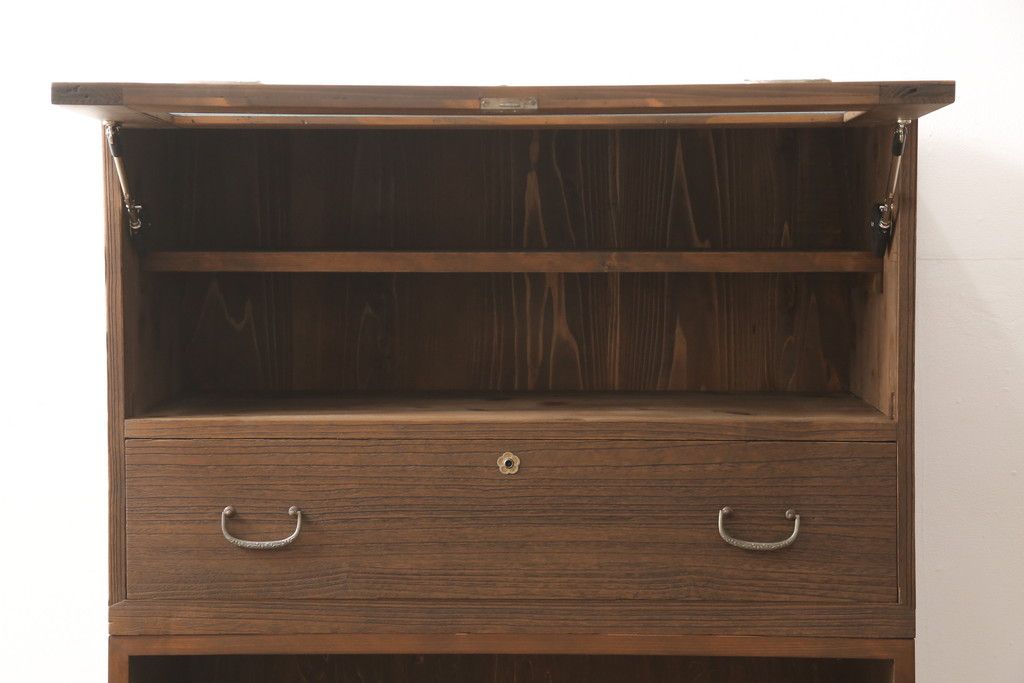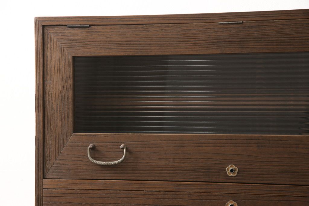 桐箪笥を収納棚にリメイク!1、2段目の引き出しはフラップ式の収納に変更。フラップ式扉にはモールガラスをはめ込み、下部のオープンラックは新規製作。前面のみ浮造り加工。