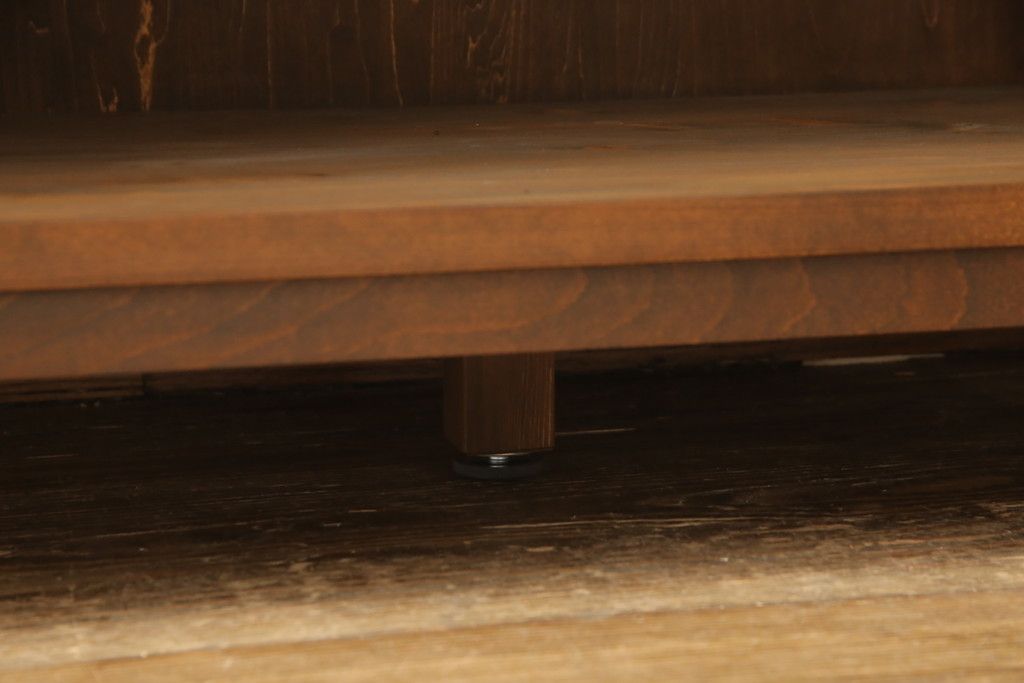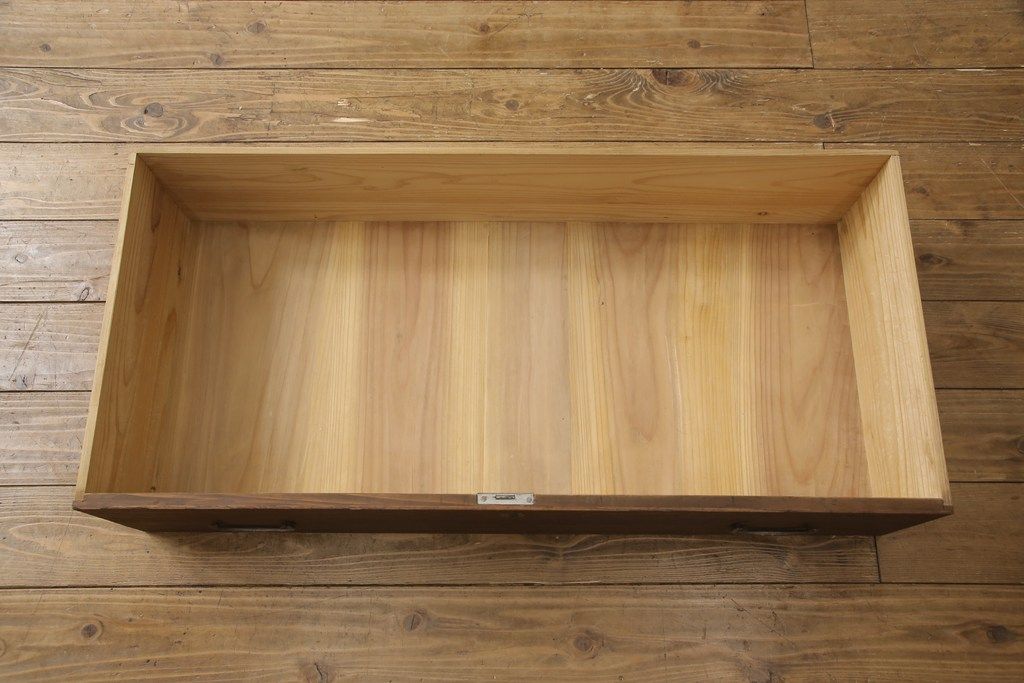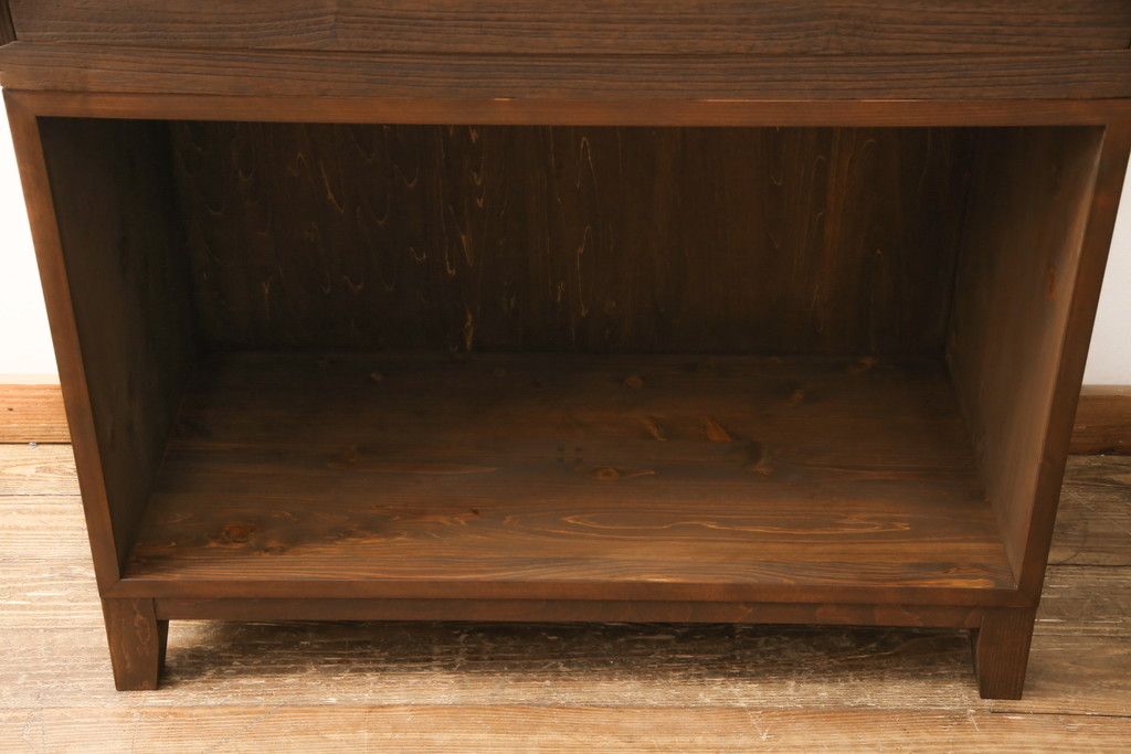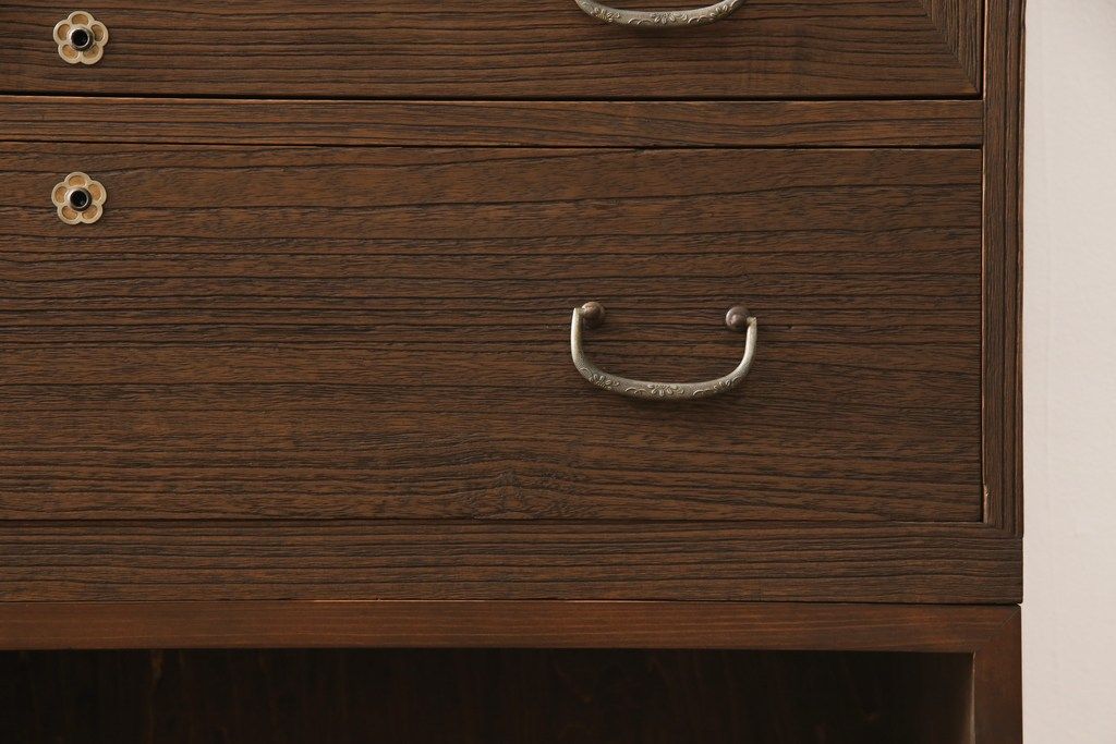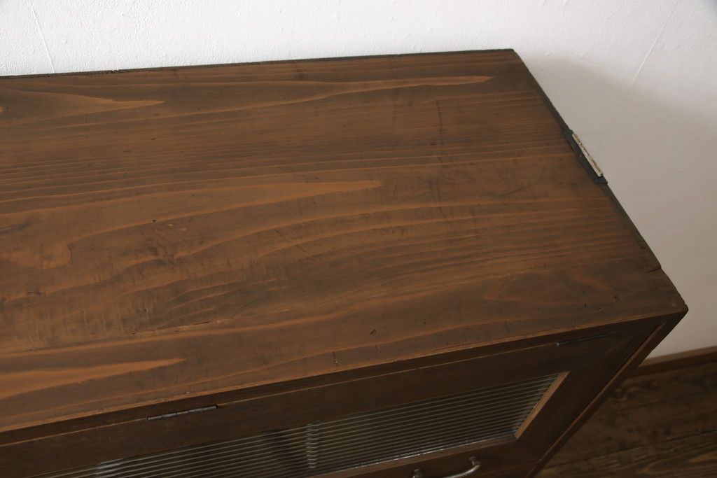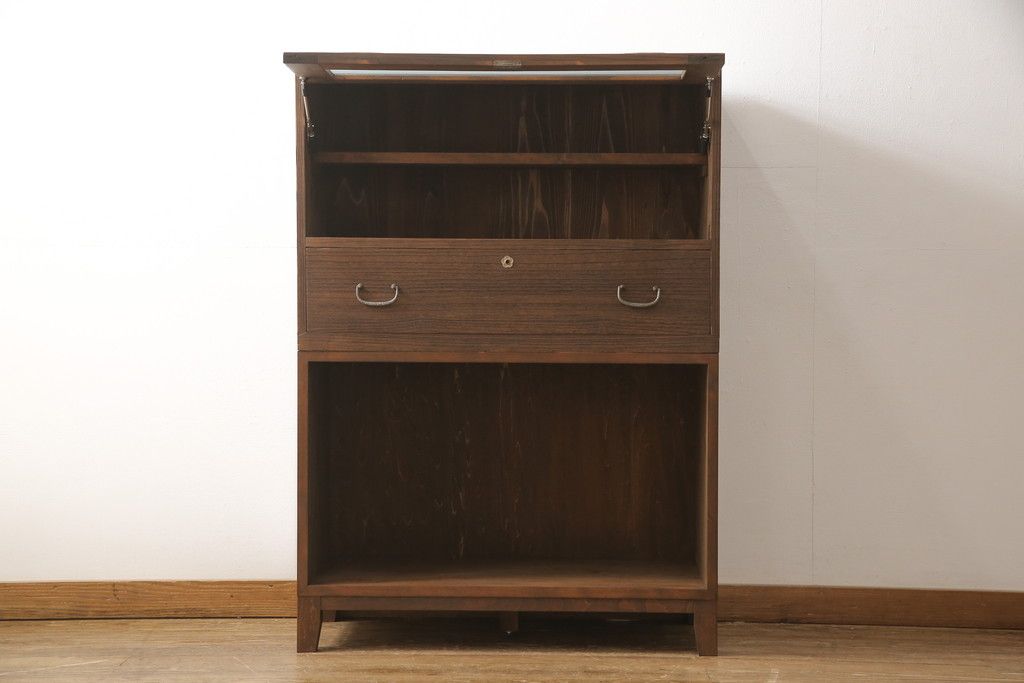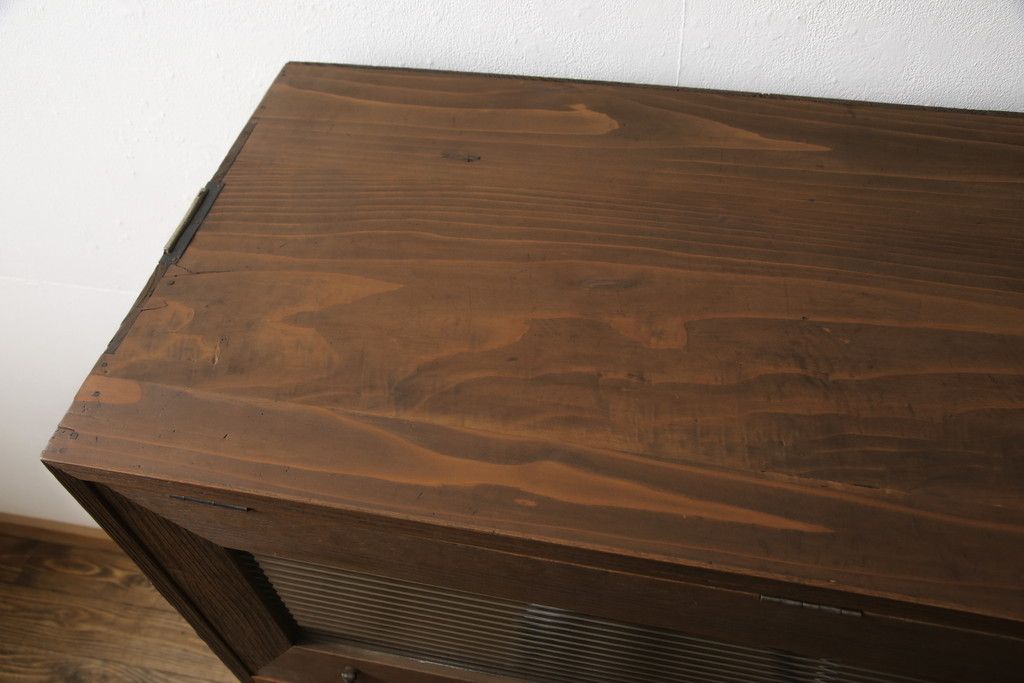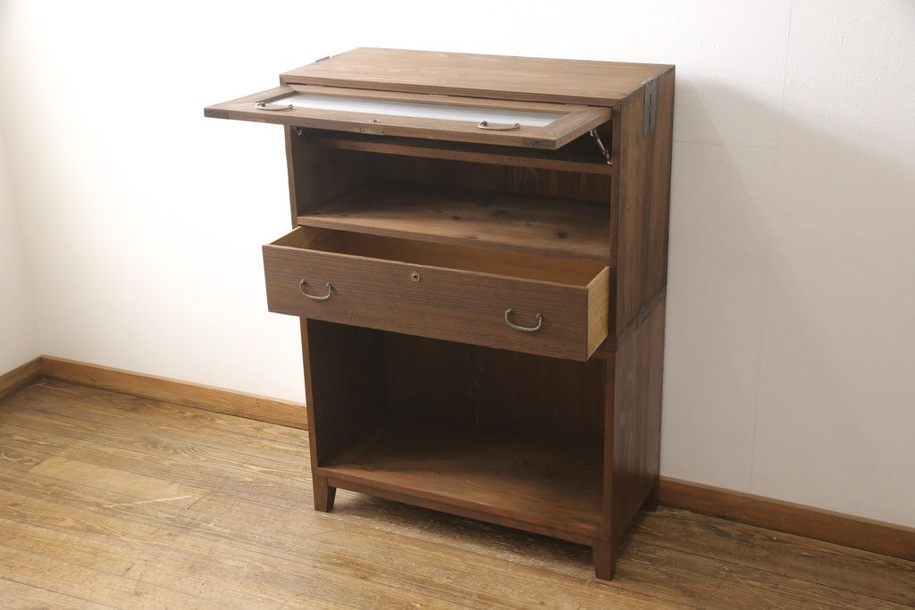 桐箪笥を収納棚にリメイク!1、2段目の引き出しはフラップ式の収納に変更。フラップ式扉にはモールガラスをはめ込み、下部のオープンラックは新規製作。前面のみ浮造り加工。