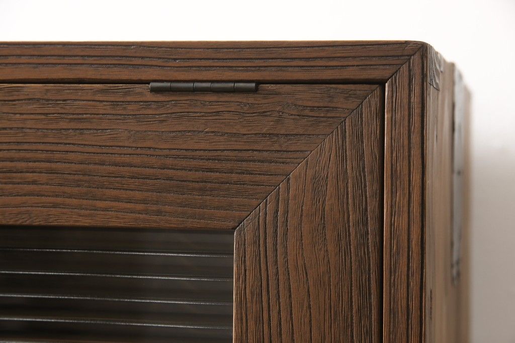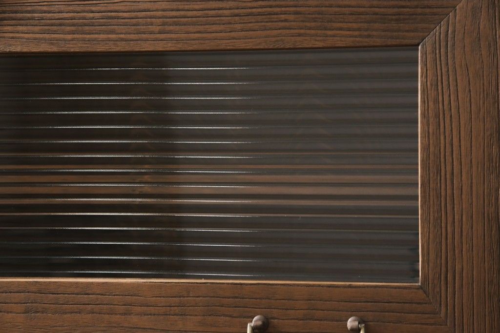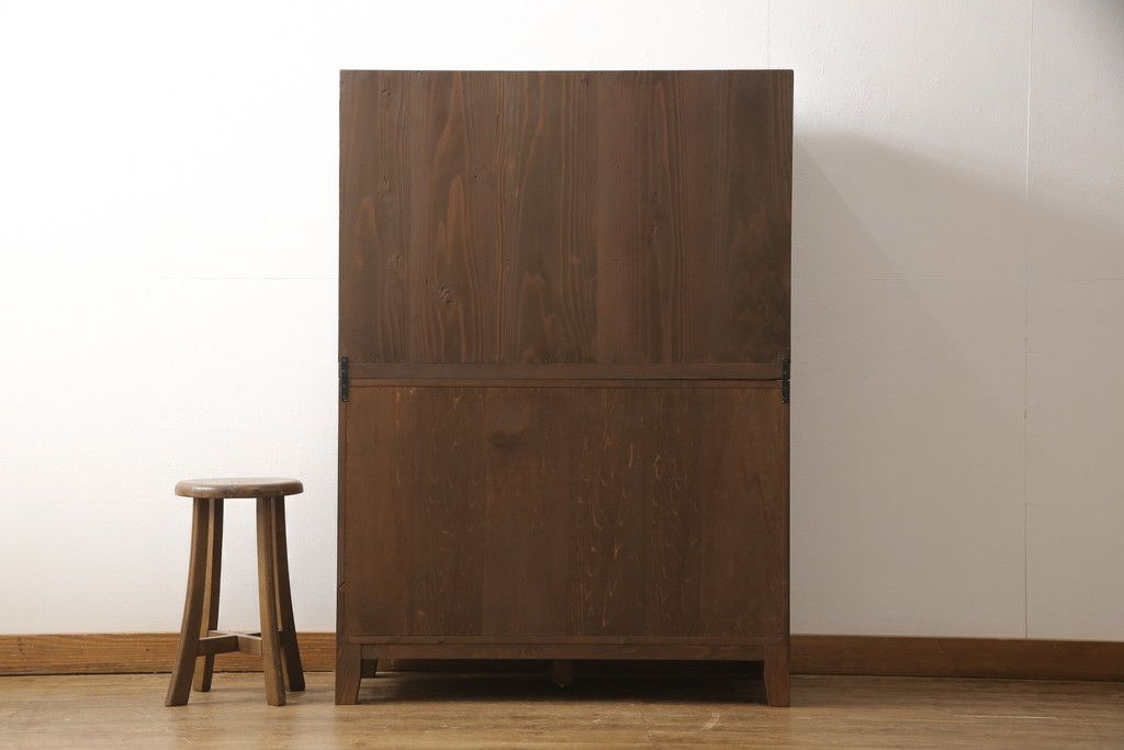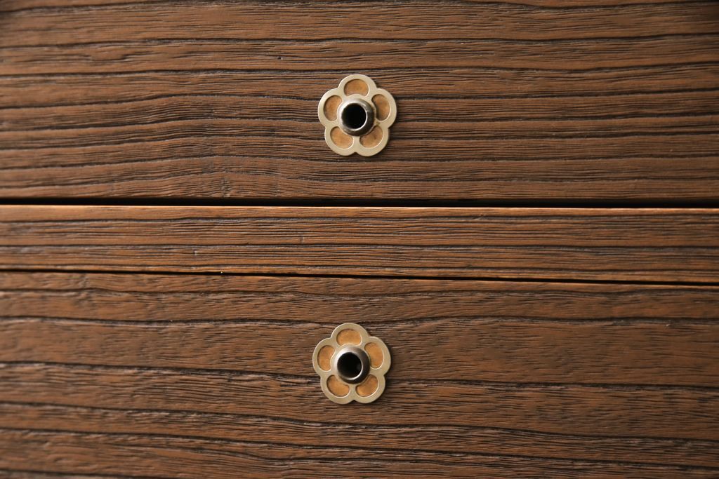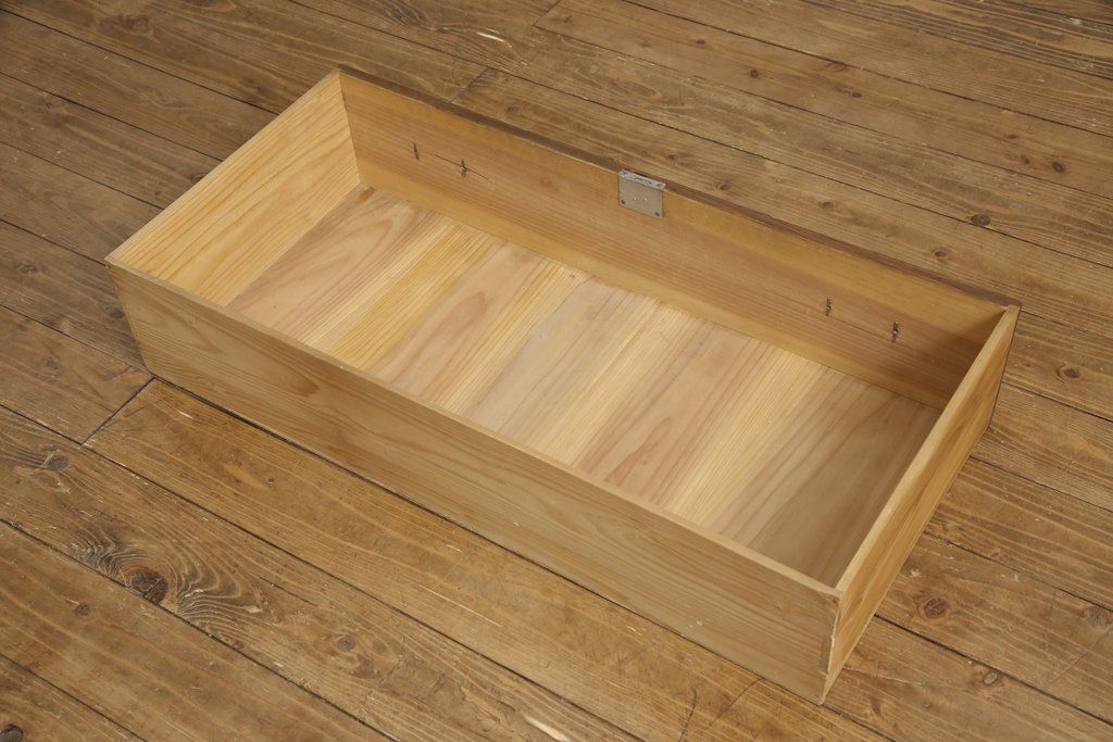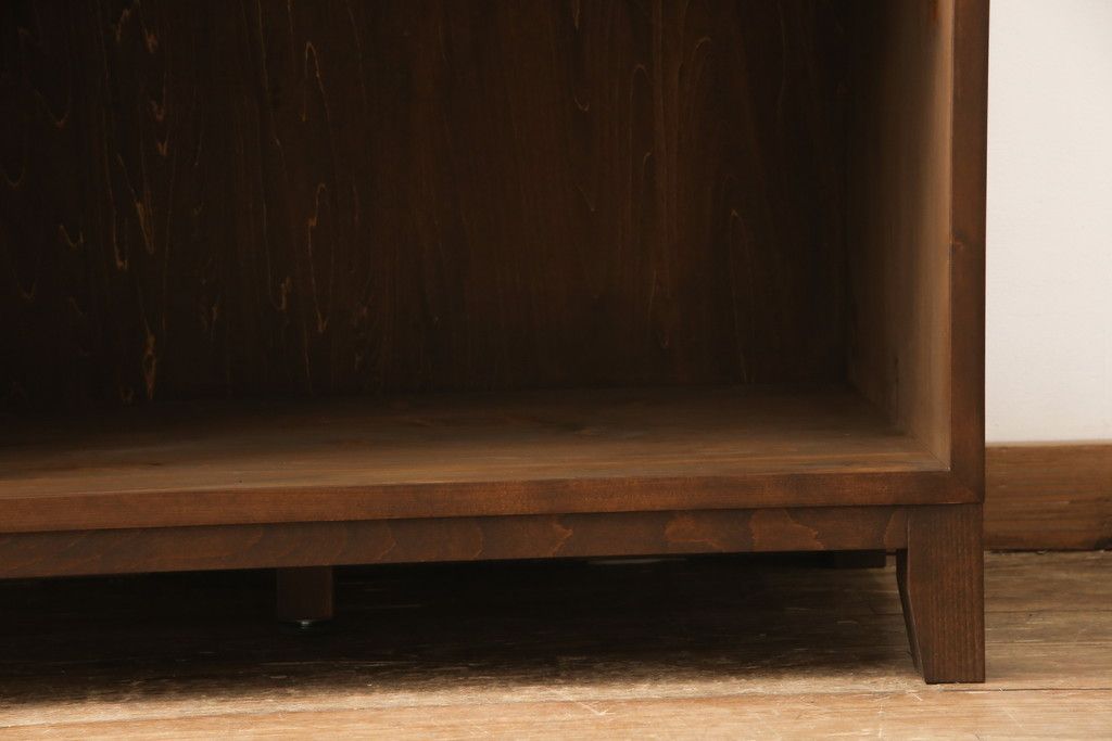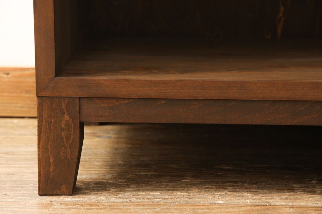 桐箪笥を収納棚にリメイク!1、2段目の引き出しはフラップ式の収納に変更。フラップ式扉にはモールガラスをはめ込み、下部のオープンラックは新規製作。前面のみ浮造り加工。