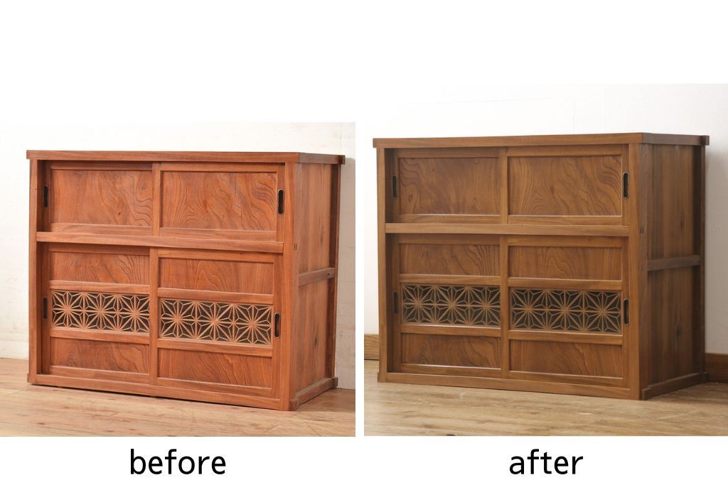 セミオーダー家具実績 > 戸棚をリペア&カスタム!戸棚内部に補強材を張り付け天板補強。内部は本体のお色味に合わせて着色、本体は現状をベースにして1トーン程落ち着いた色味に着色。(関東水屋箪笥、キャビネット、収納棚)