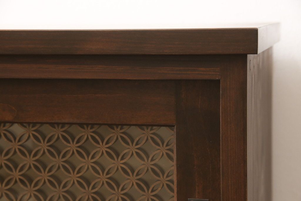 ラフジュ工房> キャビネット・戸棚> サイドキャビネット > テレビ台を新規製作!建具に七宝模様の組子レーザー加工をし、背面には穴あけ加工。色味は当店商品を参考に着色。(収納棚、キャビネット、テレビ台、テレビボード)