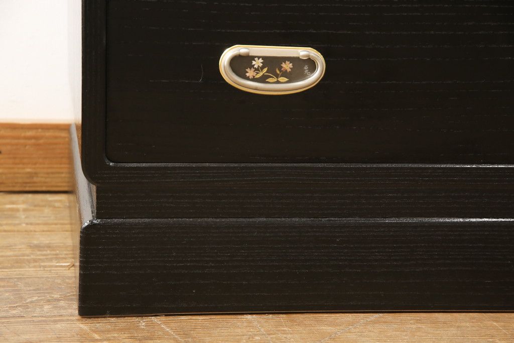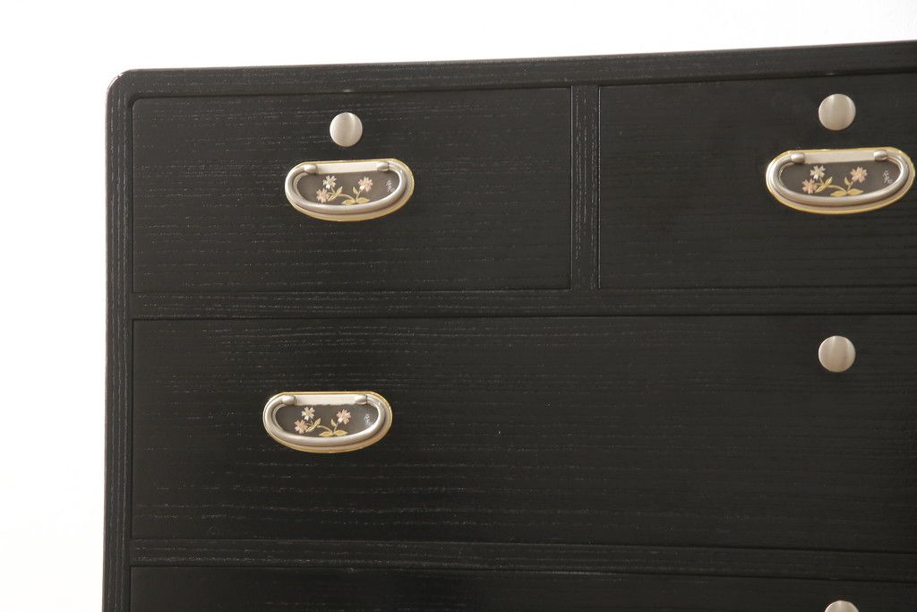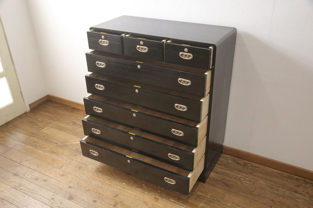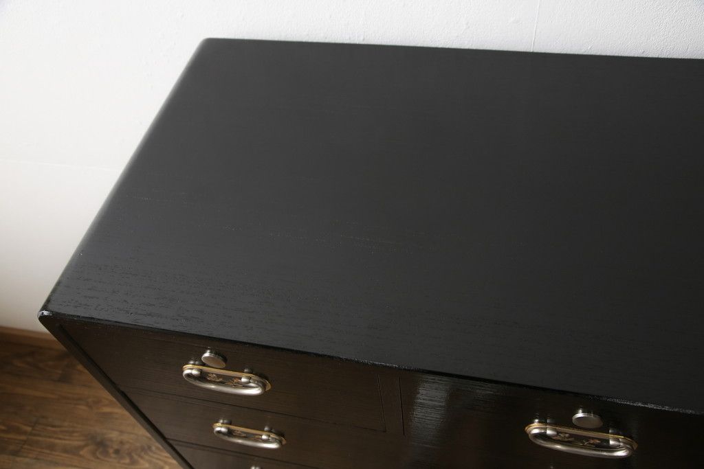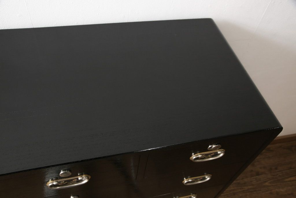 和箪笥 > 総桐箪笥をリペア&カスタム!本体は当店商品を参考にカシュー塗装の黒色に着色。引き出し内部は現状のままのお色味で仕上げ。(並厚、四方丸、桐たんす、引き出し、チェスト、衣装箪笥、整理タンス、小抽タンス、小箪笥、桐たんす、和箪笥)