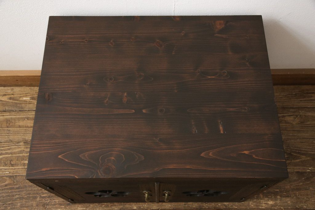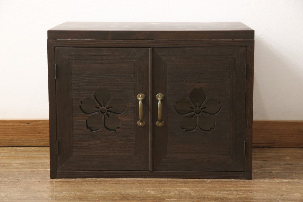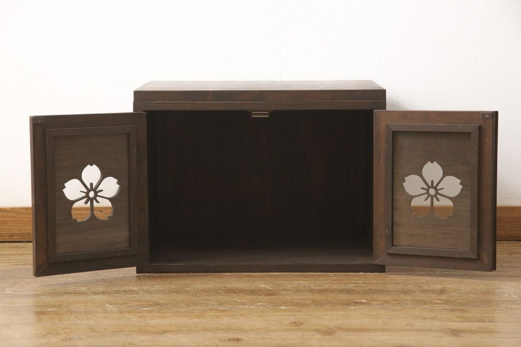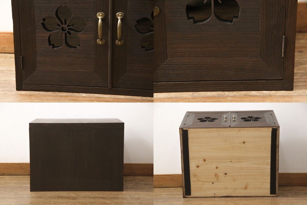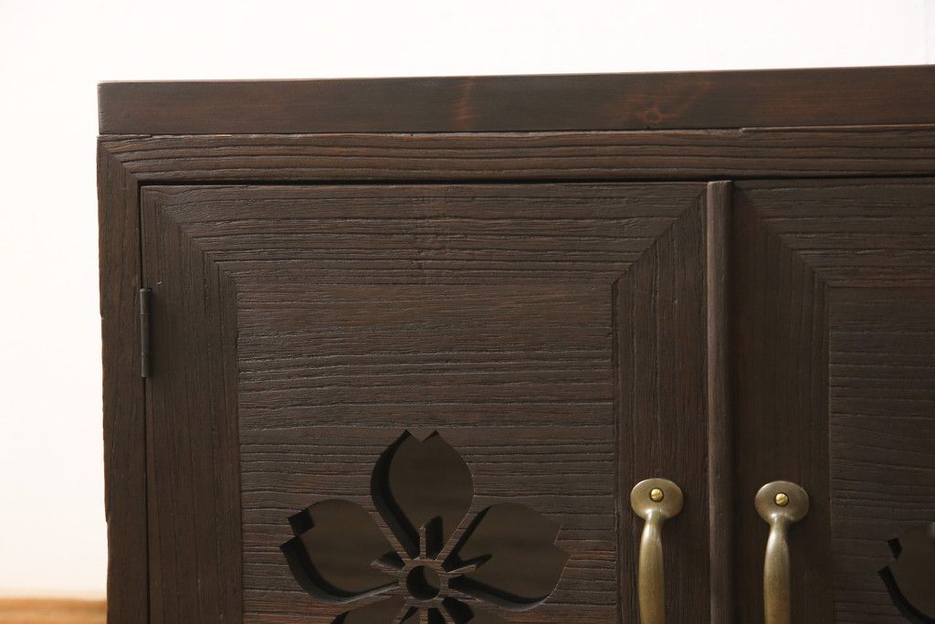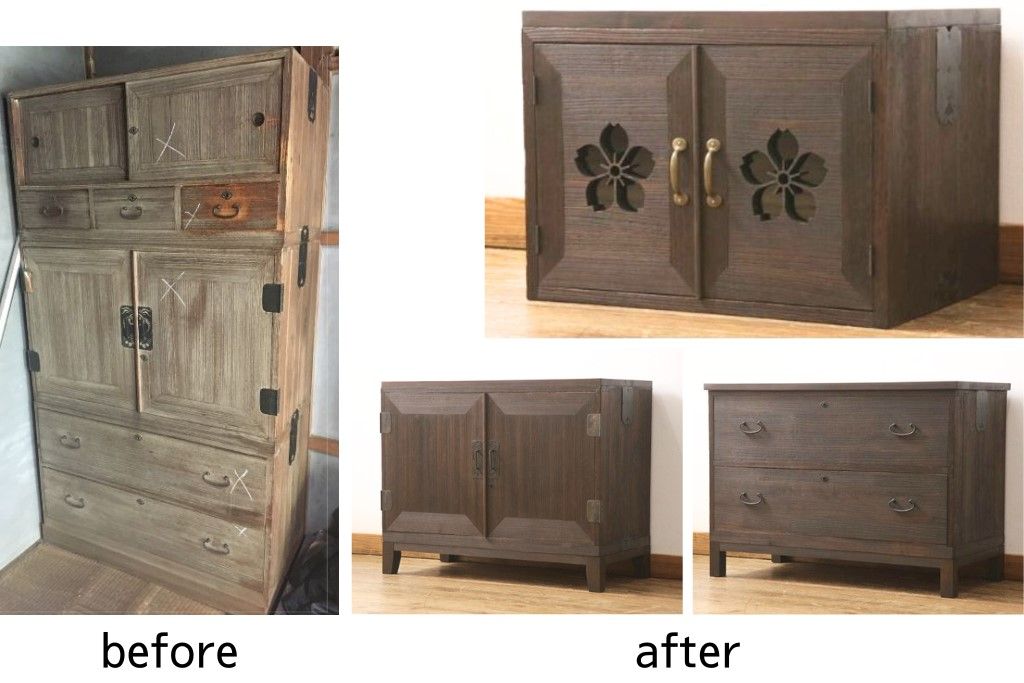 3段重ね桐箪笥を3つの収納にリメイク!上段はリサイズし、扉に桜の透かし彫りを入れた戸棚に。中段と下段は天板と脚を取り付けローボードに。3台ともチェス系で着色して仕上げ。