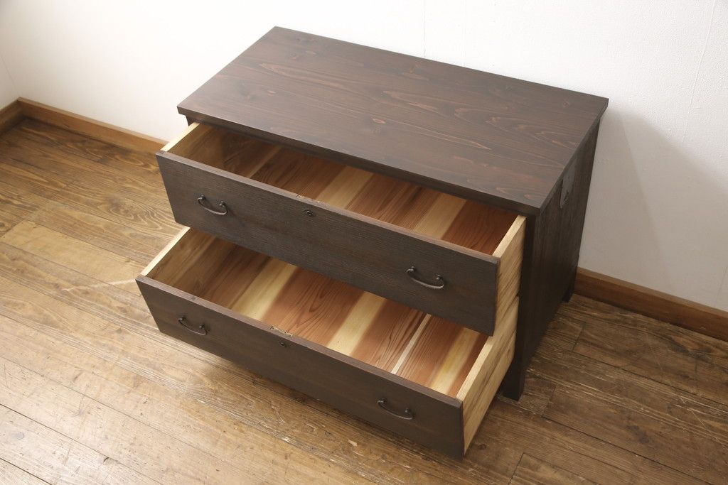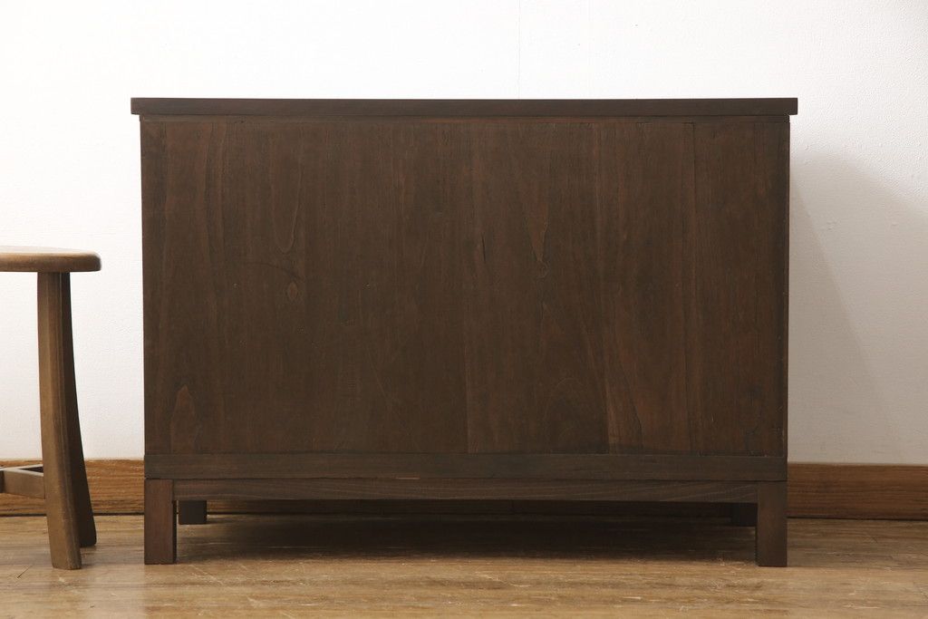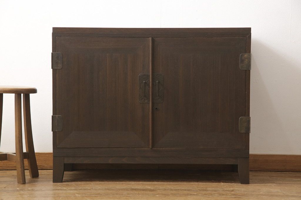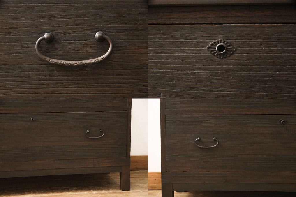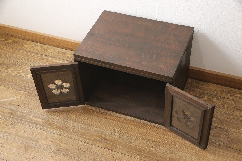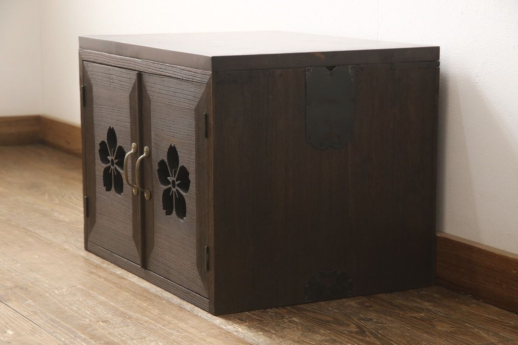 3段重ね桐箪笥を3つの収納にリメイク!上段はリサイズし、扉に桜の透かし彫りを入れた戸棚に。中段と下段は天板と脚を取り付けローボードに。3台ともチェス系で着色して仕上げ。