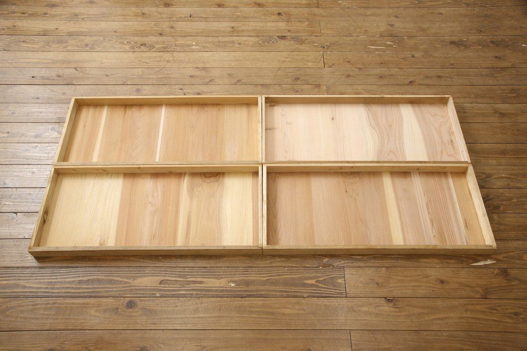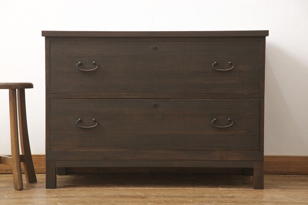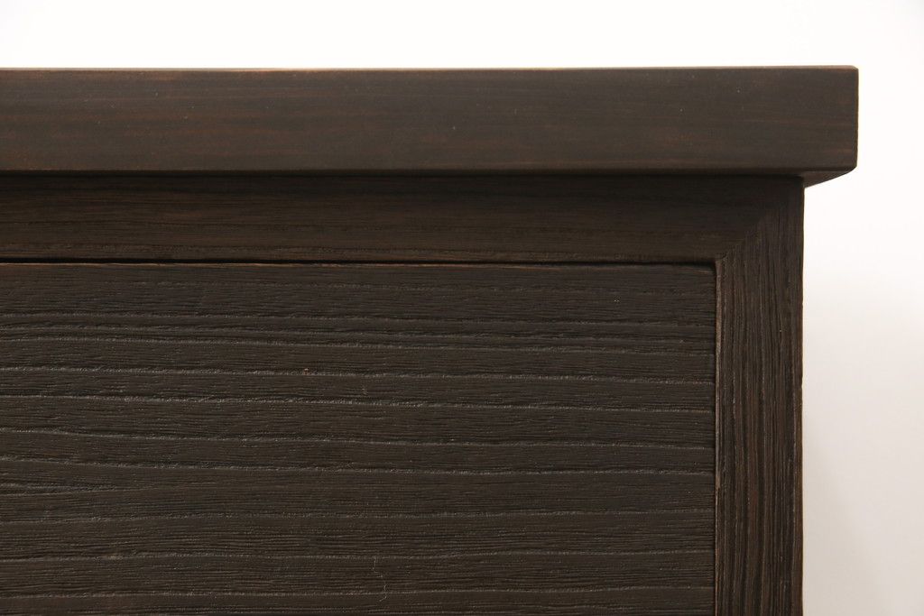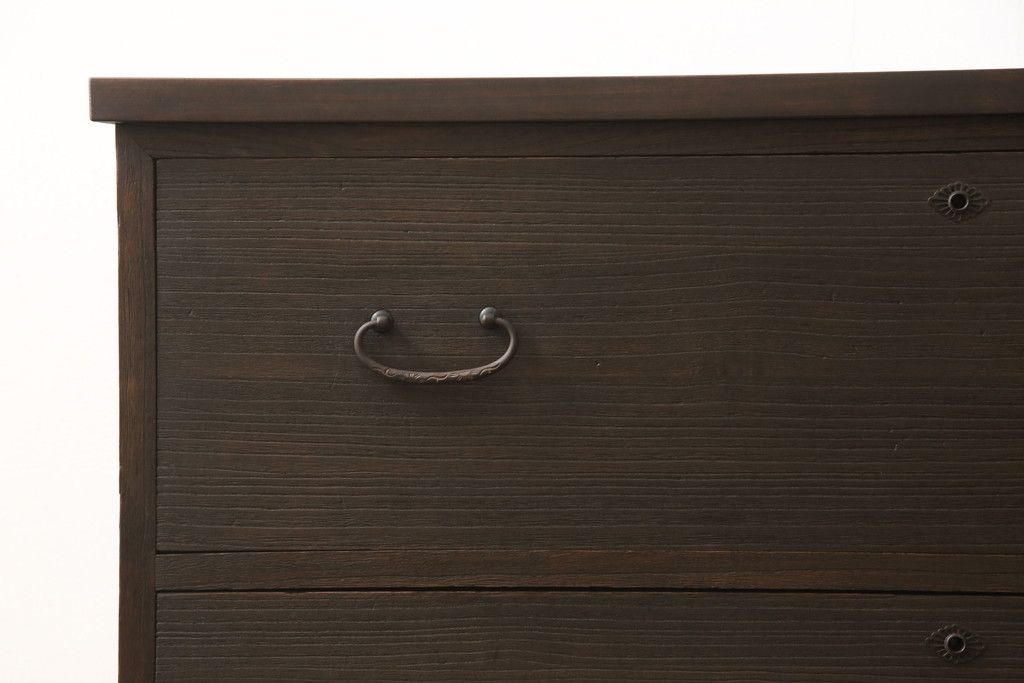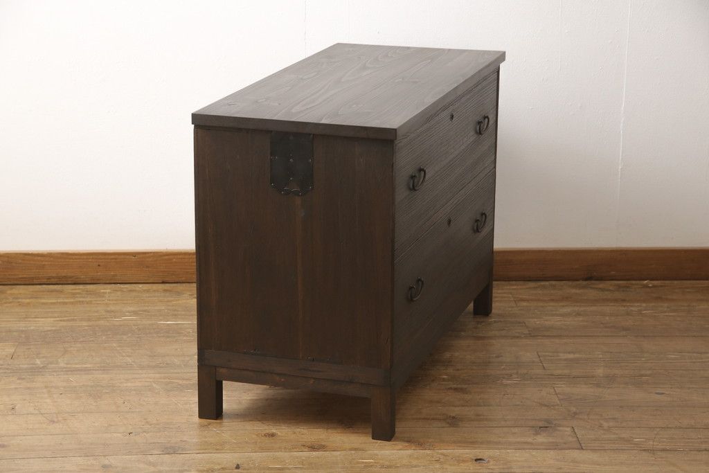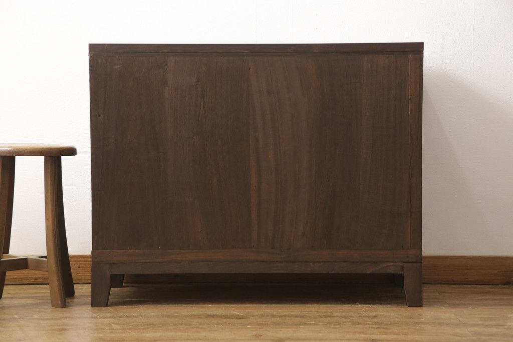 3段重ね桐箪笥を3つの収納にリメイク!上段はリサイズし、扉に桜の透かし彫りを入れた戸棚に。中段と下段は天板と脚を取り付けローボードに。3台ともチェス系で着色して仕上げ。