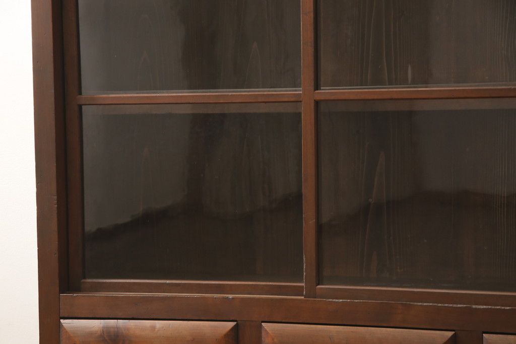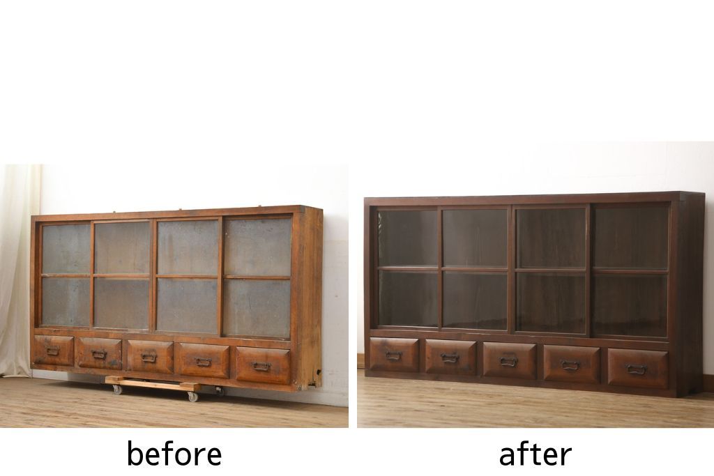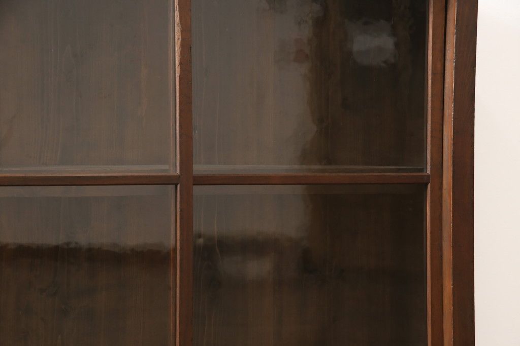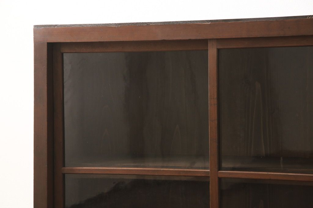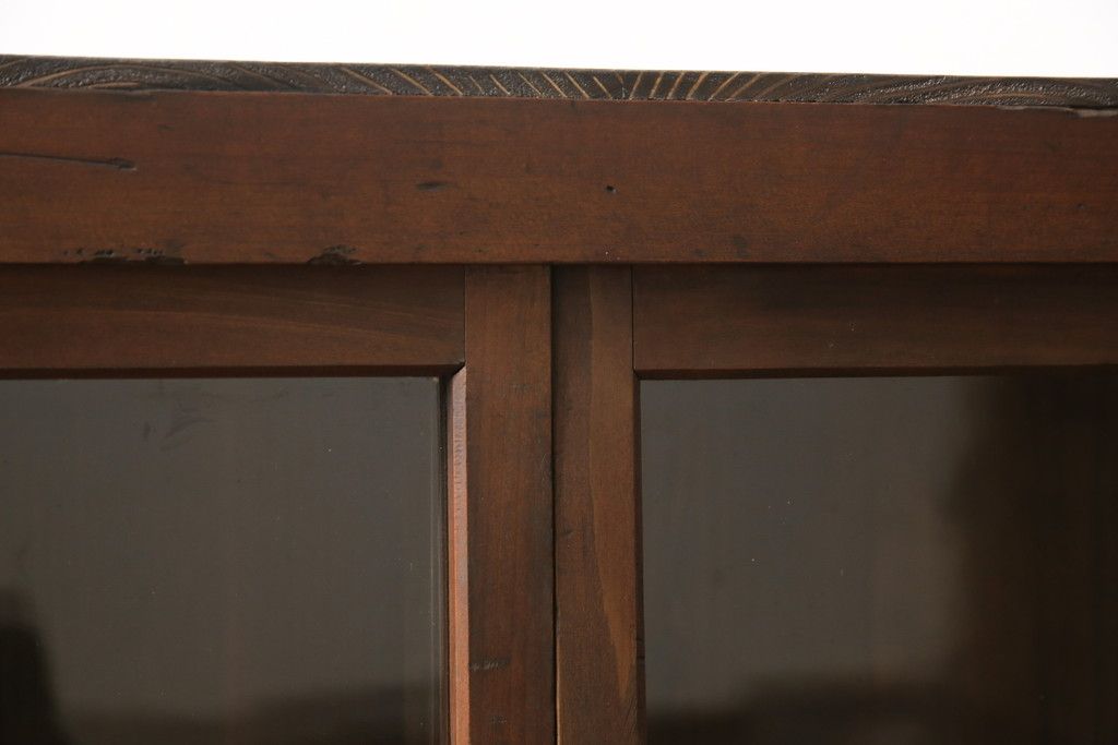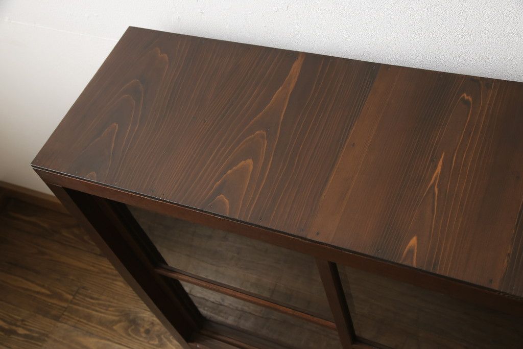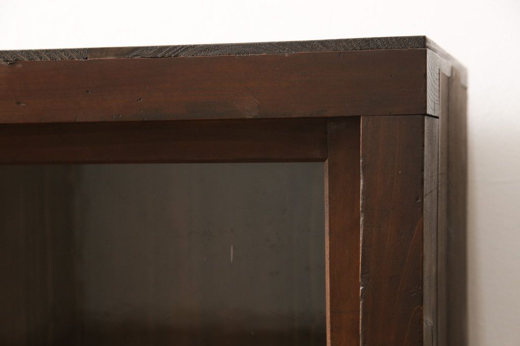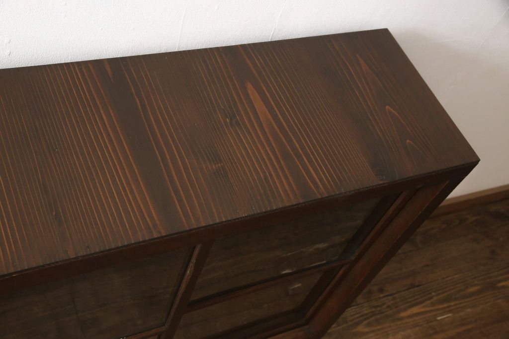 セミオーダー家具実績 > ガラス戸棚をリペア&カスタム!天板・背板を張り替え、染みや変色部分はバフ掛けを施し色合わせ。強度を持たせるため支柱を設置。本体は現状をベースに着色。(収納棚、サイドボード、キャビネット)
