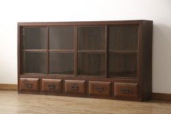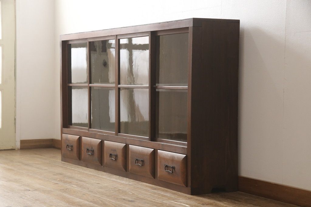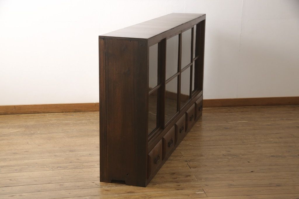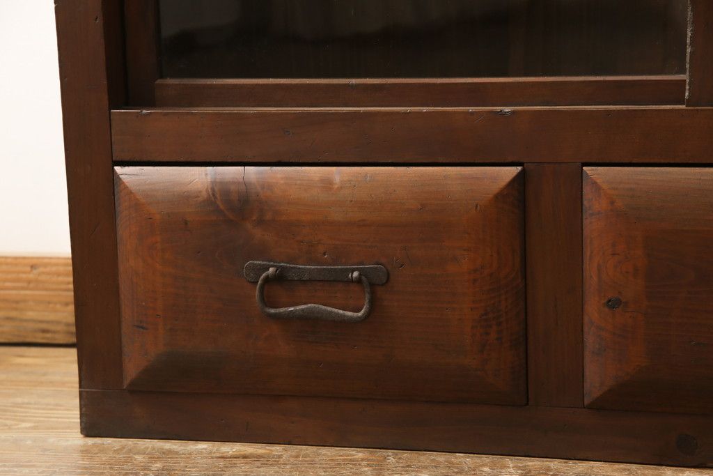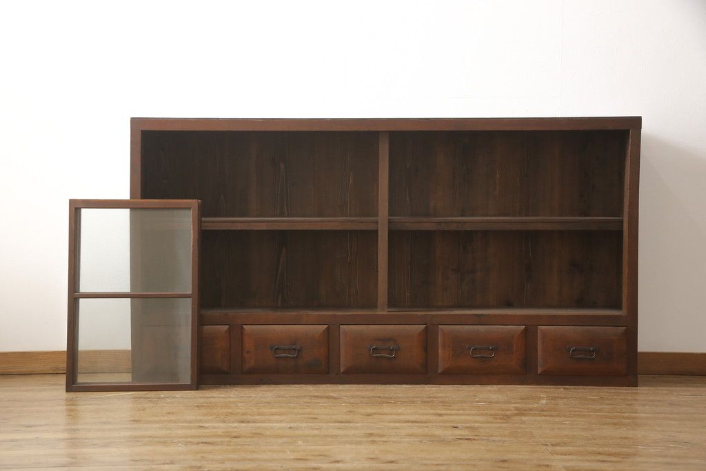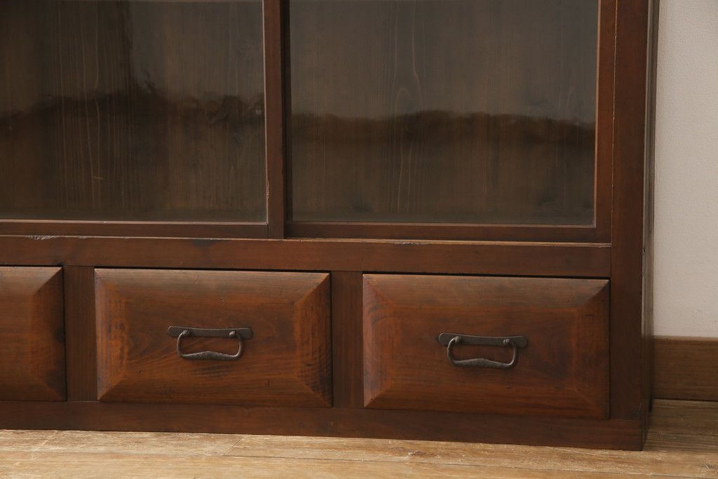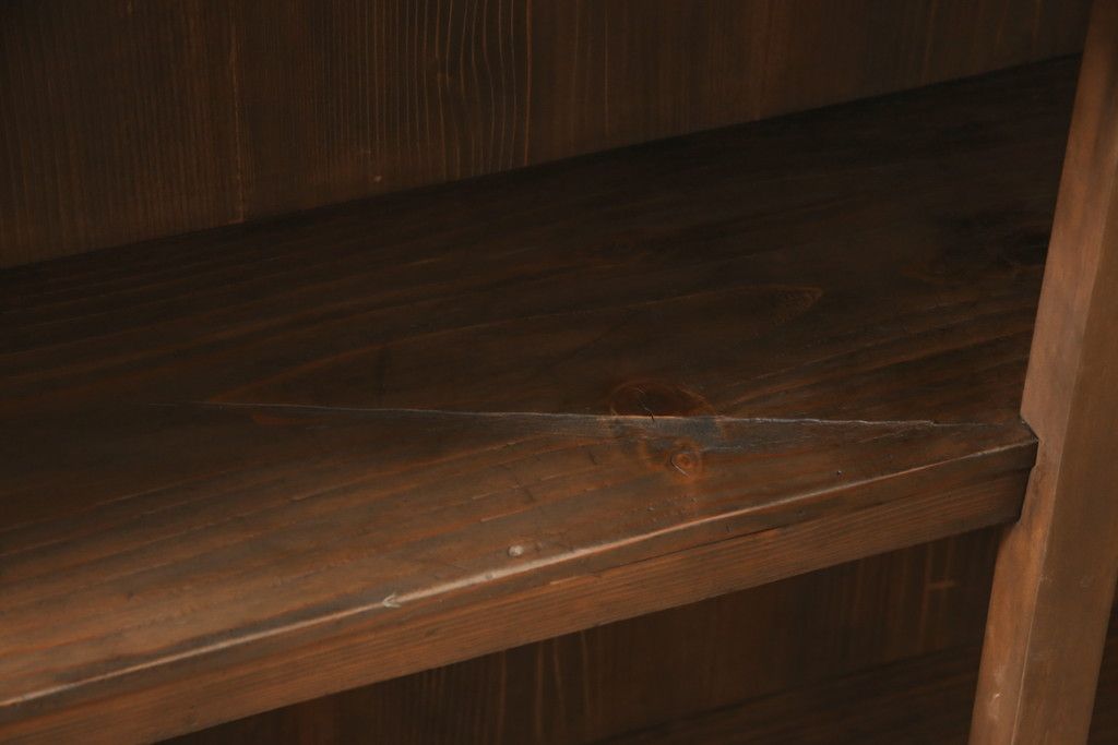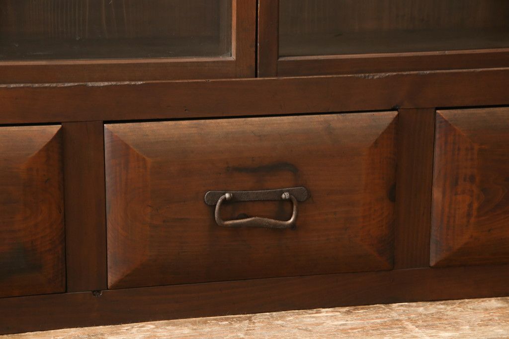 セミオーダー家具実績 > ガラス戸棚をリペア&カスタム!天板・背板を張り替え、染みや変色部分はバフ掛けを施し色合わせ。強度を持たせるため支柱を設置。本体は現状をベースに着色。(収納棚、サイドボード、キャビネット)