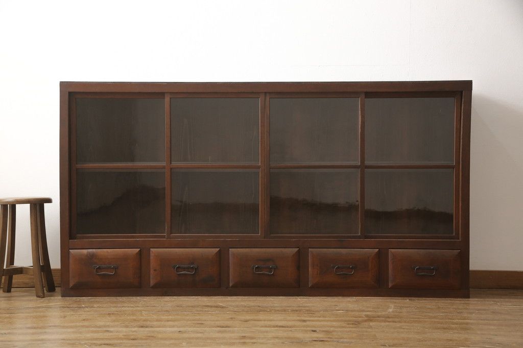 ガラス戸棚をリペア&カスタム!天板・背板を張り替え、染みや変色部分はバフ掛けを施し色合わせ。強度を持たせるため支柱を設置。本体は現状をベースに着色。(収納棚、サイドボード、キャビネット)