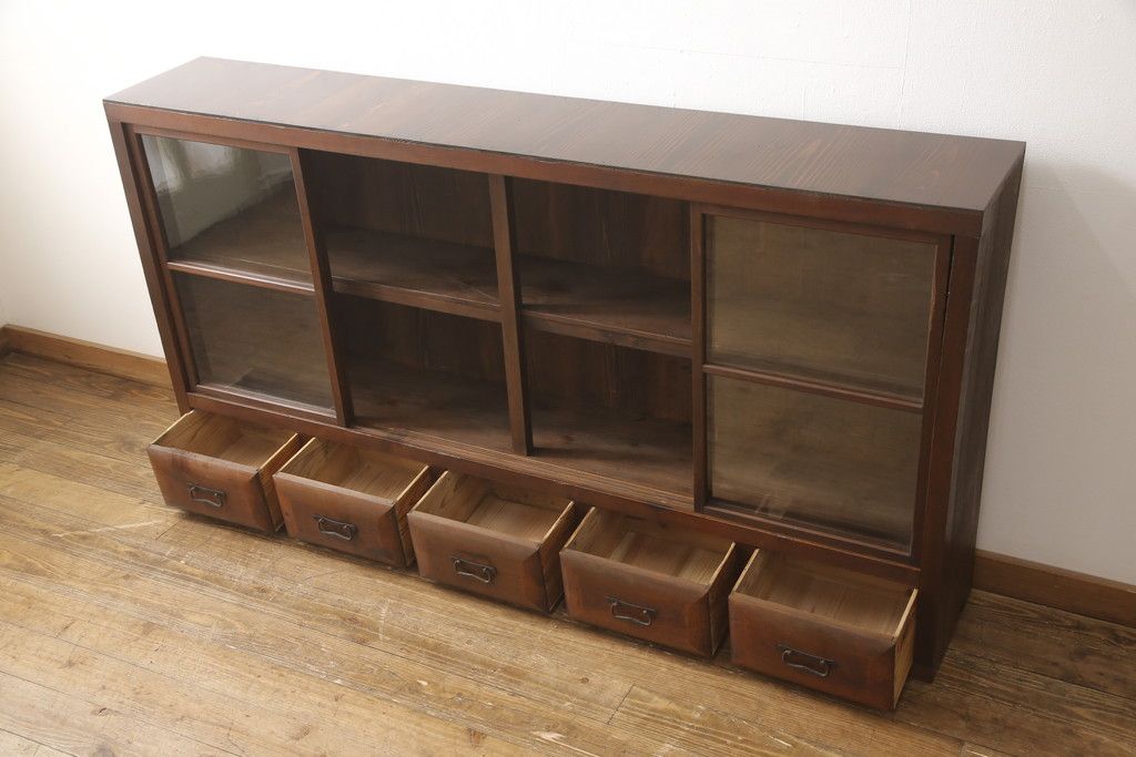 キャビネット・戸棚> サイドキャビネット > ガラス戸棚をリペア&カスタム!天板・背板を張り替え、染みや変色部分はバフ掛けを施し色合わせ。強度を持たせるため支柱を設置。本体は現状をベースに着色。(収納棚、サイドボード、キャビネット)