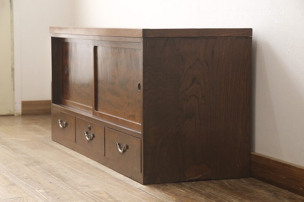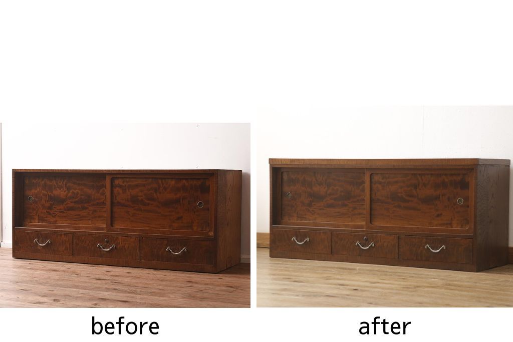 箪笥ローボードをリペア&カスタム!内部棚、左右の仕切りを外しあらたに棚板1枚製作。本体は現状をベースに着色。(戸棚、収納棚)