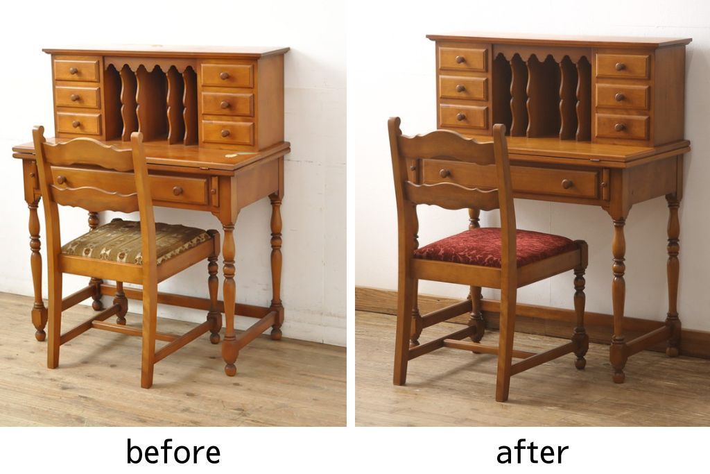ライティングデスク&チェアセットをリペア&カスタム!チェア座面はご希望の生地にて張り替え。本体は現状をベースに着色。(ワークデスク、机、椅子、在宅用、在宅ワーク用)