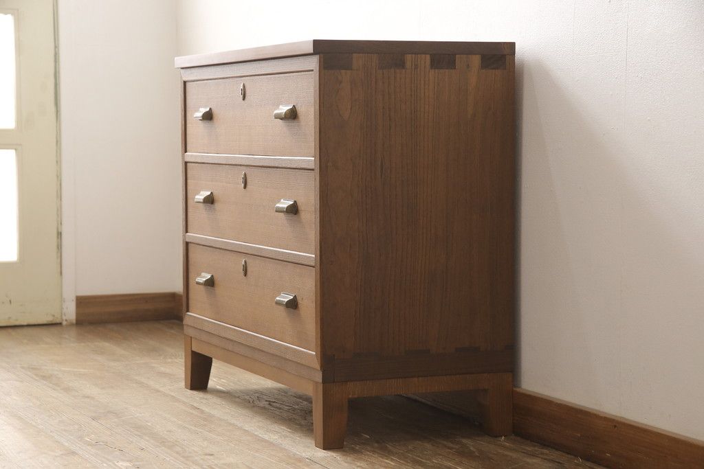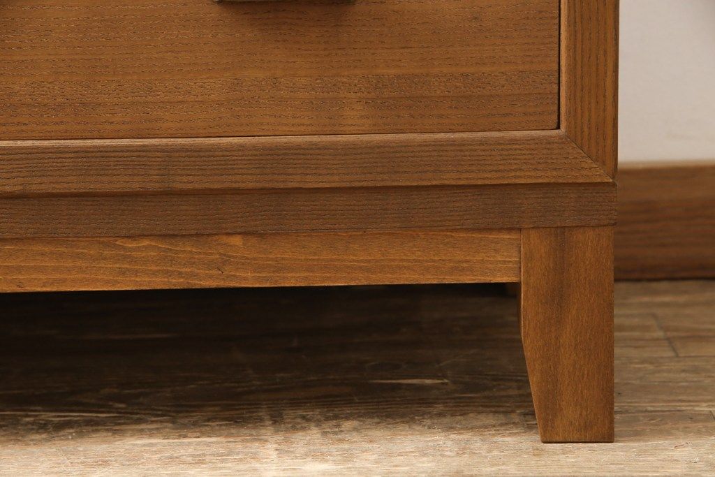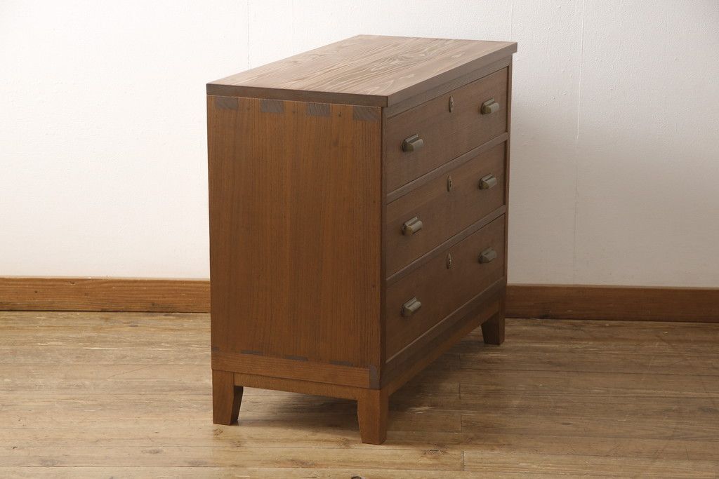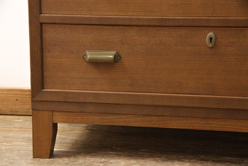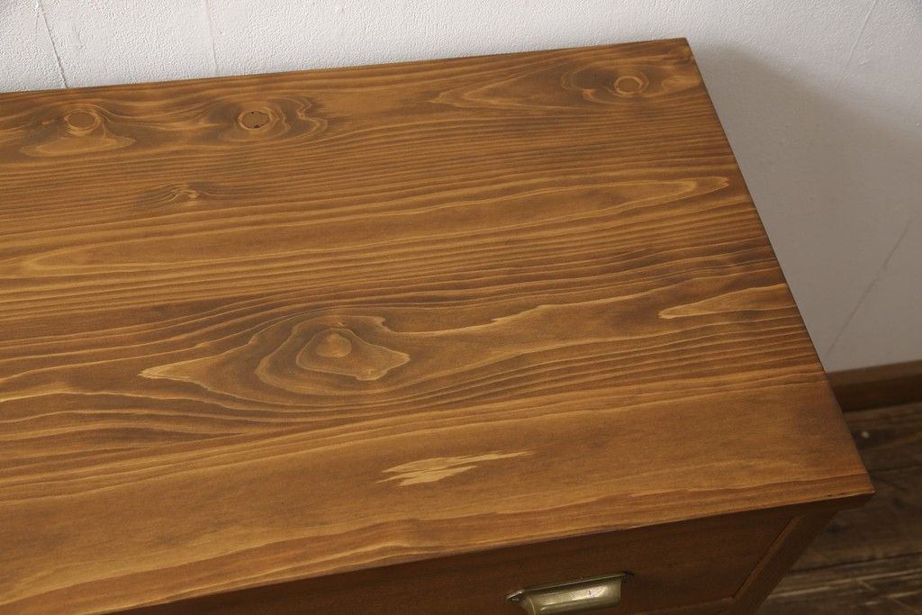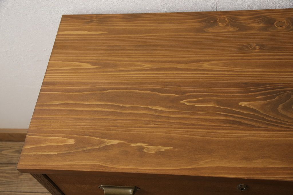 桐箪笥の下段を用いてチェストにリメイク!高品質リペアを施し、ご希望に合わせてリサイズ。天板と脚を取り付け、取っ手と鍵金具を交換。本体は当店商品を参考に着色。