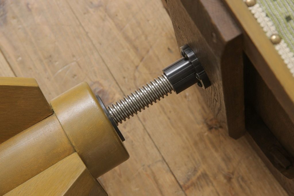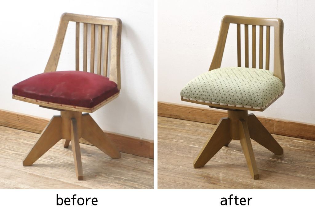 セミオーダー家具実績 > ドクターチェアをリペア&カスタム!お好みの生地に張り替え、雰囲気に合うように当店で選別した鋲とブレードを取付け。本体は現状をベースに1トーン程落ち着いた色味に着色。(回転椅子)