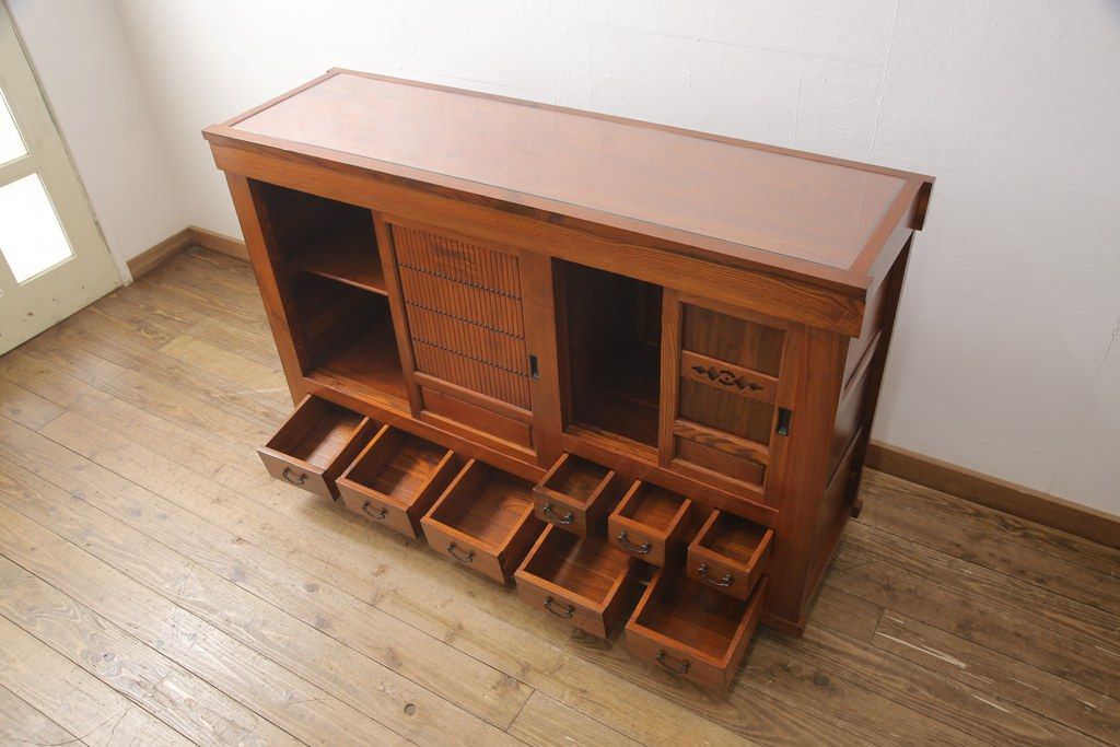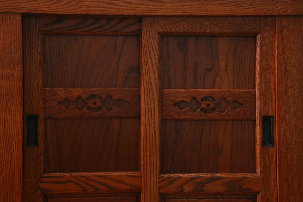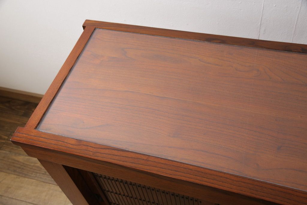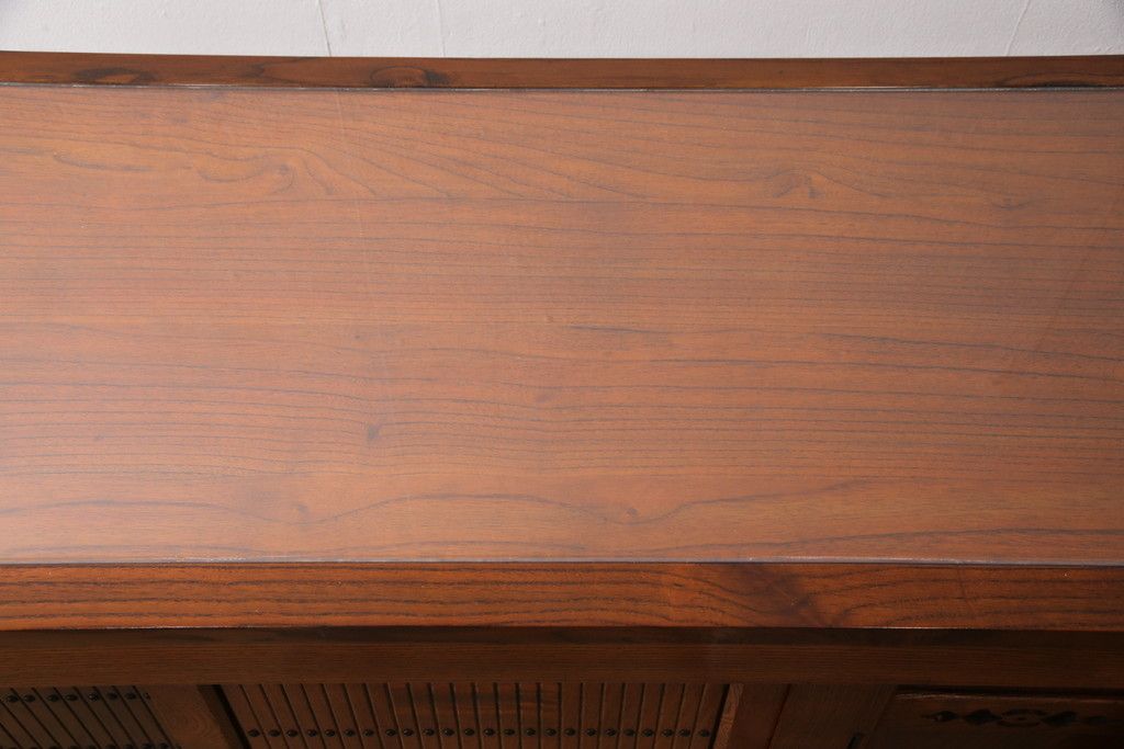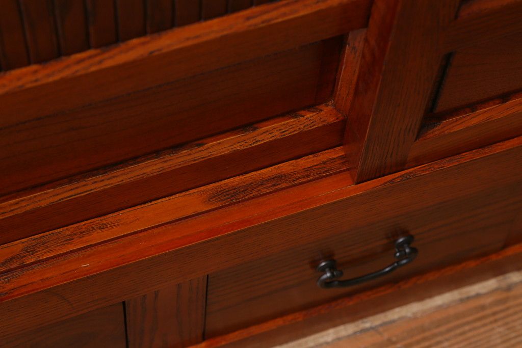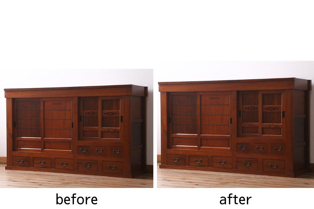 民芸家具 > 水屋箪笥サイドボードをリペア&カスタム!天板の溝に合わせガラスをはめ込み、本体とガラスの間の溝はコーキング加工。(収納棚、戸棚、テレビ台、キャビネット、食器棚)