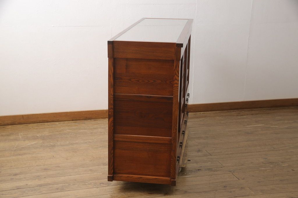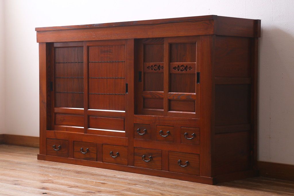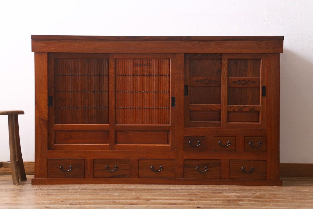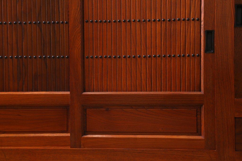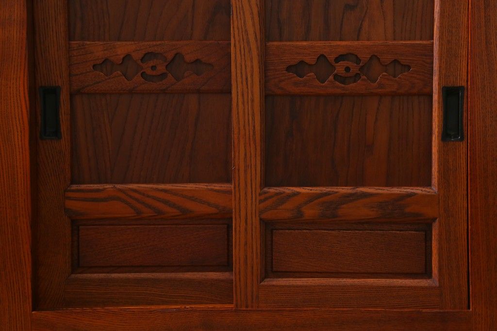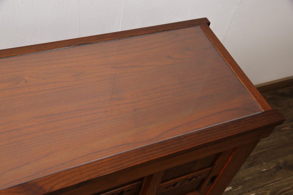 民芸家具 > 水屋箪笥サイドボードをリペア&カスタム!天板の溝に合わせガラスをはめ込み、本体とガラスの間の溝はコーキング加工。(収納棚、戸棚、テレビ台、キャビネット、食器棚)