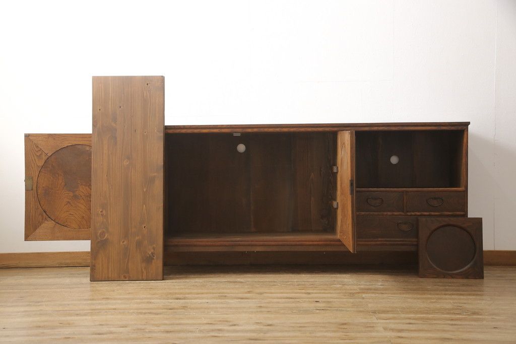 ラフジュ工房> セミオーダー家具実績 > サイドボードをリペア&カスタム!天板と脚を取り付け、衣装盆を可動式の棚板に変更。配線穴開け加工、棚底を補強。本体は現状をベース着色。(テレビ台、収納棚、戸棚)