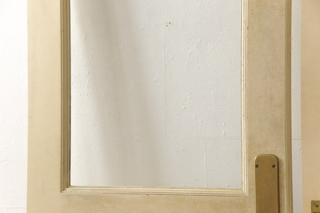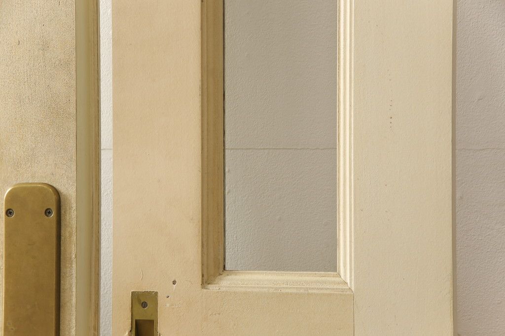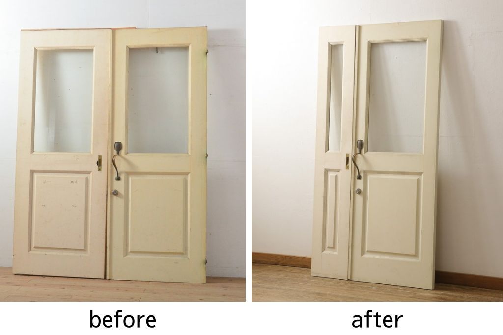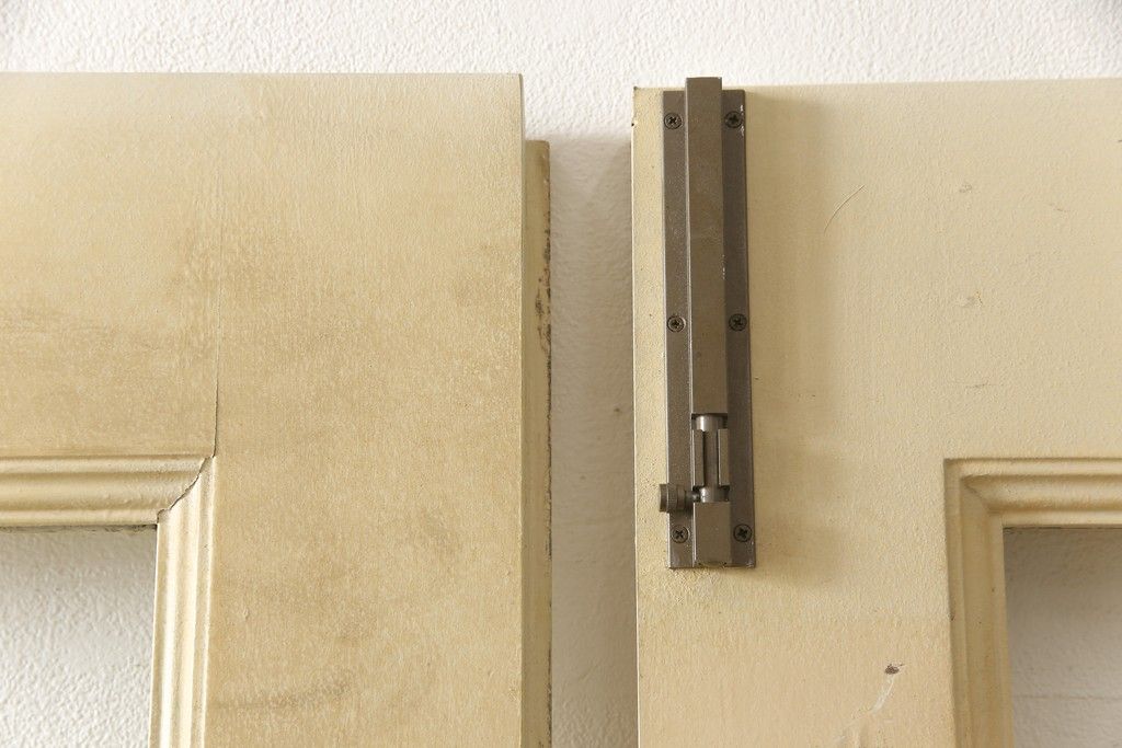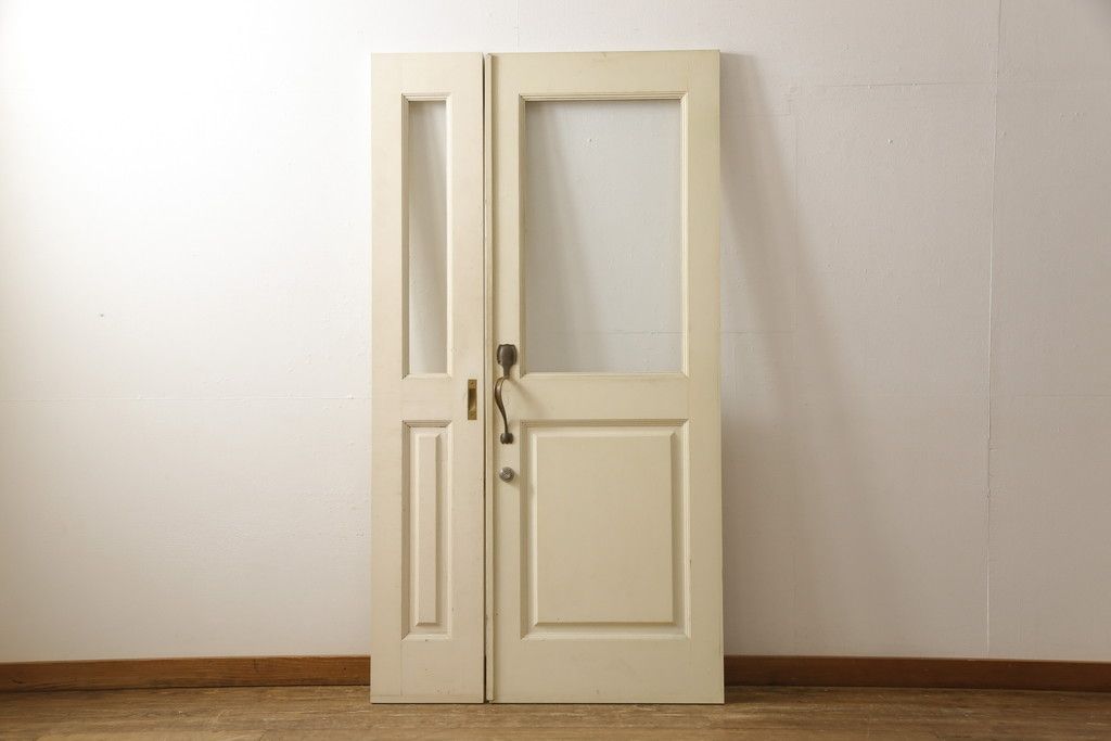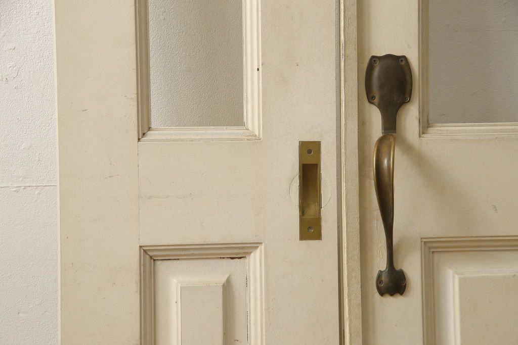 ドア・建具> ガラス戸 > 両開きドア1対をリペア&カスタム!高さと幅をリサイズし、引手周りの丸穴は埋め木処理。既存のペンキ塗装部分は清掃し、埋め木・付け足し箇所のみホワイト系で着色。(扉、玄関扉、ドア2枚セット)