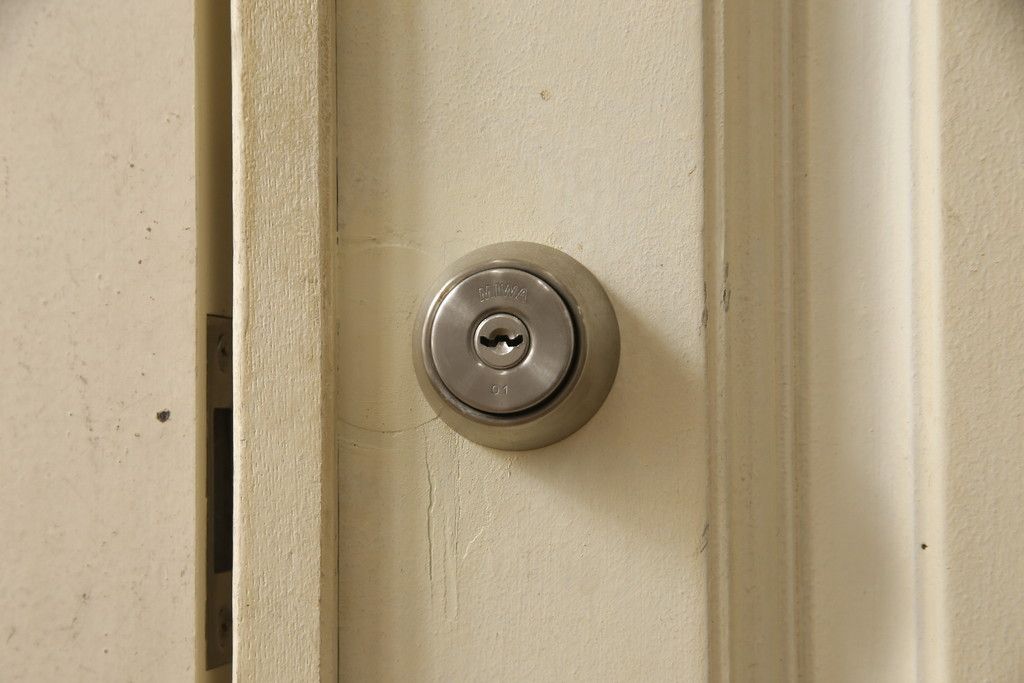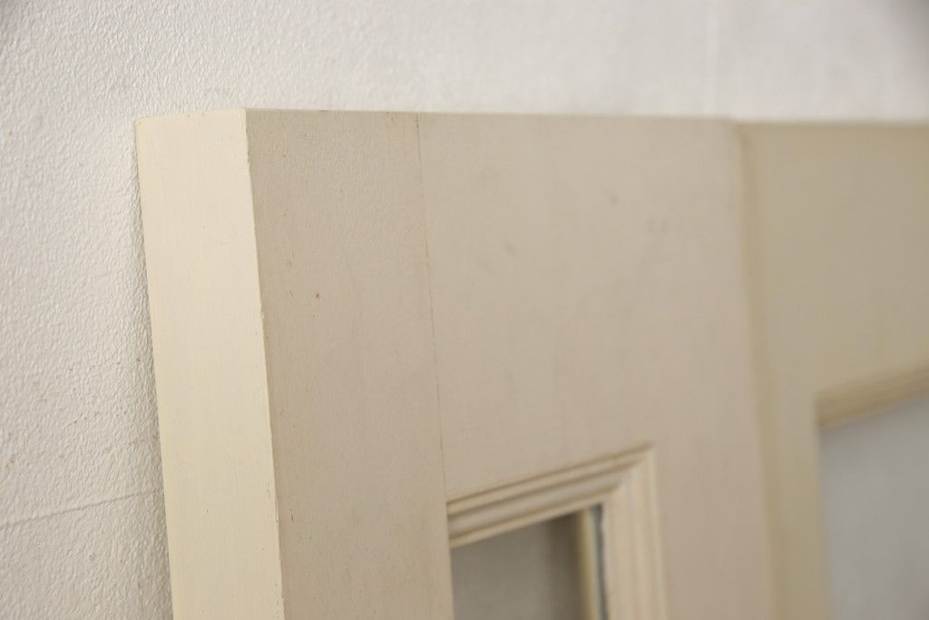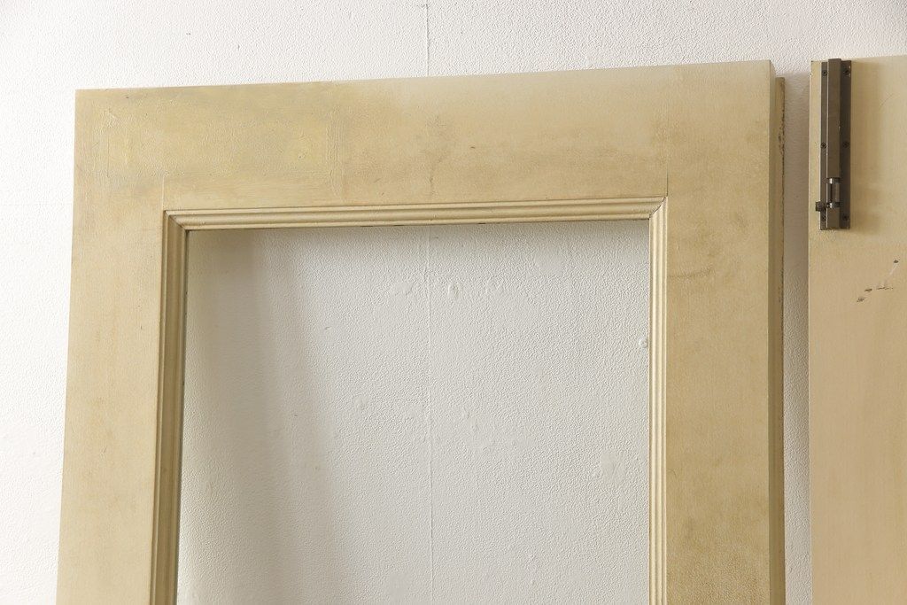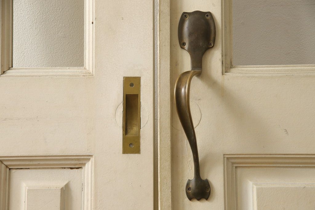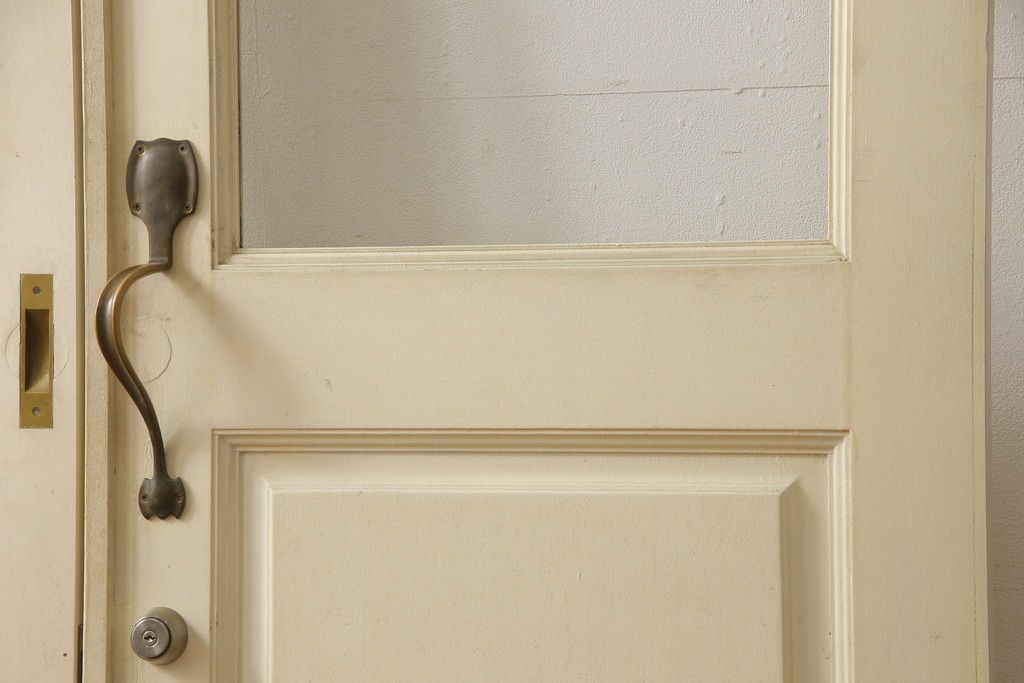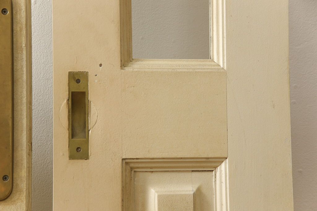 ドア・建具> ガラス戸 > 両開きドア1対をリペア&カスタム!高さと幅をリサイズし、引手周りの丸穴は埋め木処理。既存のペンキ塗装部分は清掃し、埋め木・付け足し箇所のみホワイト系で着色。(扉、玄関扉、ドア2枚セット)