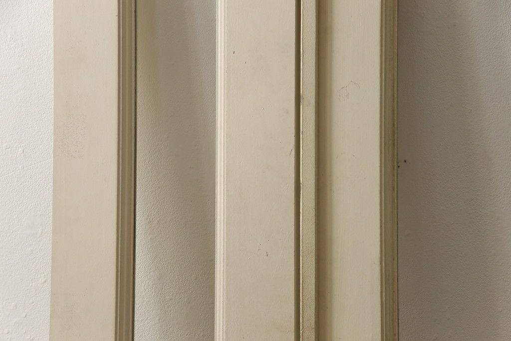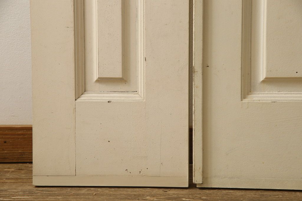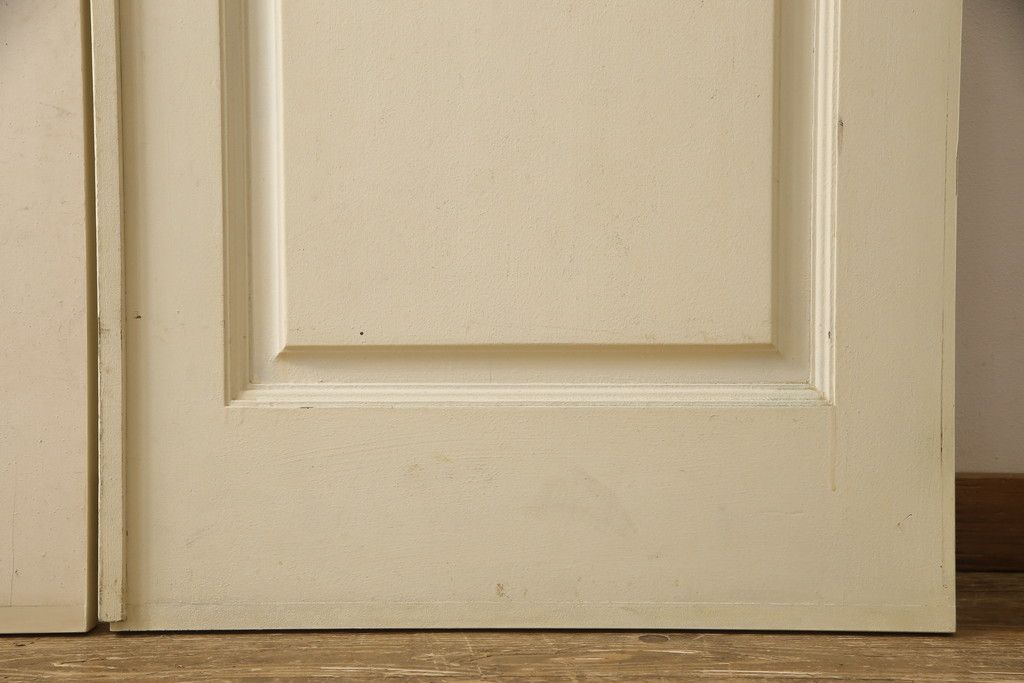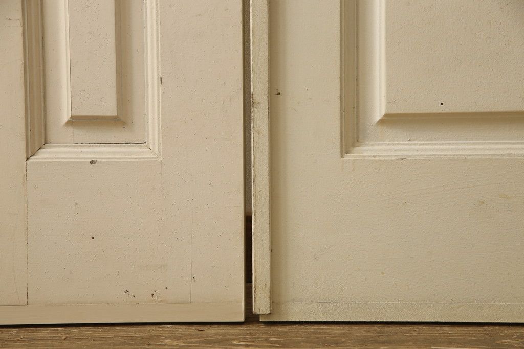 両開きドア1対をリペア&カスタム!高さと幅をリサイズし、引手周りの丸穴は埋め木処理。既存のペンキ塗装部分は清掃し、埋め木・付け足し箇所のみホワイト系で着色。(扉、玄関扉、ドア2枚セット)
