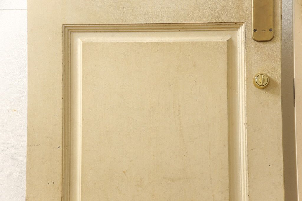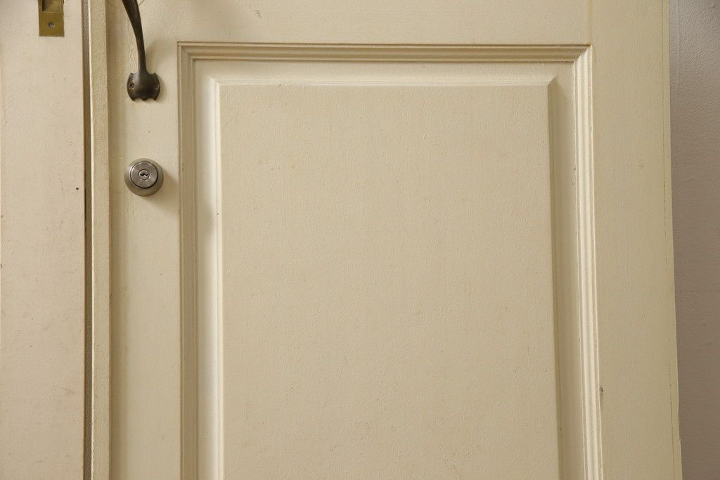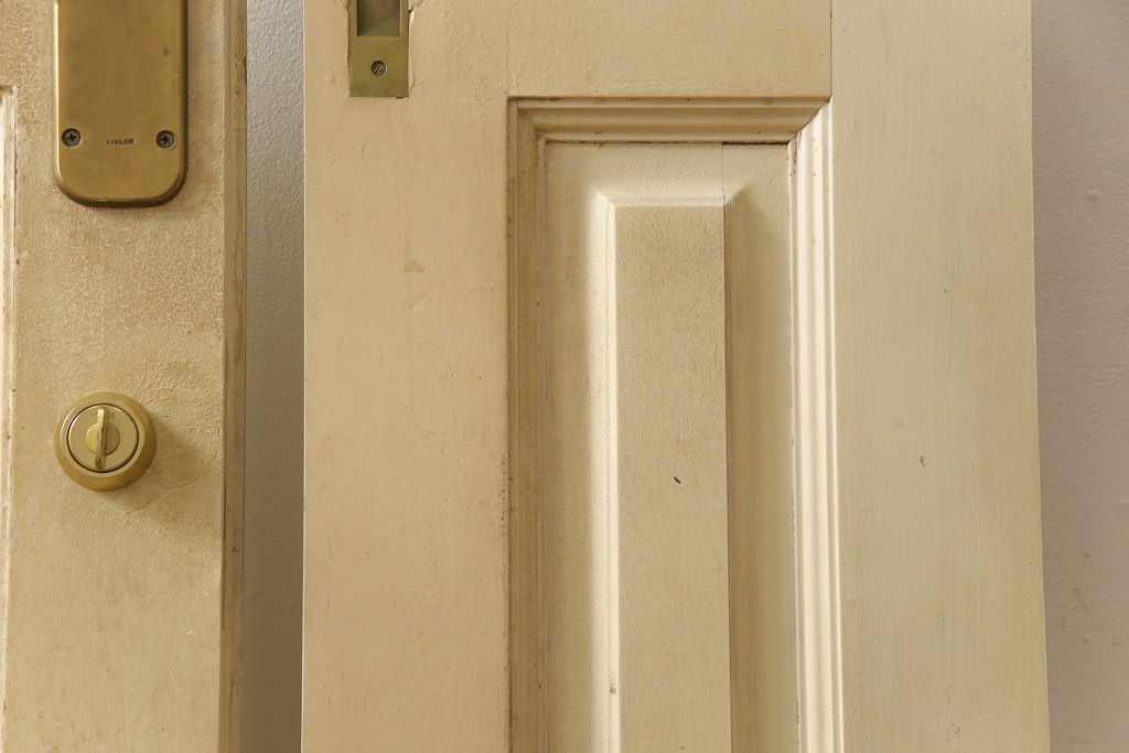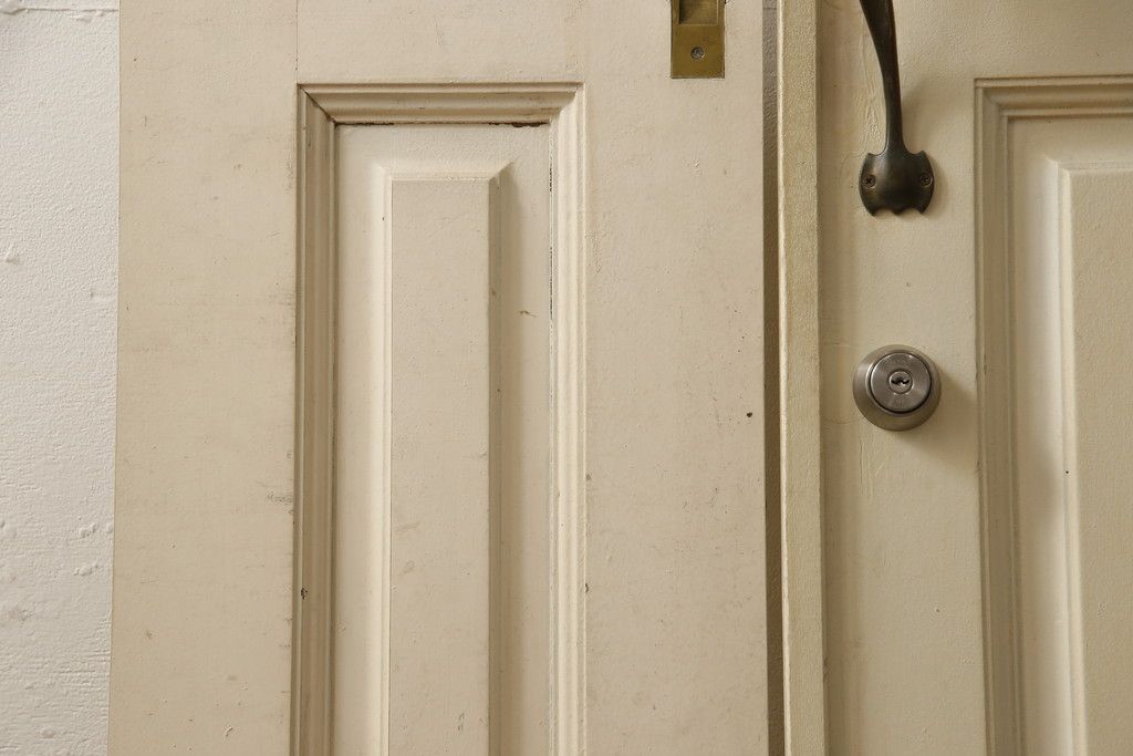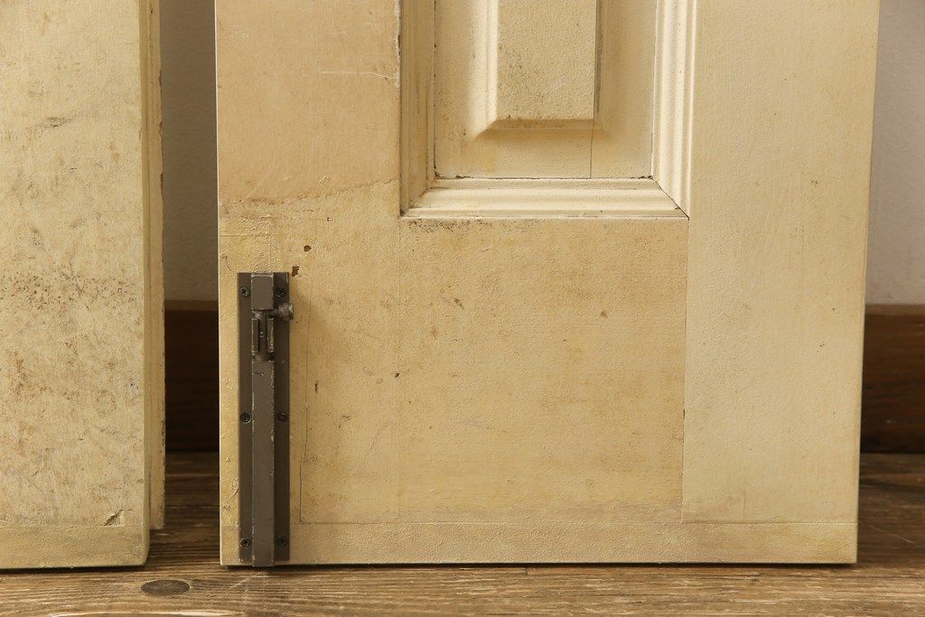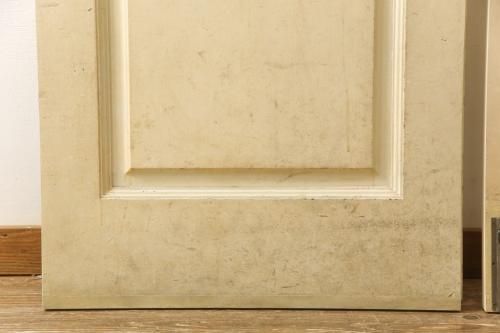 ドア・建具> 2枚・3枚セット > 両開きドア1対をリペア&カスタム!高さと幅をリサイズし、引手周りの丸穴は埋め木処理。既存のペンキ塗装部分は清掃し、埋め木・付け足し箇所のみホワイト系で着色。(扉、玄関扉、ドア2枚セット)
