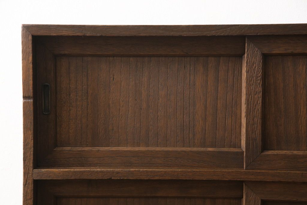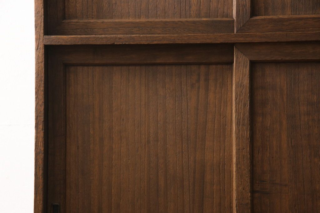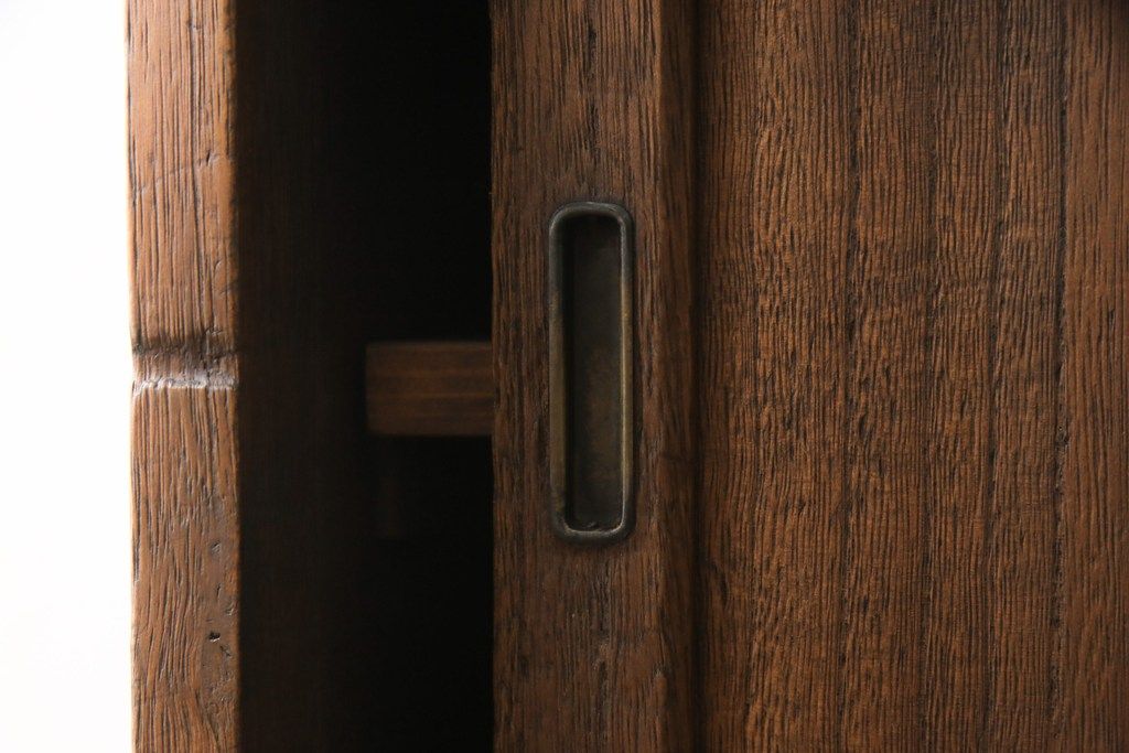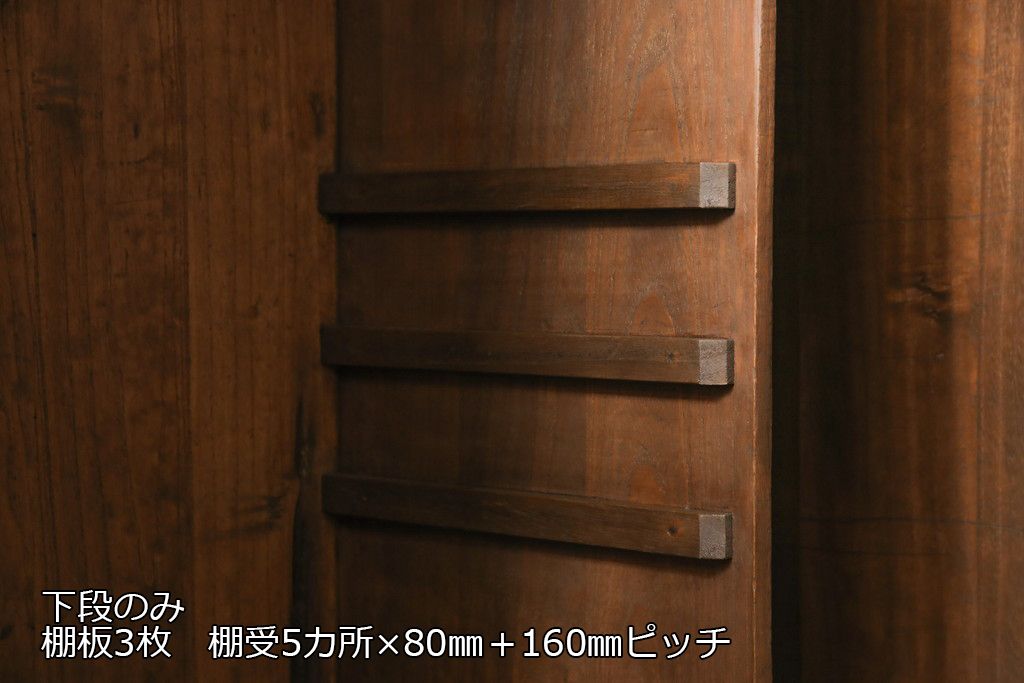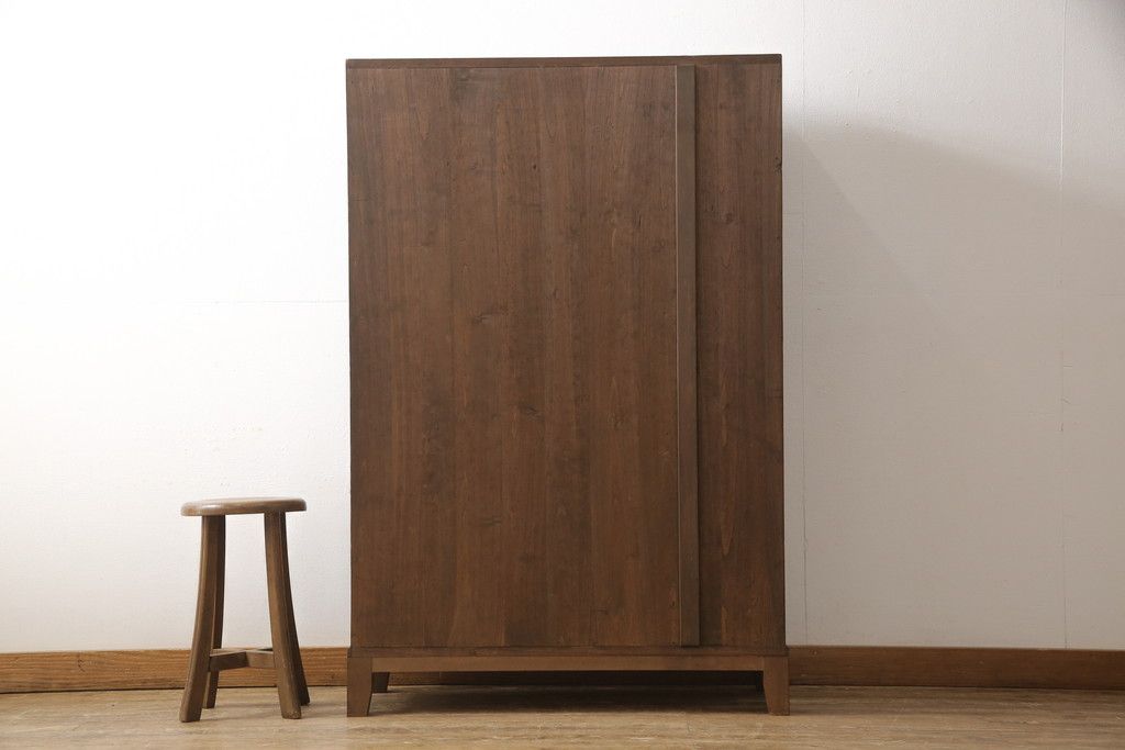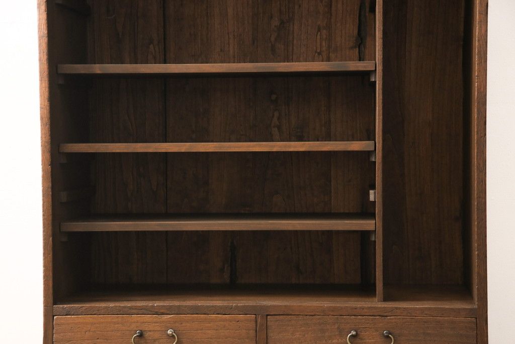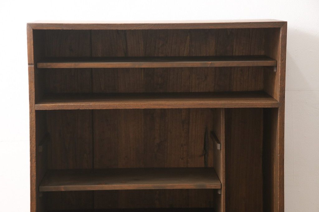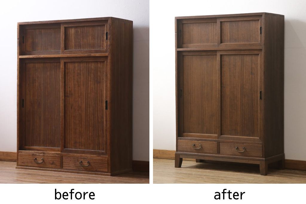 戸棚をリペア&カスタム!棚板を製作して差し替え。棚内部は5分割になるよう棚受けを配置。木製角脚を取付け、色味は当店商品を参考に着色。(収納棚、キャビネット)