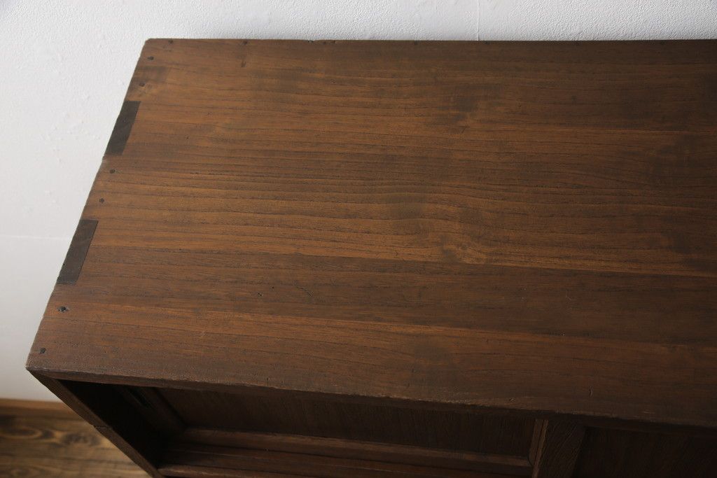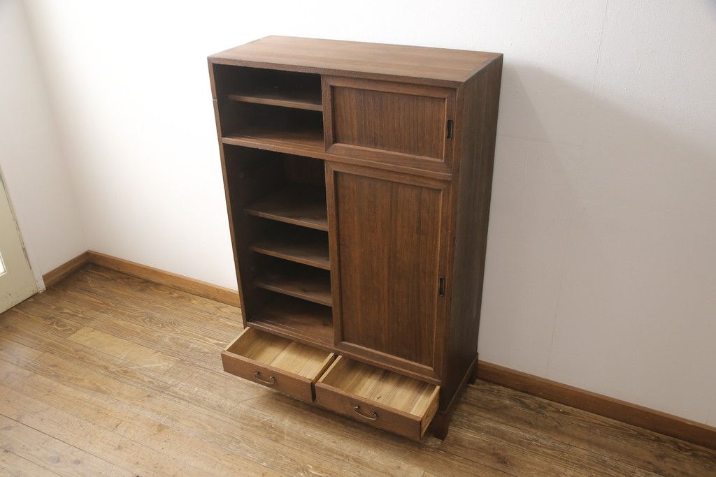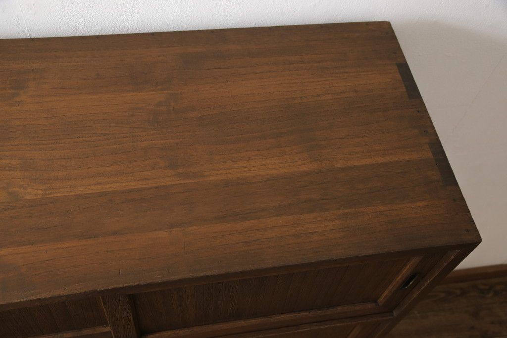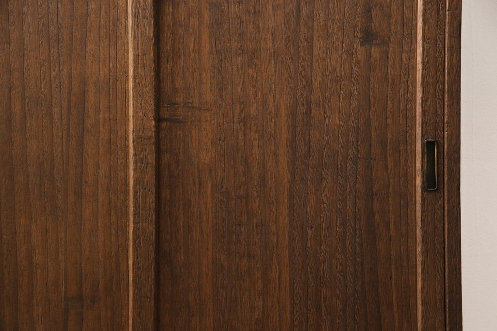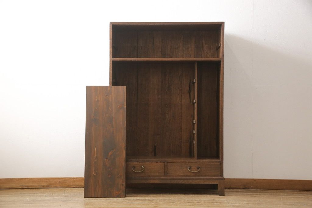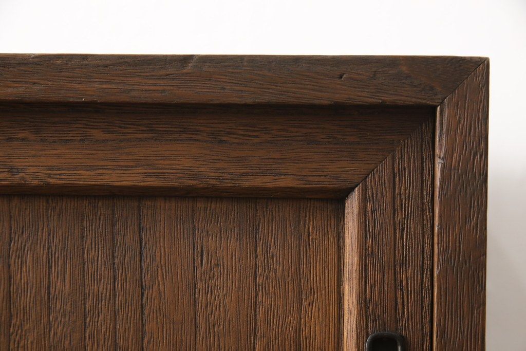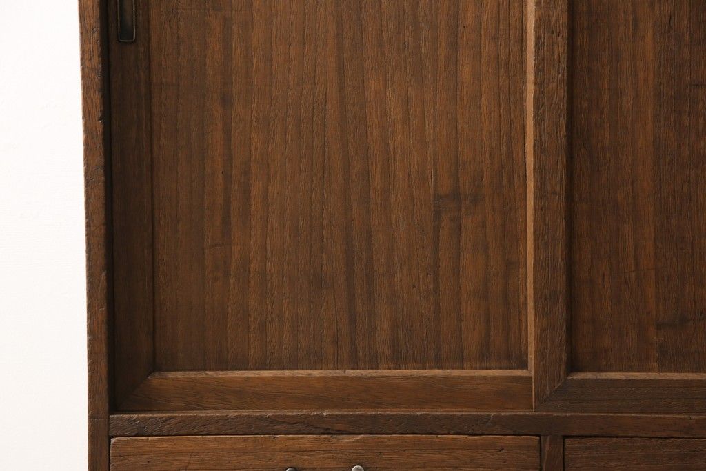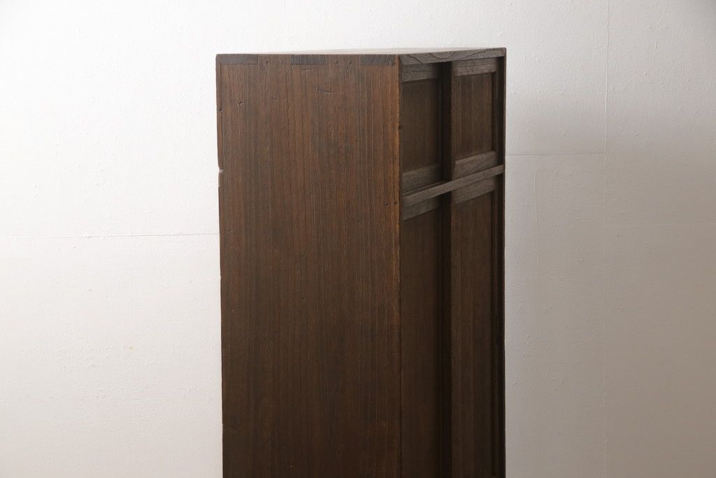 戸棚をリペア&カスタム!棚板を製作して差し替え。棚内部は5分割になるよう棚受けを配置。木製角脚を取付け、色味は当店商品を参考に着色。(収納棚、キャビネット)