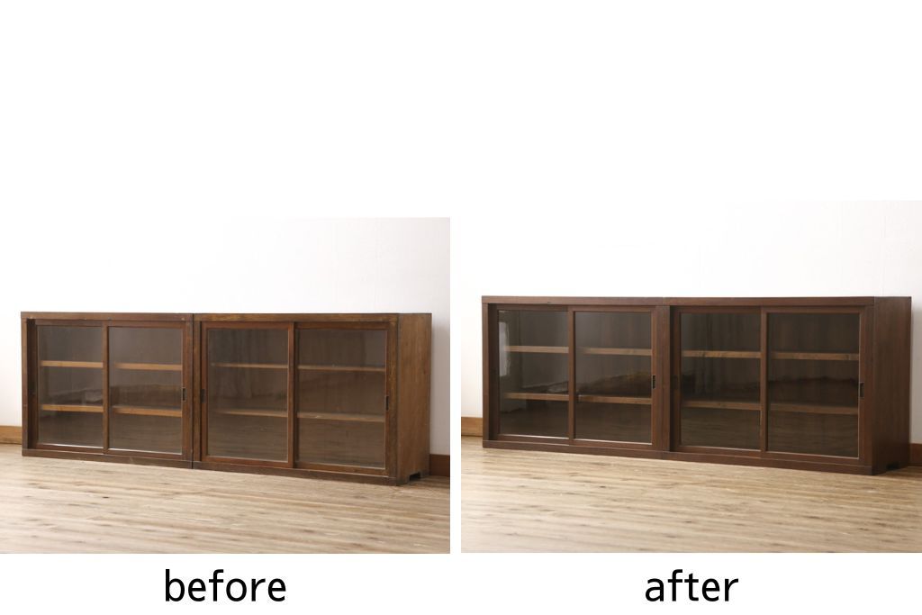 セミオーダー家具実績 > 収納棚の見た目を変えずに綺麗にリペア!修繕箇所は本体と馴染ませ、本体は現状をベースにして1トーン程落ち着いた色味に着色。(キャビネット、食器棚、戸棚、本箱、サイドボード)