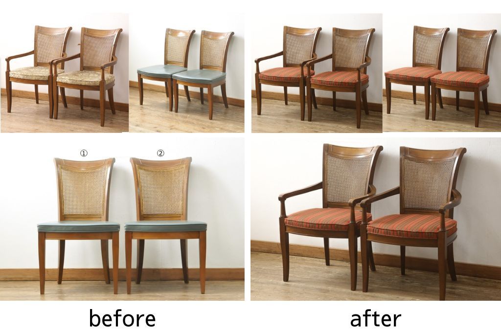 セミオーダー家具実績 > ダイニングチェア6脚セットをリペア&カスタム!座面をご希望の生地に張り替え。同生地・同系色の生地にてパイピングを取付け。(イス、椅子、アームチェア)