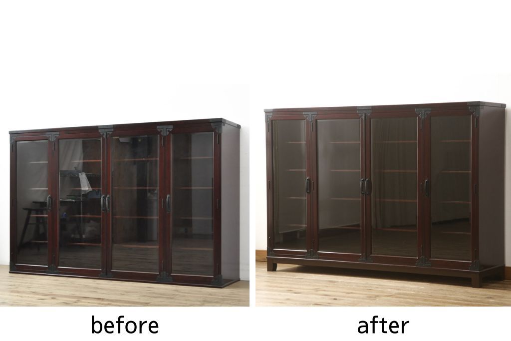 セミオーダー家具実績 > 水屋箪笥キャビネットをリペア&カスタム!希望の高さにカットした脚を取り付け。新材使用の脚はリペア後の本体に合わせて着色。(食器棚、戸棚、収納棚、飾り棚)
