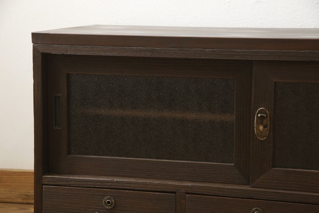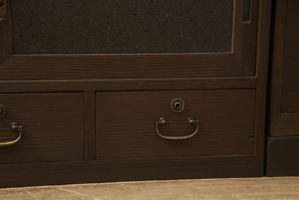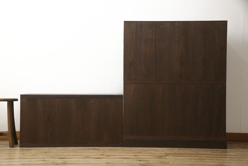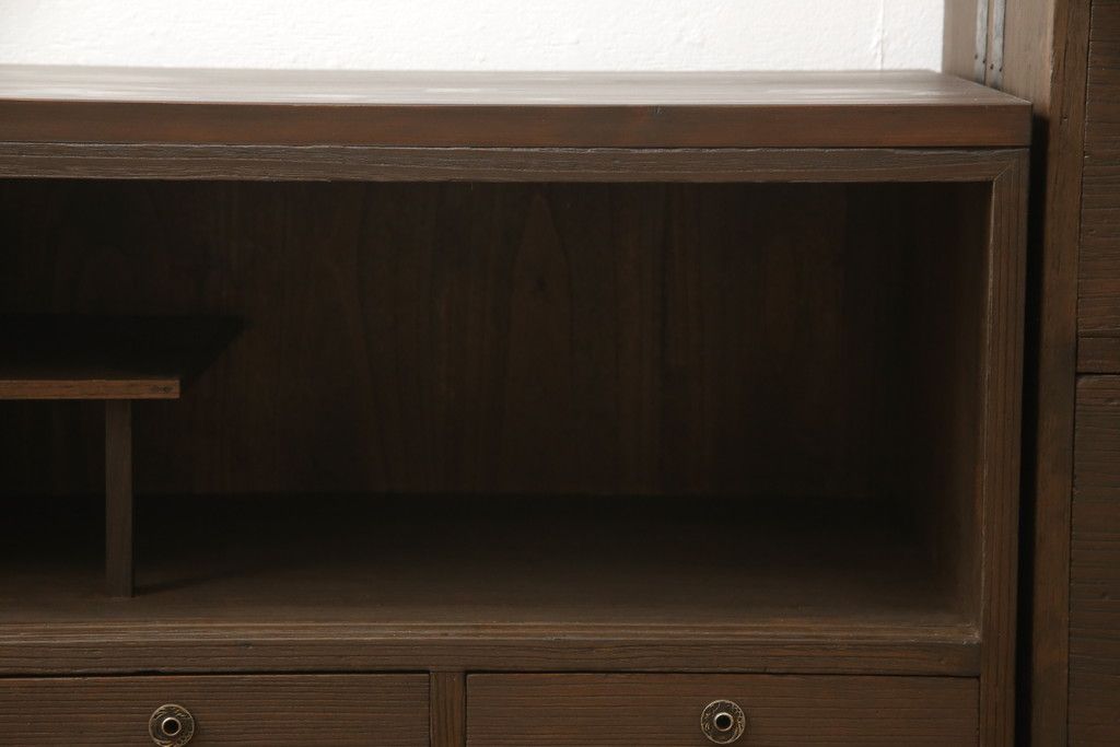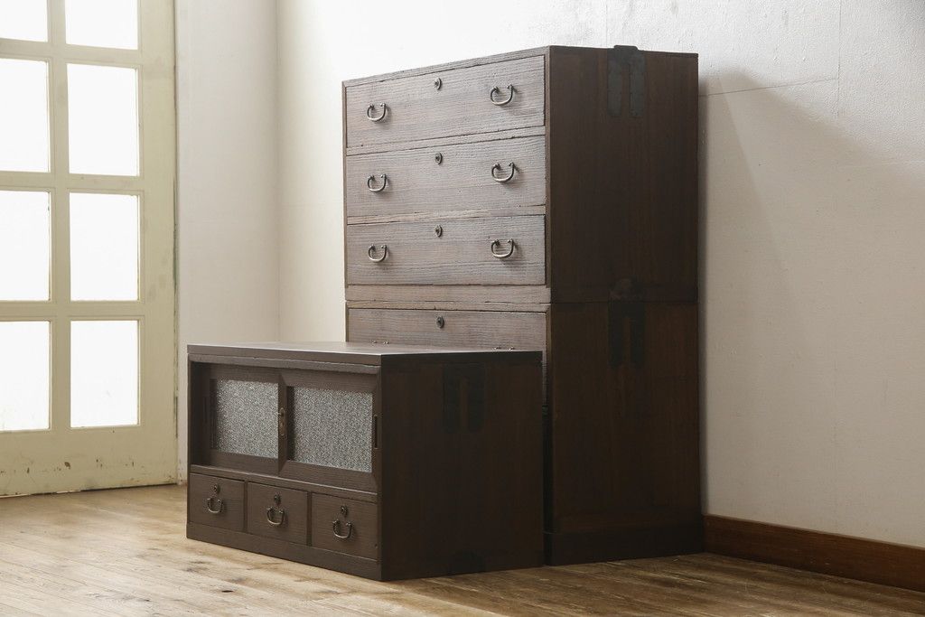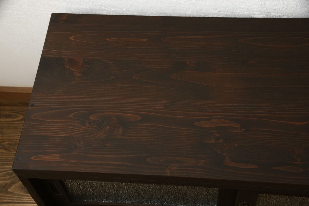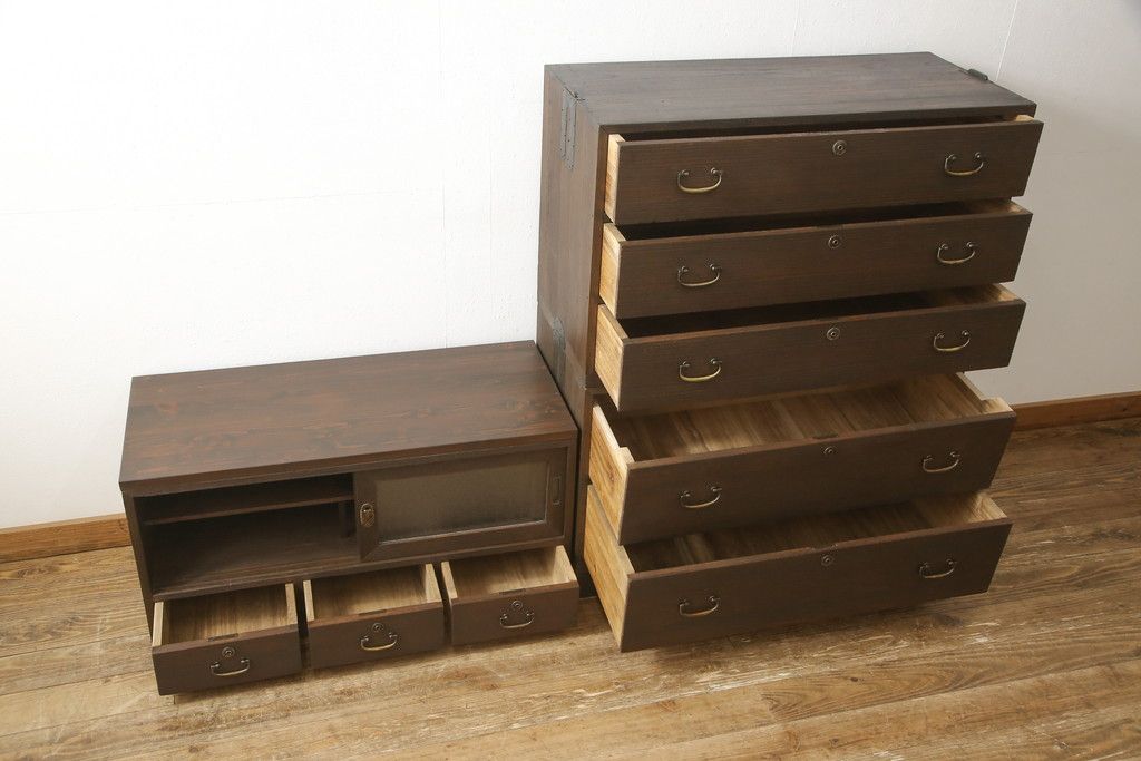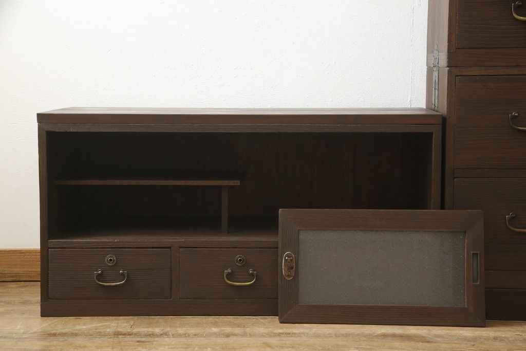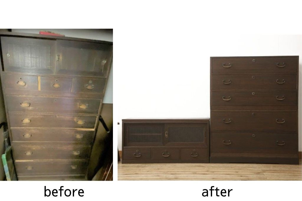桐箪笥をテレビボードとチェストにリメイク!上段は天板を取り付け、ダイヤガラスをはめ込み、ガラス戸に変更。中段・下段は内側から天板補強。どちらも現状をベースに1トーン程落ち着いた色味に着色仕上げ。